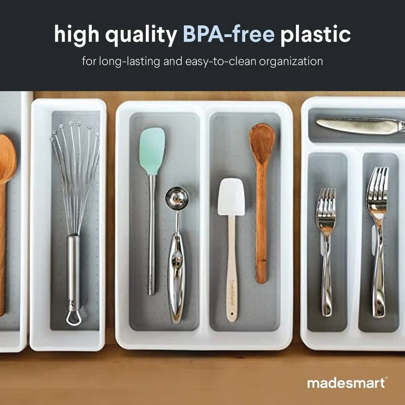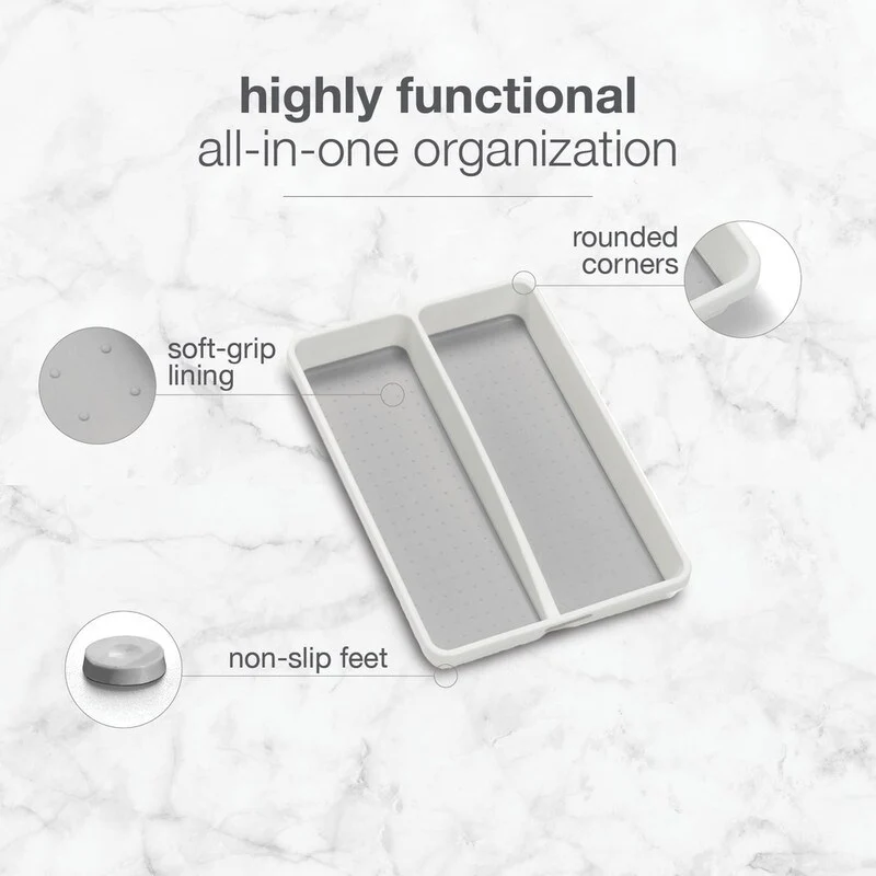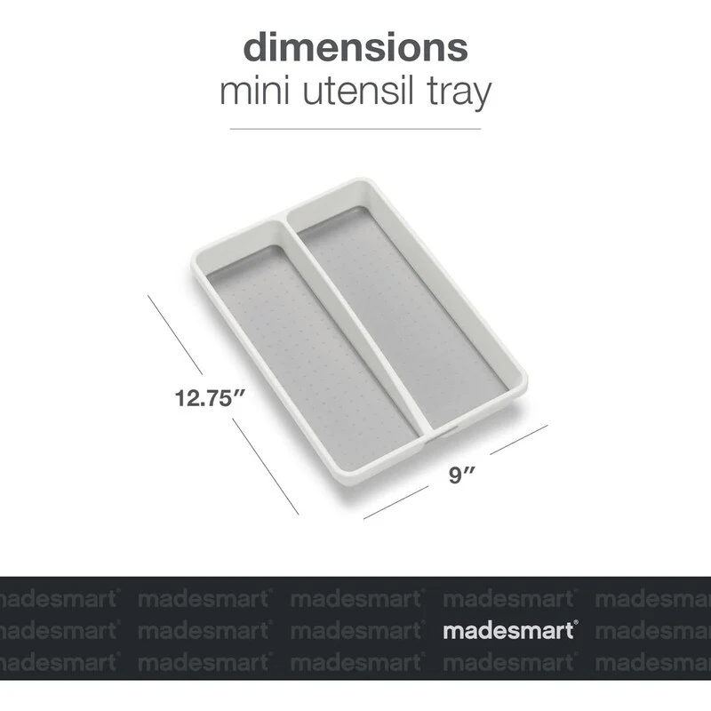 Maximize the space in your kitchen with the Madesmart Mini Utensil Tray. Simple and convenient, this utensil tray is designed with two spacious compartments to offer a practical solution for various utensil organization in kitchen drawers, keeping items easy to view and access. In addition to kitchen use, the multipurpose organizer can also be used to store makeup and bathroom products, school or office supplies, crafts, small tools and gadgets, and other miscellaneous objects throughout your home. The soft-grip surface lining and sturdy nonslip rubber feet keep your items neatly in place while ensuring that the organizer won't move around as you open and close the drawer. Ergonomic and durable, the tray features rounded corners to allow for easy use and make cleaning a breeze, and it's made from high-quality BPA-free plastic to provide years of quality use. The compact utensil organizer measures 12.75' x 9' x 1.88' in (32.39 cm. x 22.86 cm. x 7.76 cm.), making it perfect for apartments with smaller drawers while still offering plenty of space for utensils.