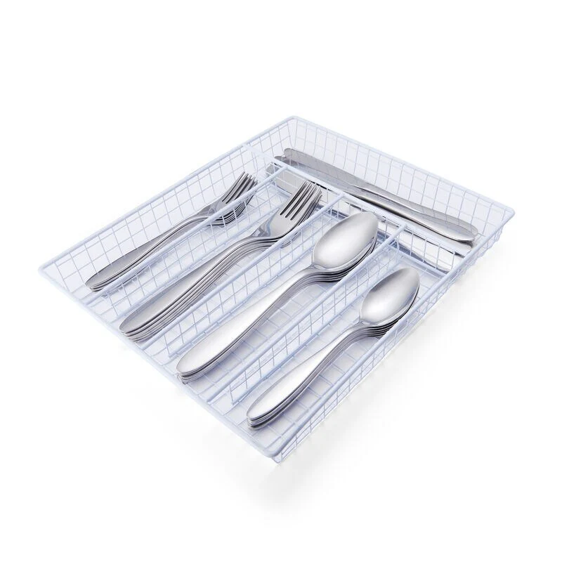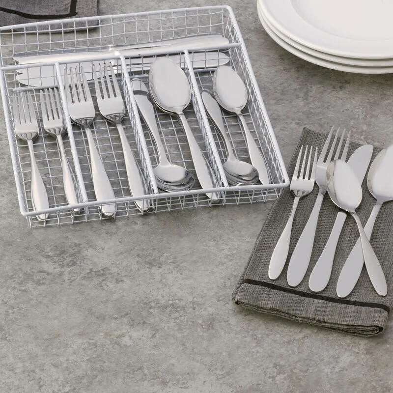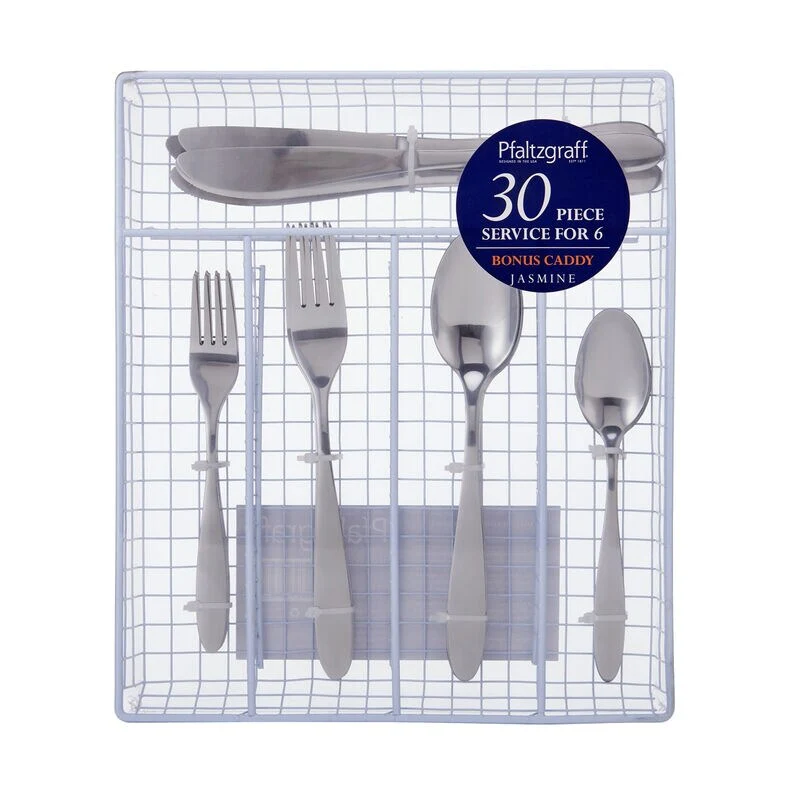 This Pfaltzgraff Jasmine Flatware Set With Caddy features a simple, classic, teardrop-shaped handle that will compliment both formal and casual dining. Quality crafted of 18/0 stainless steel, this set will stand up to the rigors of everyday use. 30 piece flatware set, service for six, includes (6) each: dinner fork, salad fork, dinner knife, dinner spoon and teaspoon, plus a caddy to keep it all neat and organized. Dishwasher safe.