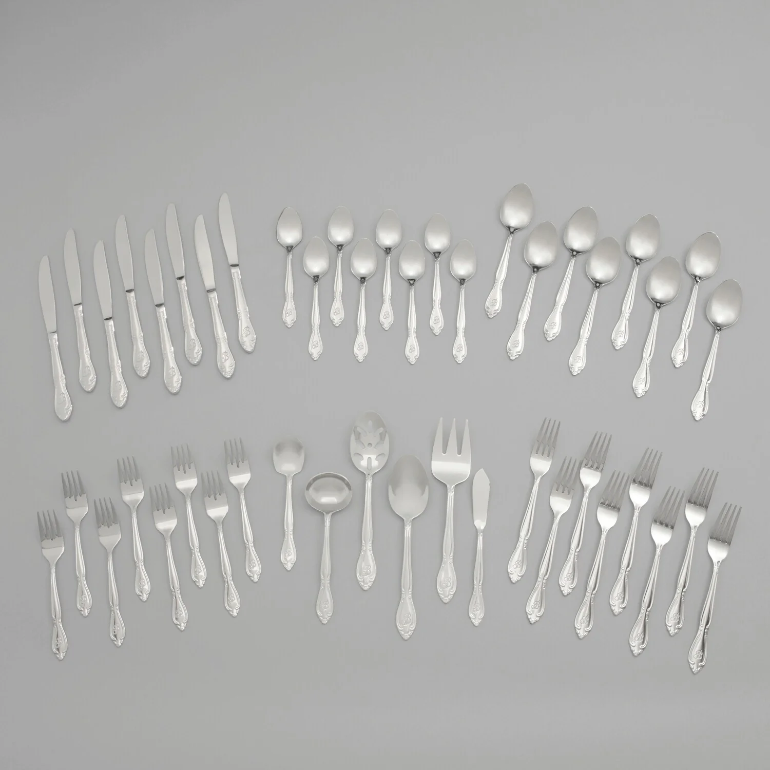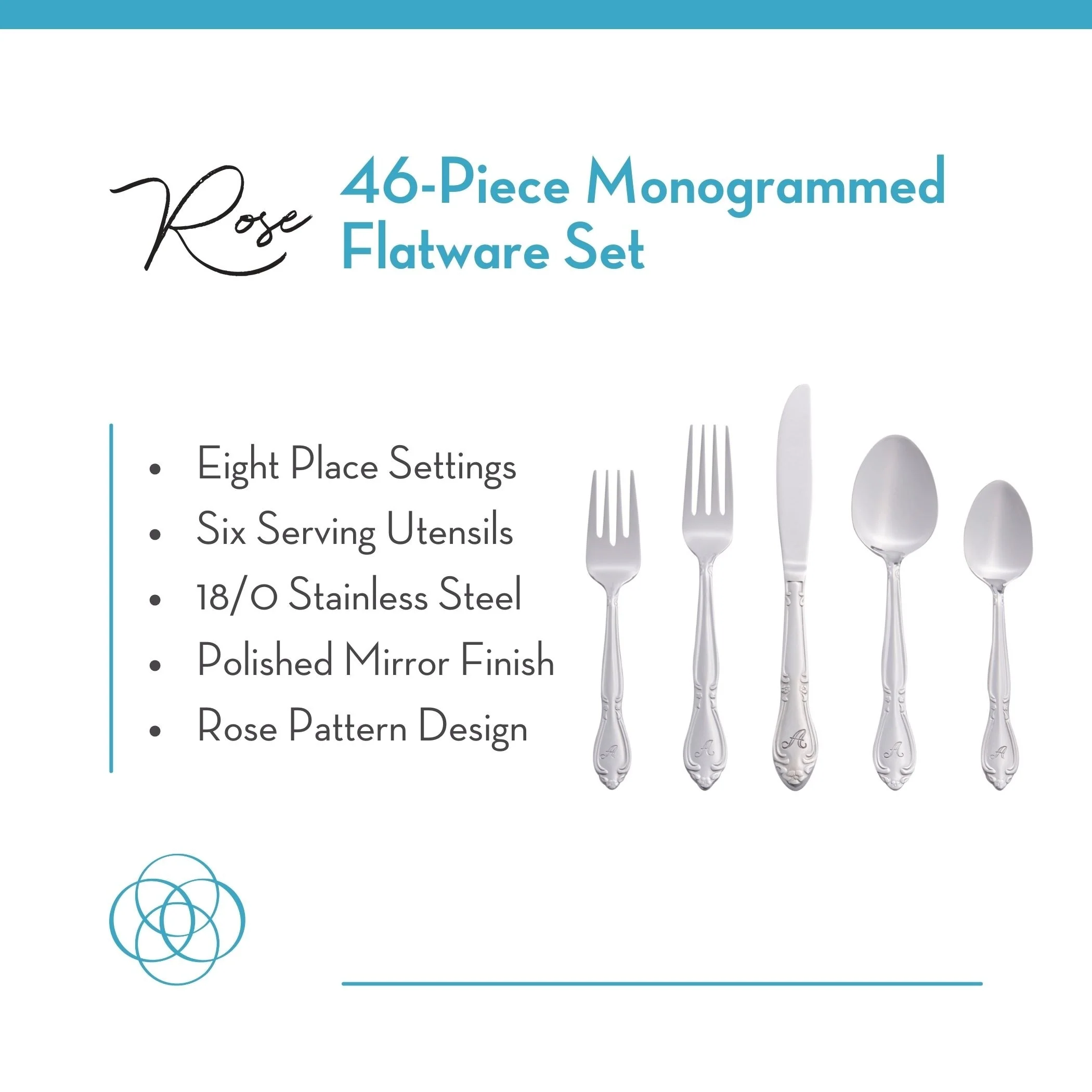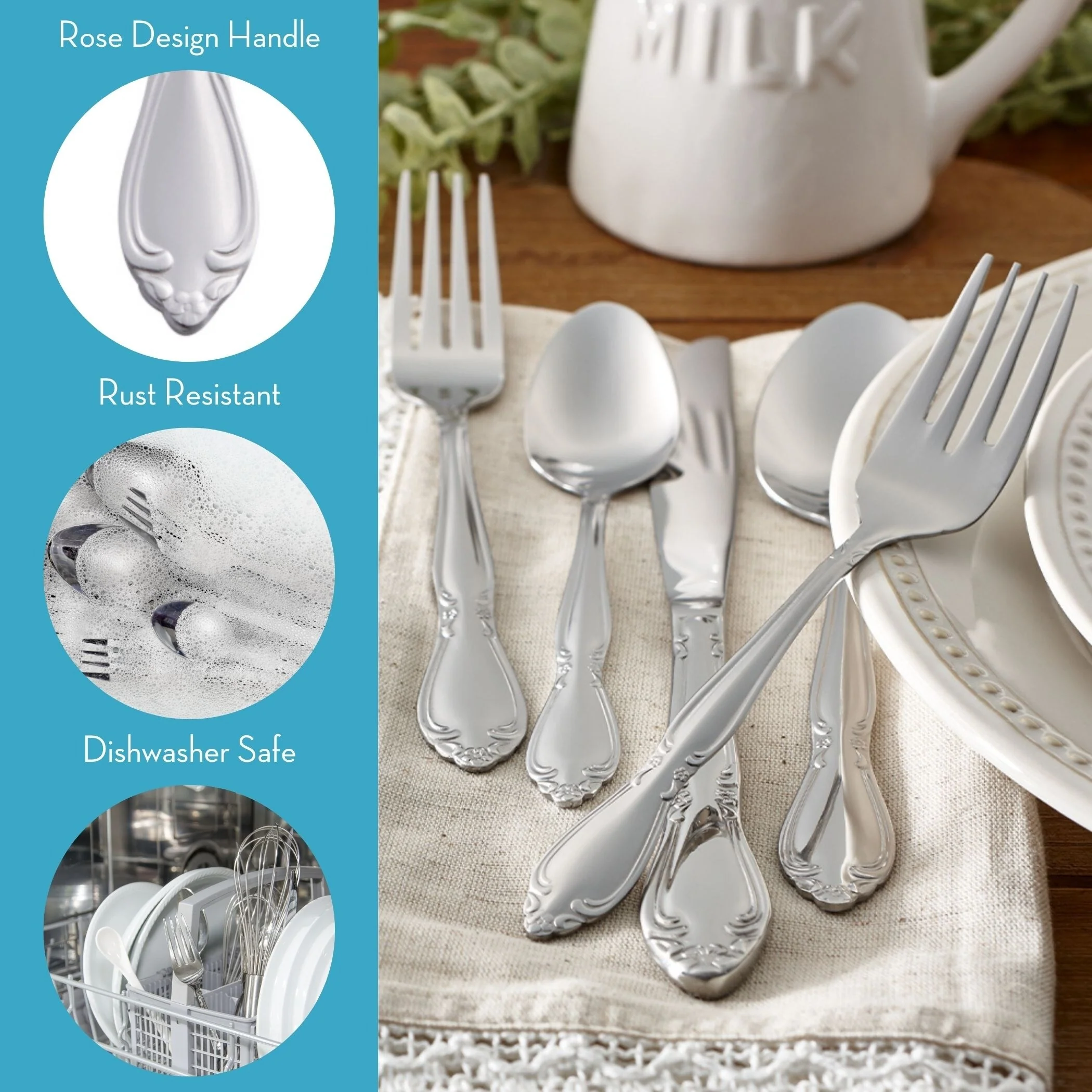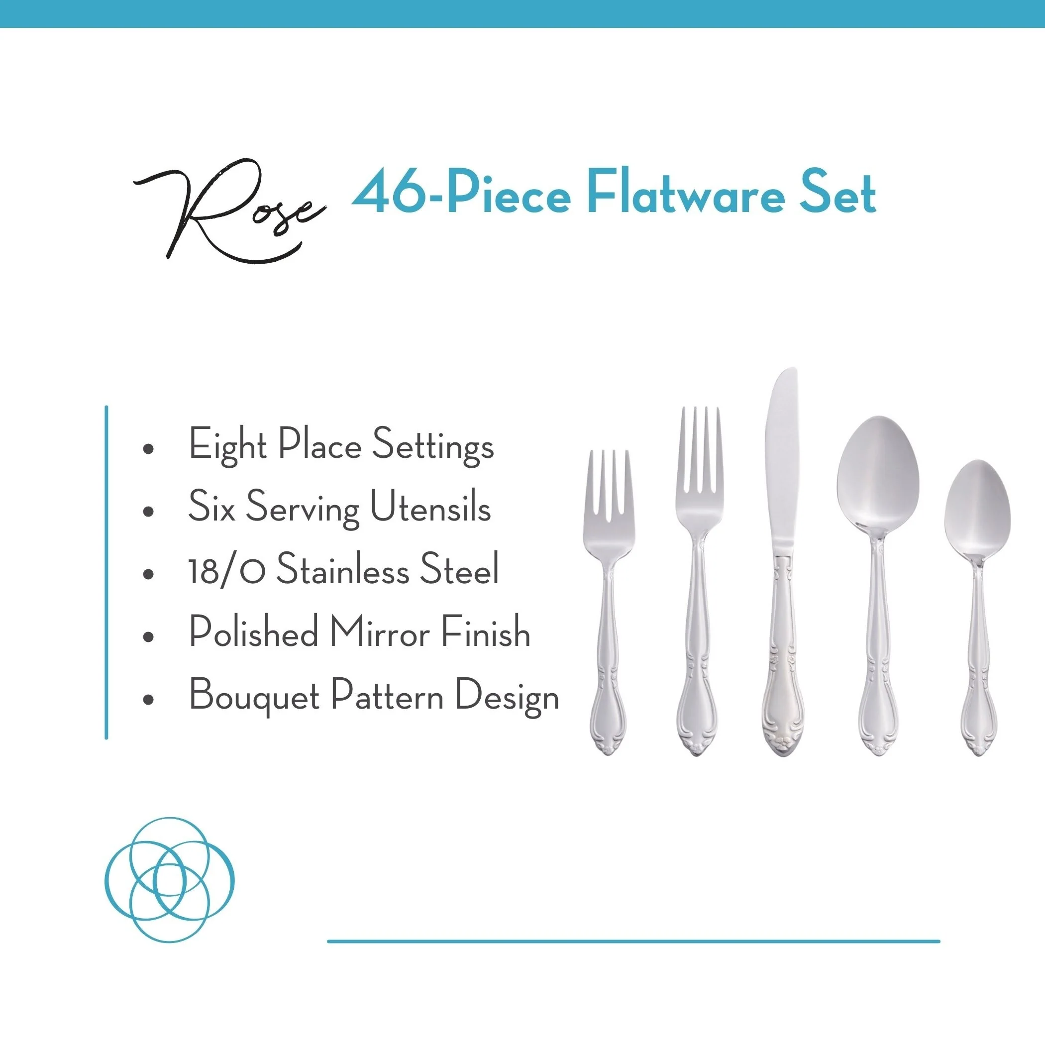 This RiverRidge Rose 46-piece flatware set brings elegance to your table. The traditional shape and rose blossom design complement any setting. This comprehensive set includes 8 place settings and 6 serving pieces, so you're prepared for family meals and gatherings. The set includes 8 of each dinner forks, spoons, salad forks, teaspoons, and knives, plus a one serving spoon, slotted spoon, gravy ladle, serving fork, butter knife, and sugar spoon. Crafted from heavy gauge 18/0 stainless steel with a polished mirror finish, our flatware is both stylish and durable. Suitable for daily use and special occasions, it's dishwasher-safe for easy cleaning. Our Rose Flatware Set offers versatility for all your dining needs. Combines durability with elegance. Crafted from heavy gauge stainless steel, each piece features a polished mirror finish that resists tarnishing. The traditional shape and delicate rose blossom design create a timeless look that suits various table settings. Ideal for both everyday use and special occasions, our flatware set is a versatile choice for newlyweds or new homeowners.