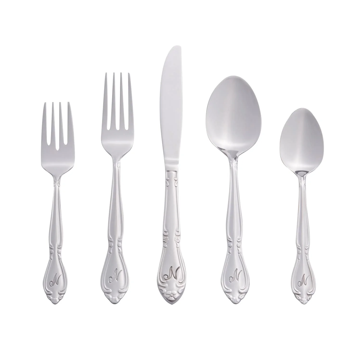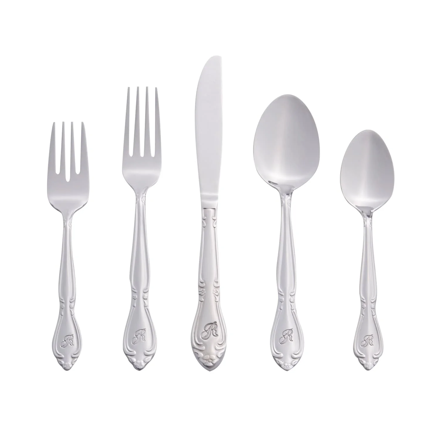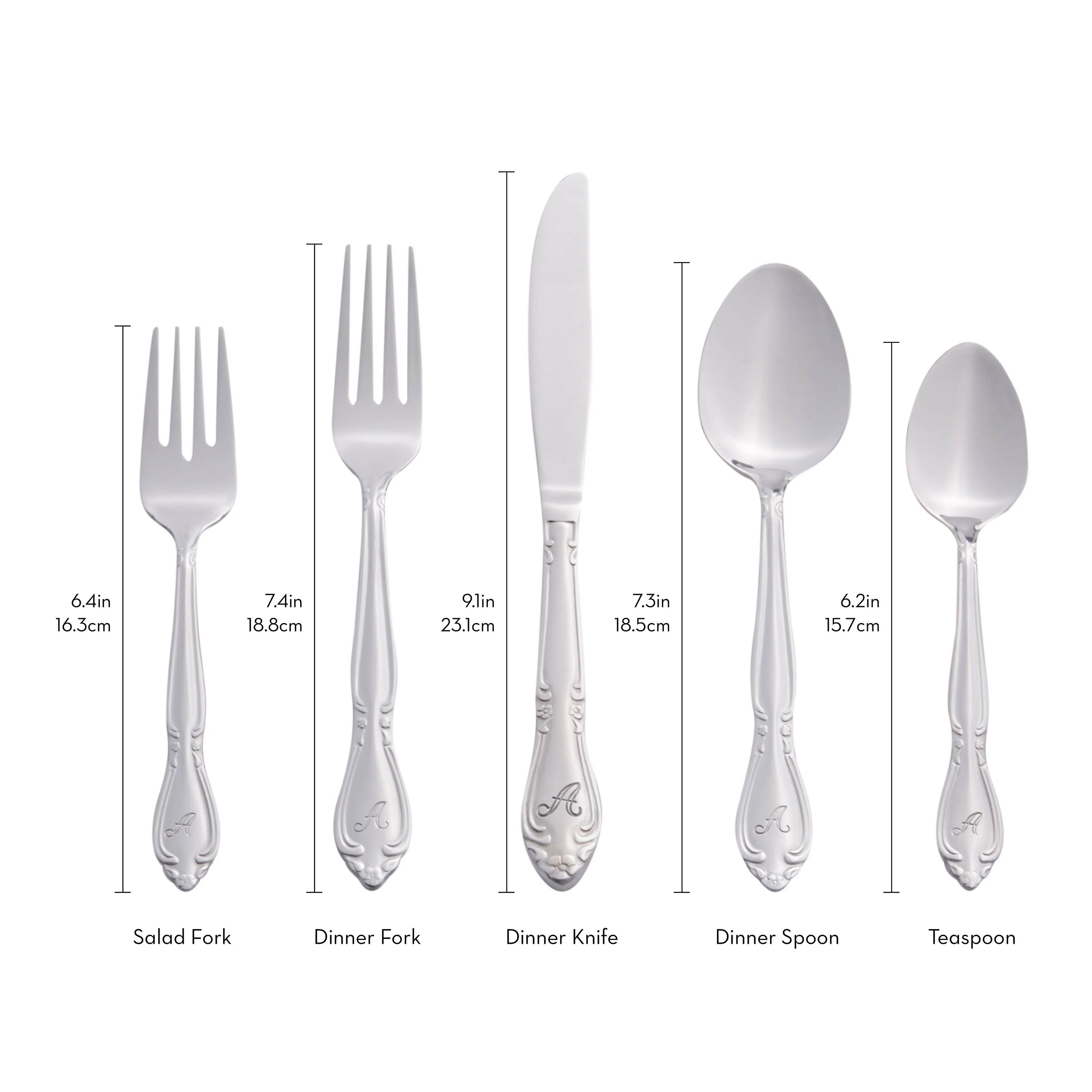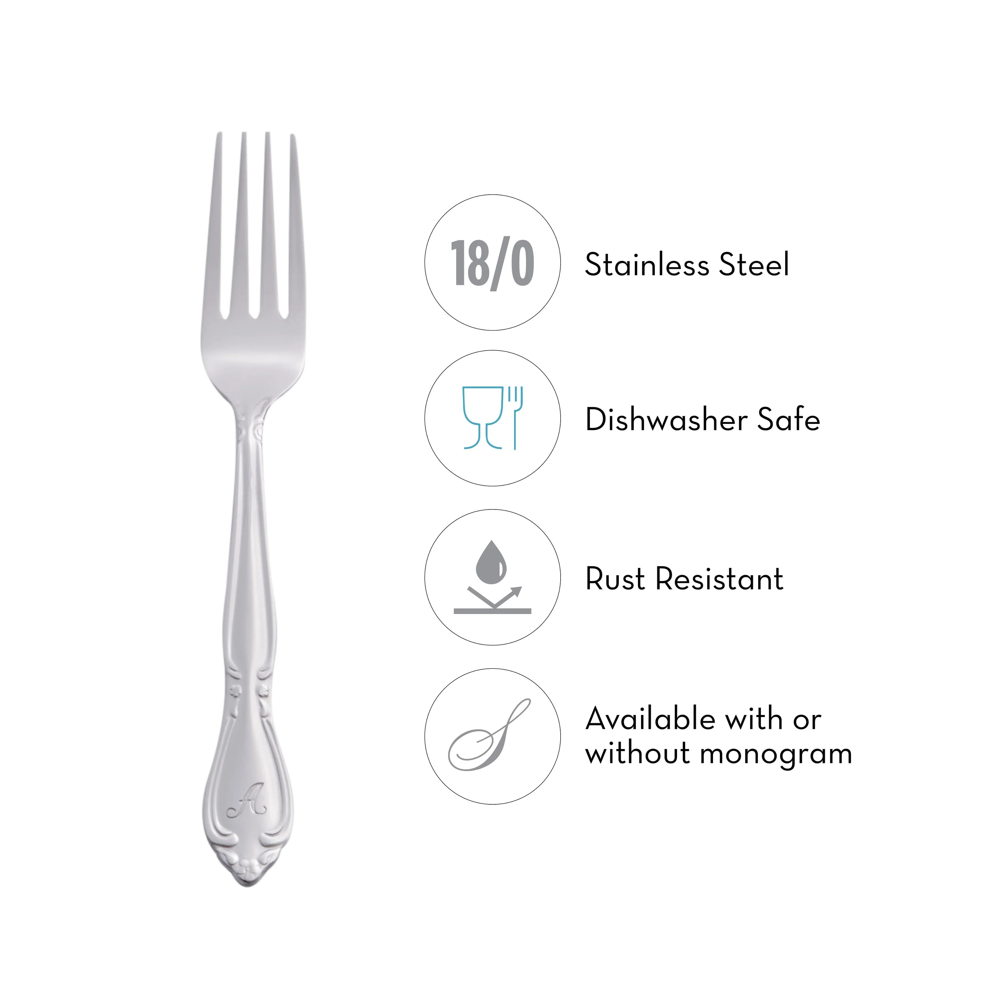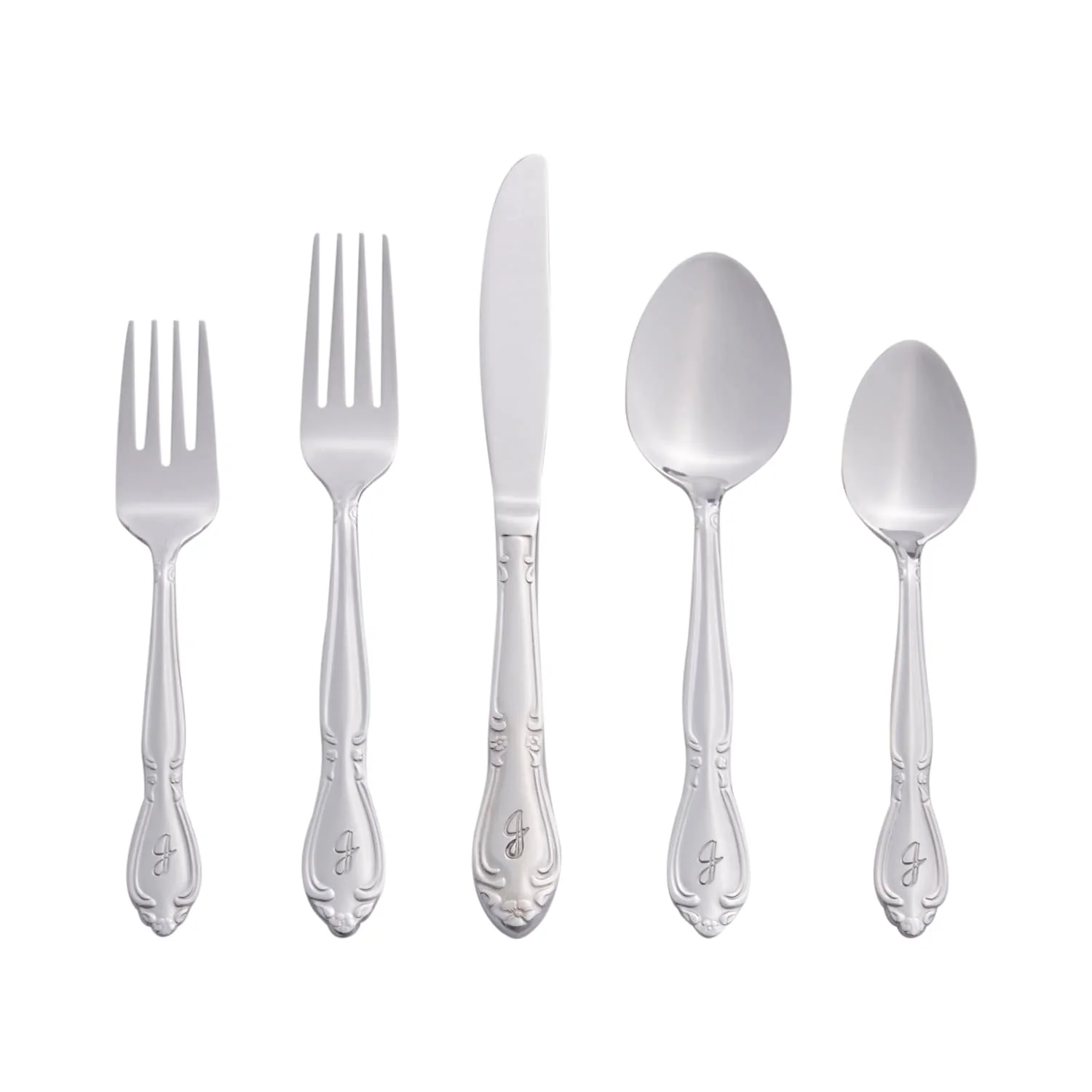 This RiverRidge Rose 46-piece flatware set brings elegance to your table. The traditional shape and rose blossom design complement any setting. This comprehensive set includes 8 place settings and 6 serving pieces, so you're prepared for family meals and gatherings. The set includes 8 of each dinner forks, spoons, salad forks, teaspoons, and knives, plus a one serving spoon, slotted spoon, gravy ladle, serving fork, butter knife, and sugar spoon. Crafted from heavy gauge 18/0 stainless steel with a polished mirror finish, our flatware is both stylish and durable. Suitable for daily use and special occasions, it's dishwasher-safe for easy cleaning. Our Rose Flatware Set offers versatility for all your dining needs. Combines durability with elegance. Crafted from heavy gauge stainless steel, each piece features a polished mirror finish that resists tarnishing. The traditional shape and delicate rose blossom design create a timeless look that suits various table settings. Ideal for both everyday use and special occasions, our flatware set is a versatile choice for newlyweds or new homeowners.