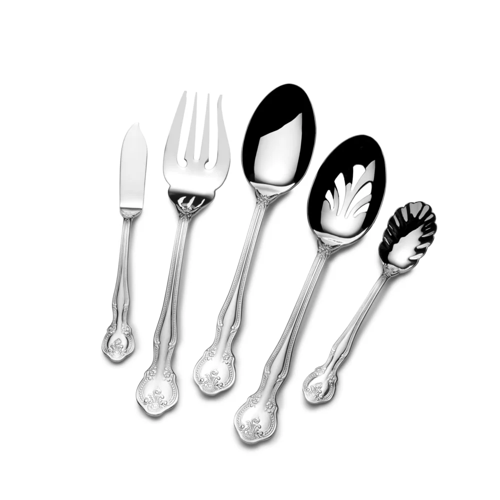 Elevate your dining experience with this St. James Napoleon Bead 18/10 Stainless Steel 65-Piece Flatware Set. Crafted from strong and corrosion-resistant 18/10 stainless steel, this set of flatware is perfect for hosting family dinners or casual gatherings with friends. The set includes 12 dinner forks, 12 salad forks, 12 dinner knives, 12 dinner spoons, and 12 teaspoons, as well as additional items like a tablespoon, cold meat fork, pierced tablespoon, sugar spoon, and butter knife. The Napoleon-bead pattern adds an elegant touch to any table setting. Dishwasher safe for easy cleaning, this flatware set is ideal for both formal and casual occasions.