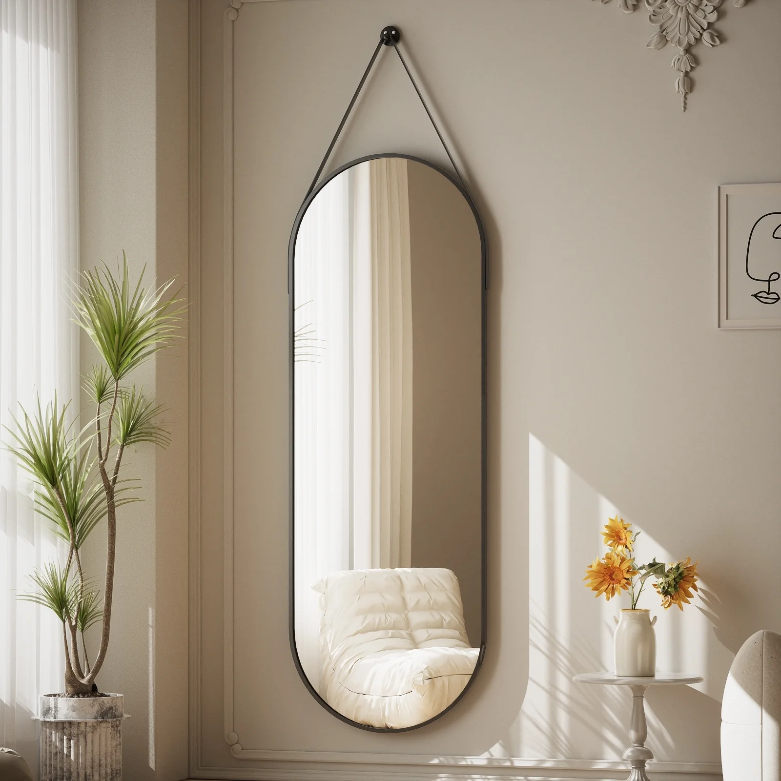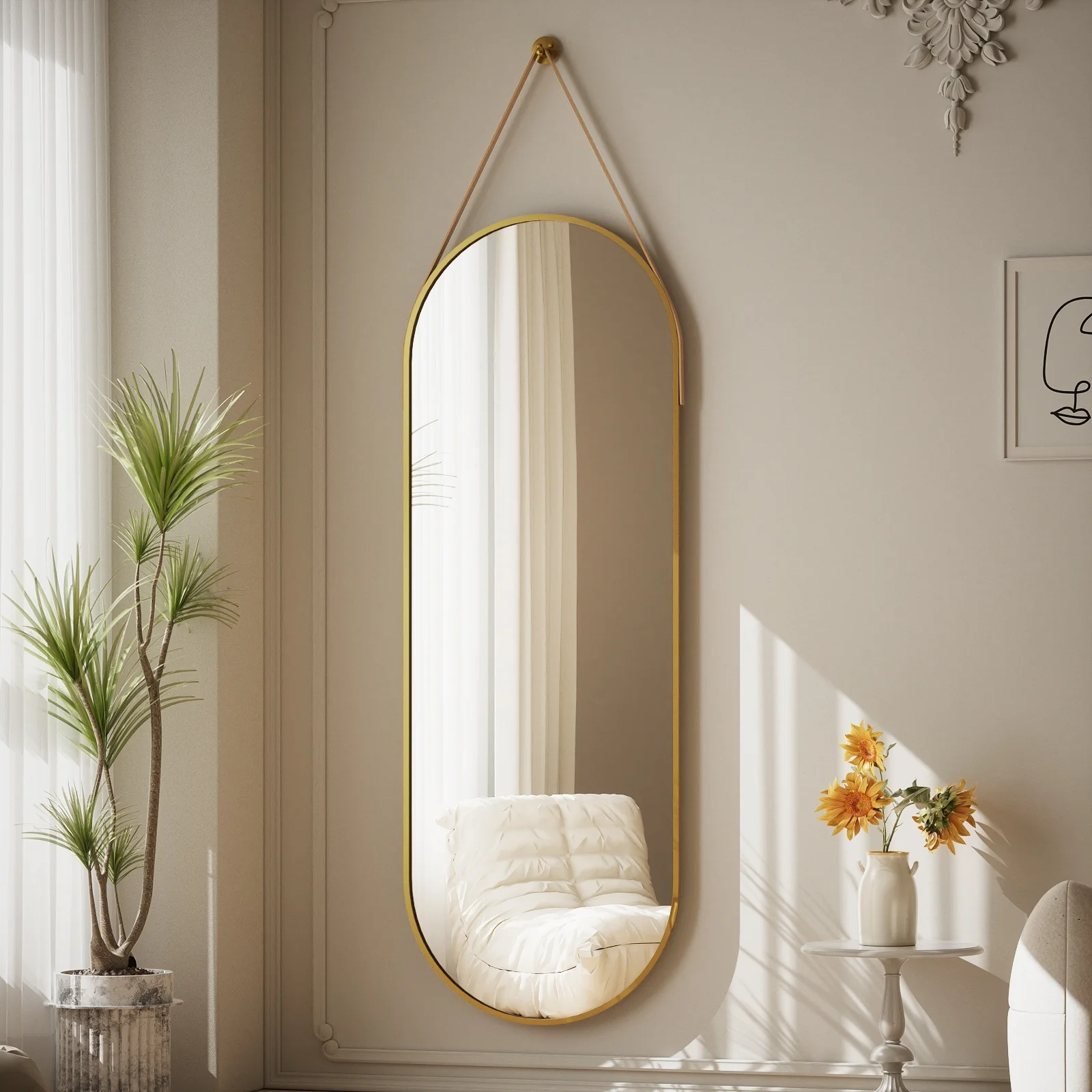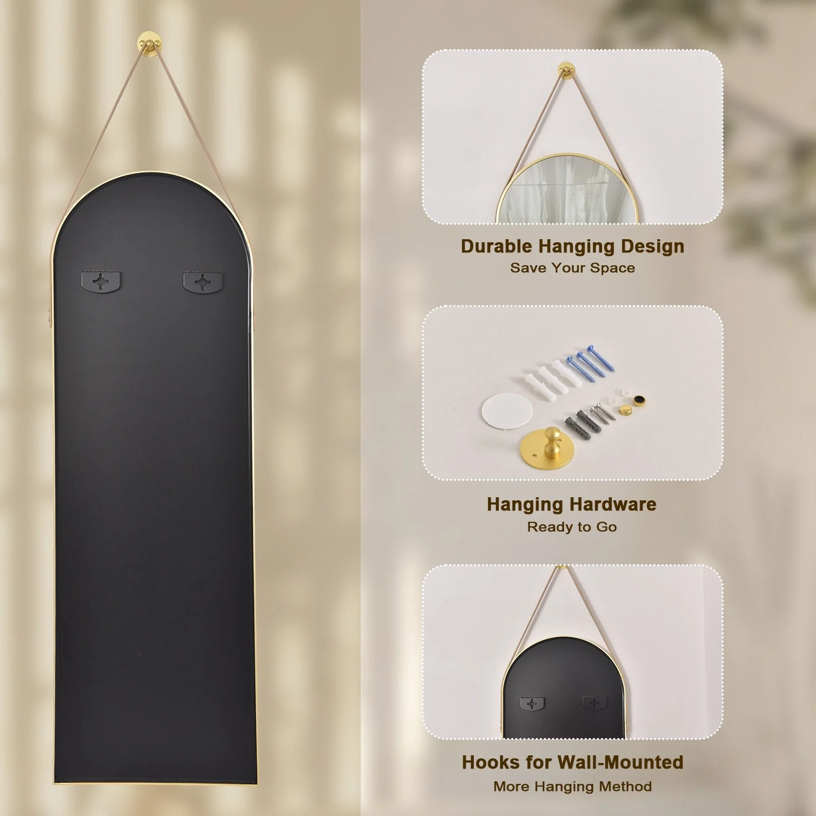 Our full length mirrror has a unique shape design and is suspended by a belt. High-quality aluminum alloy and leather materials make it more stable and durable. Not only can it be used as a mirror, but it is also a good wall decoration. �