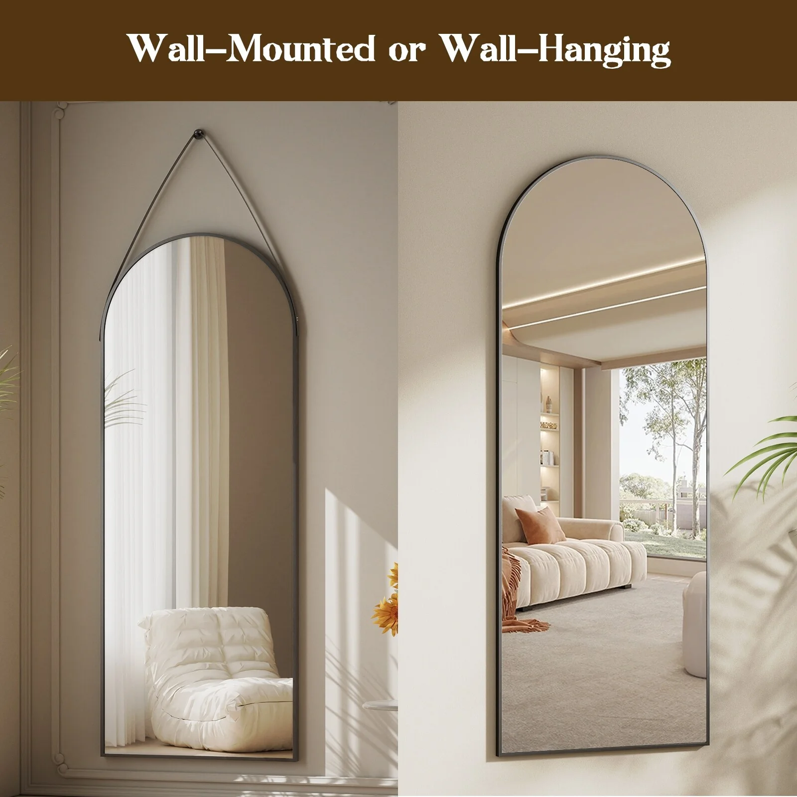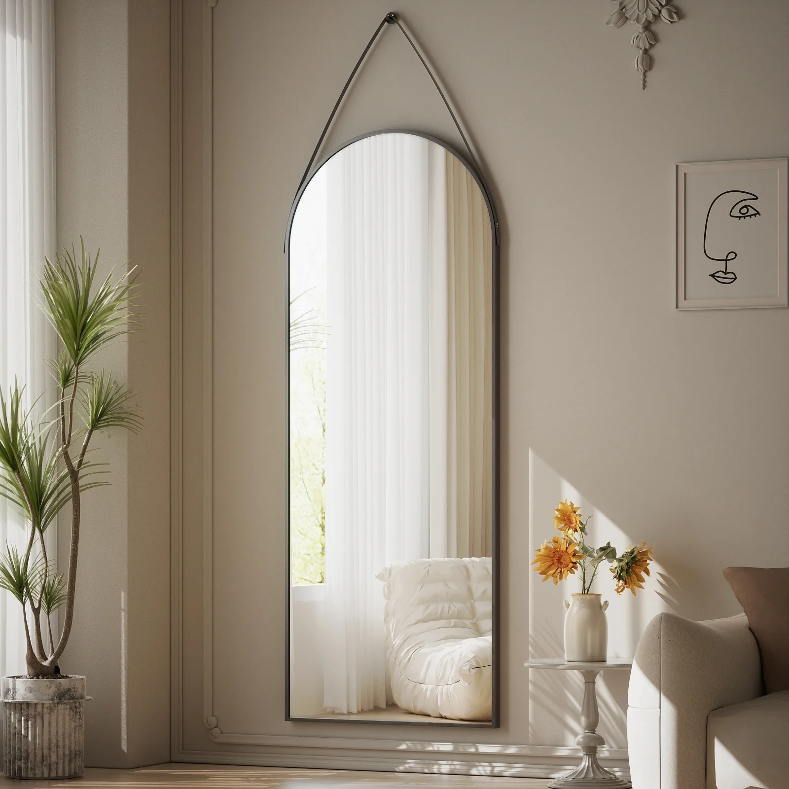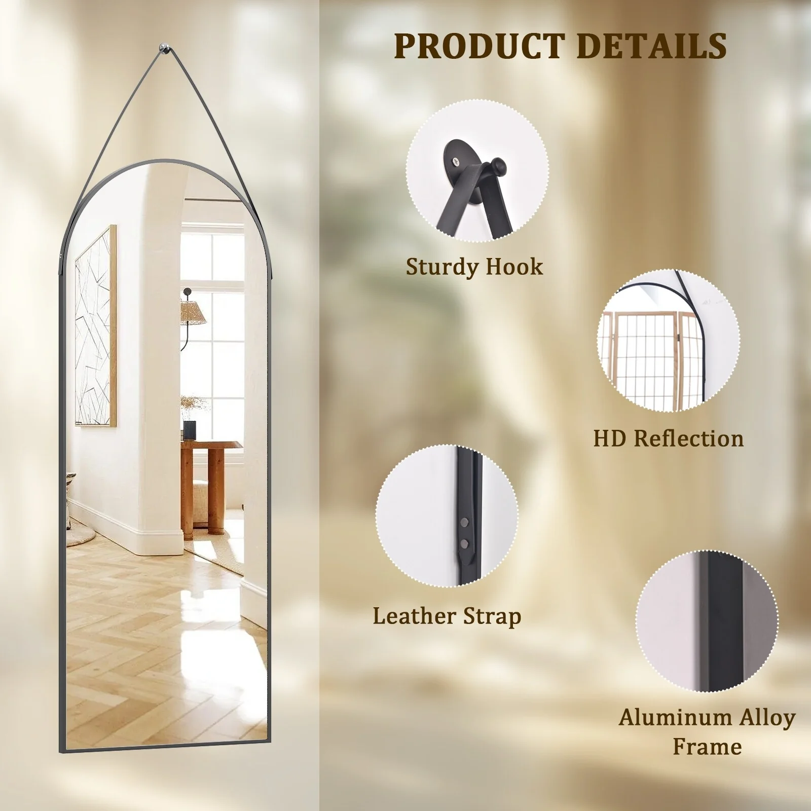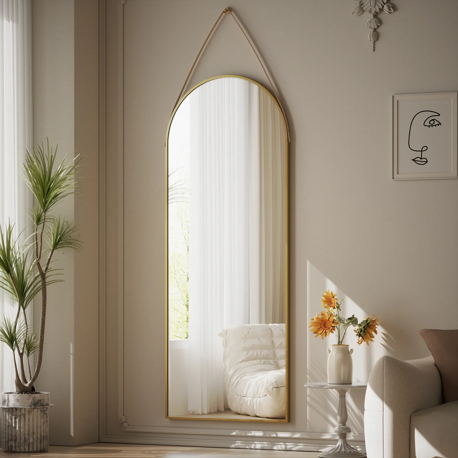 Our full length mirrror has a unique shape design and is suspended by a belt. High-quality aluminum alloy and leather materials make it more stable and durable. Not only can it be used as a mirror, but it is also a good wall decoration. �