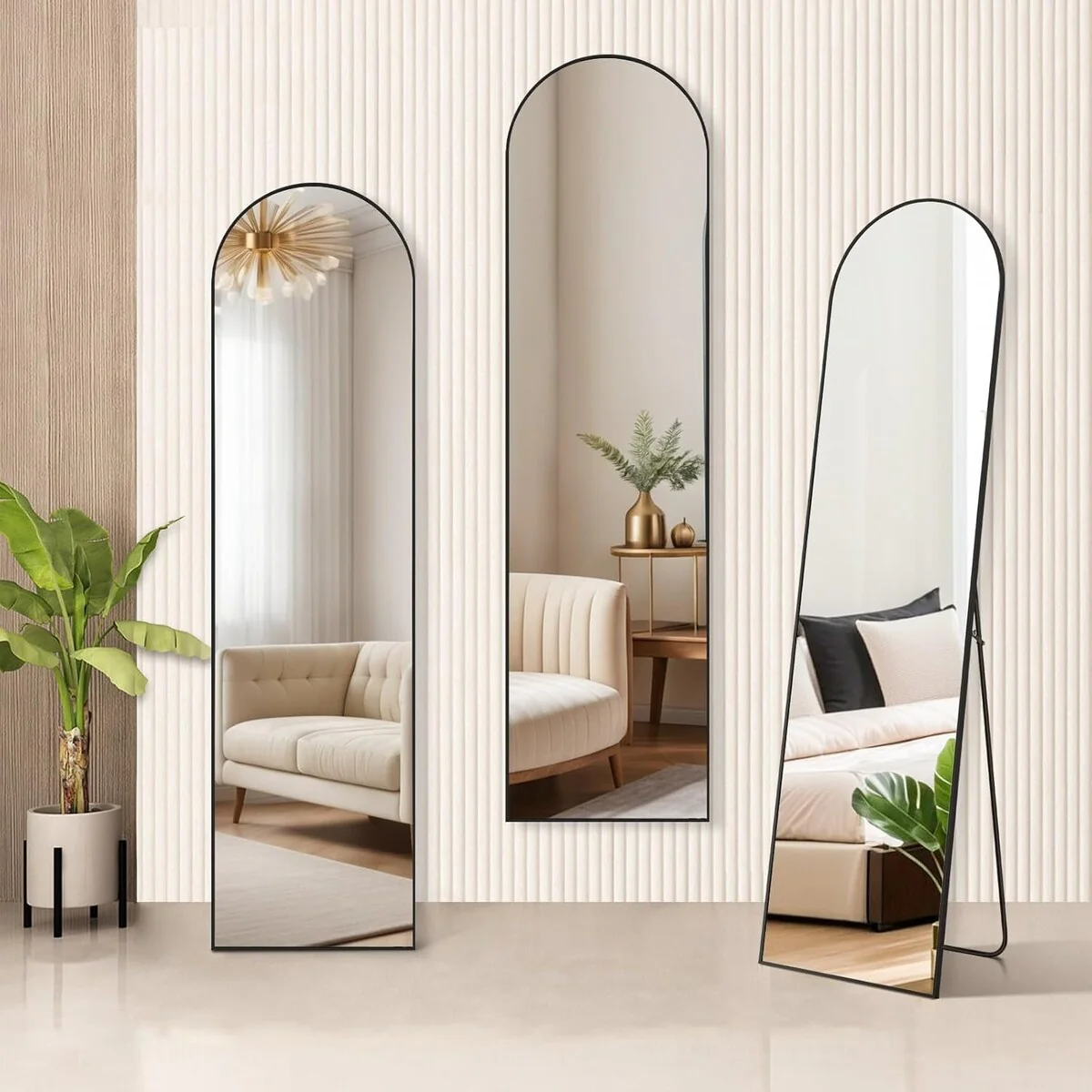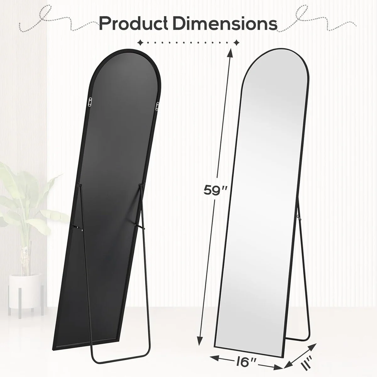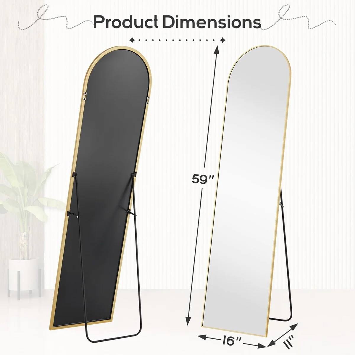 - Full-Length Mirror: This standing mirror measures 59'L x 16'W, providing a complete view of the entire body for full appreciation. Its modern design seamlessly blends into any space, available in black or gold to match your home decor.