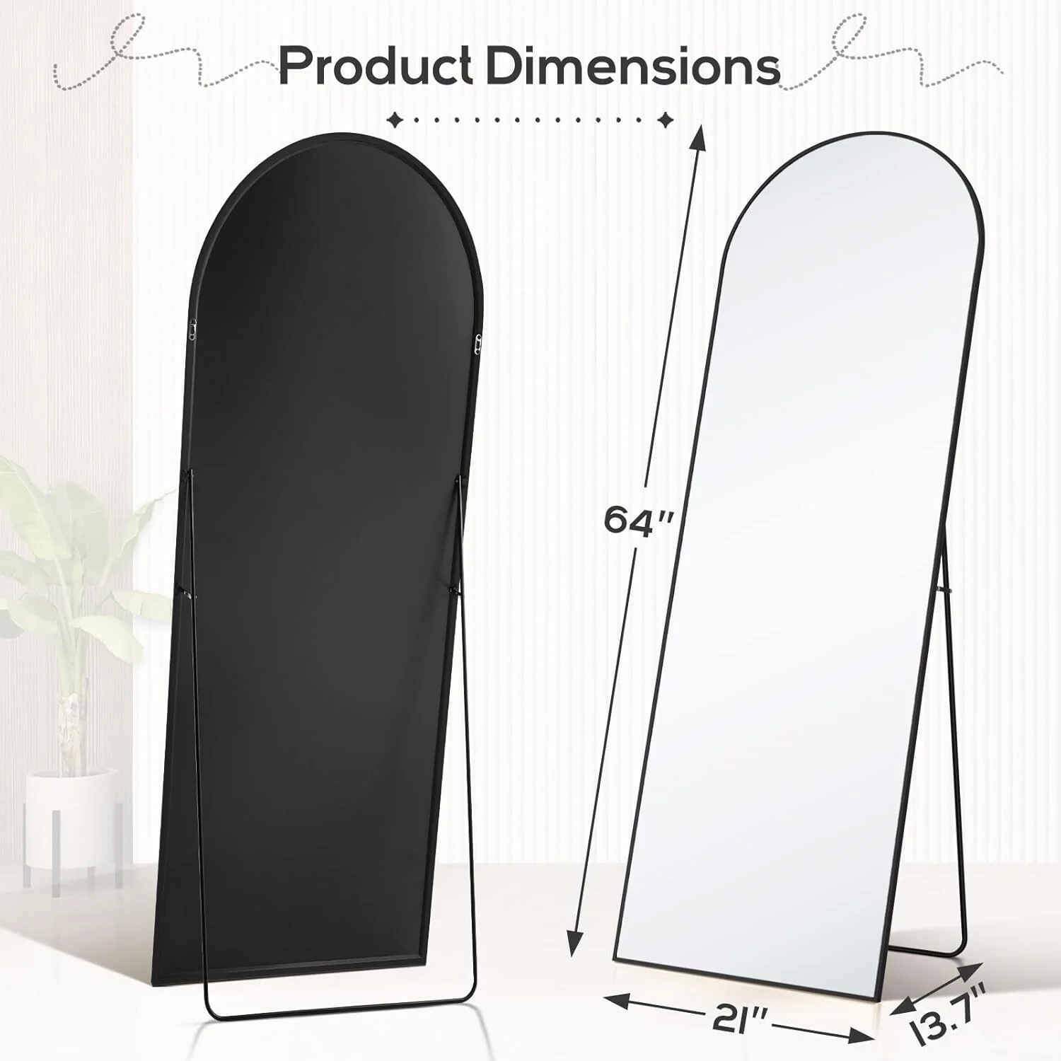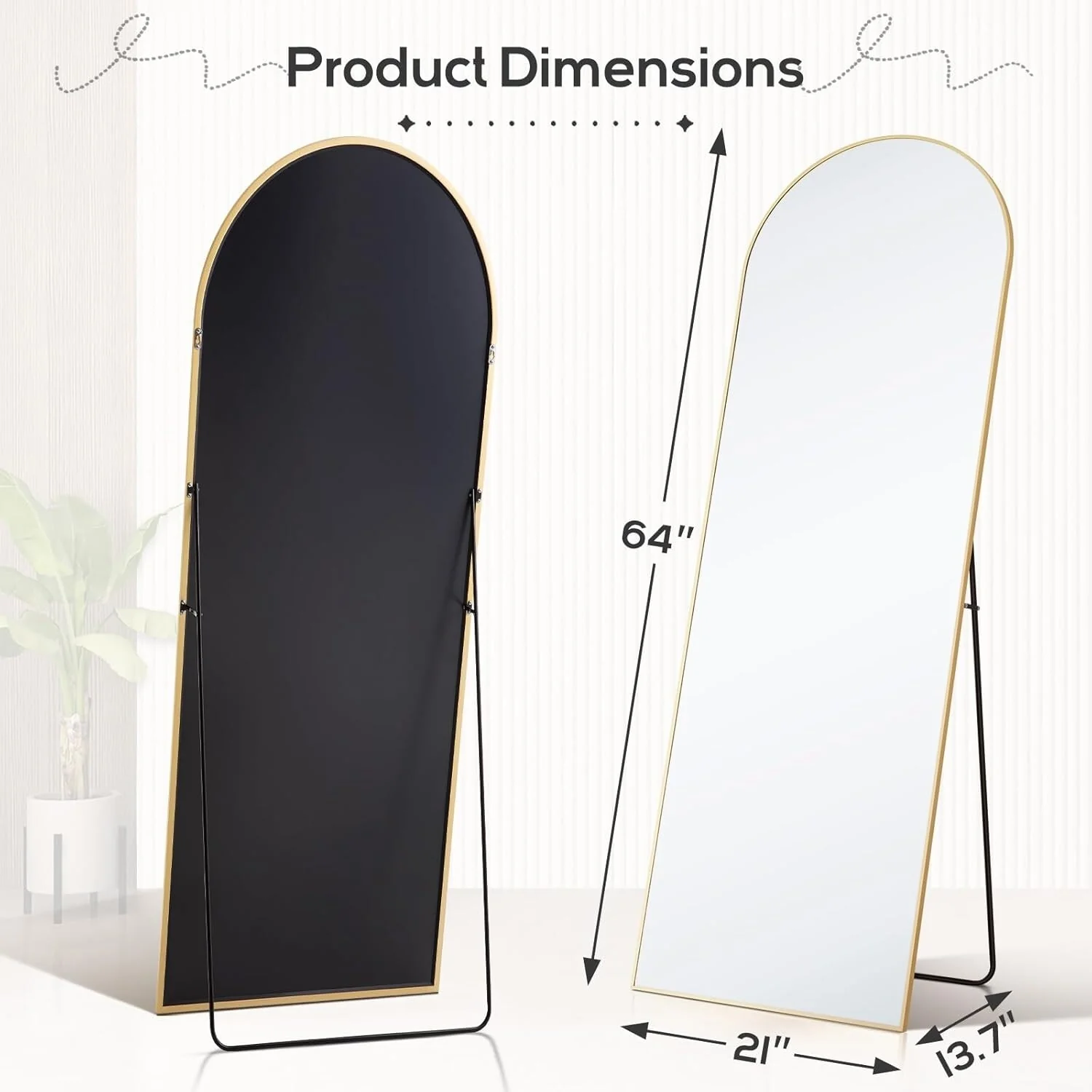 - Full-Length Mirror: This standing mirror measures 64'L x 21'W, providing a complete view of the entire body for full appreciation. Its modern design seamlessly blends into any space, available in black or gold to match your home decor.