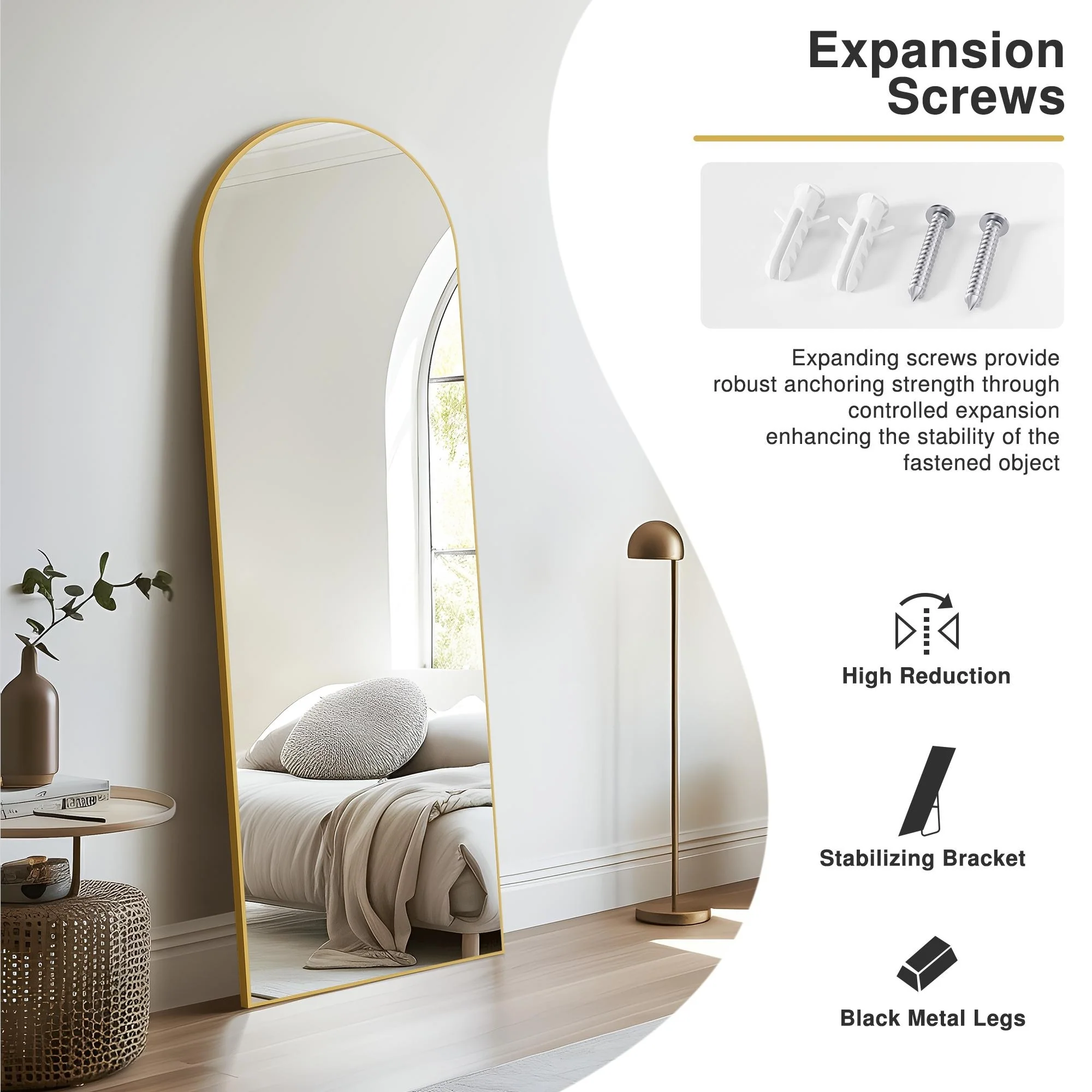 Elevate your space with the Arched Full Length Floor Wall Mirror, a standing mirror that brings a touch of sophistication to any room. This arch mirror's slim, ultra-thin frame and distinctive arch-crowned silhouette add a modern yet timeless appeal to your home decor. Crafted with shatter-proof glass, it offers exceptional reflective clarity and safety, making it a reliable choice for a full length mirror or floor mirror. Versatile in its installation, this standing mirror can be easily mounted on your wall or placed on the floor, available in multiple sizes to suit your space perfectly.