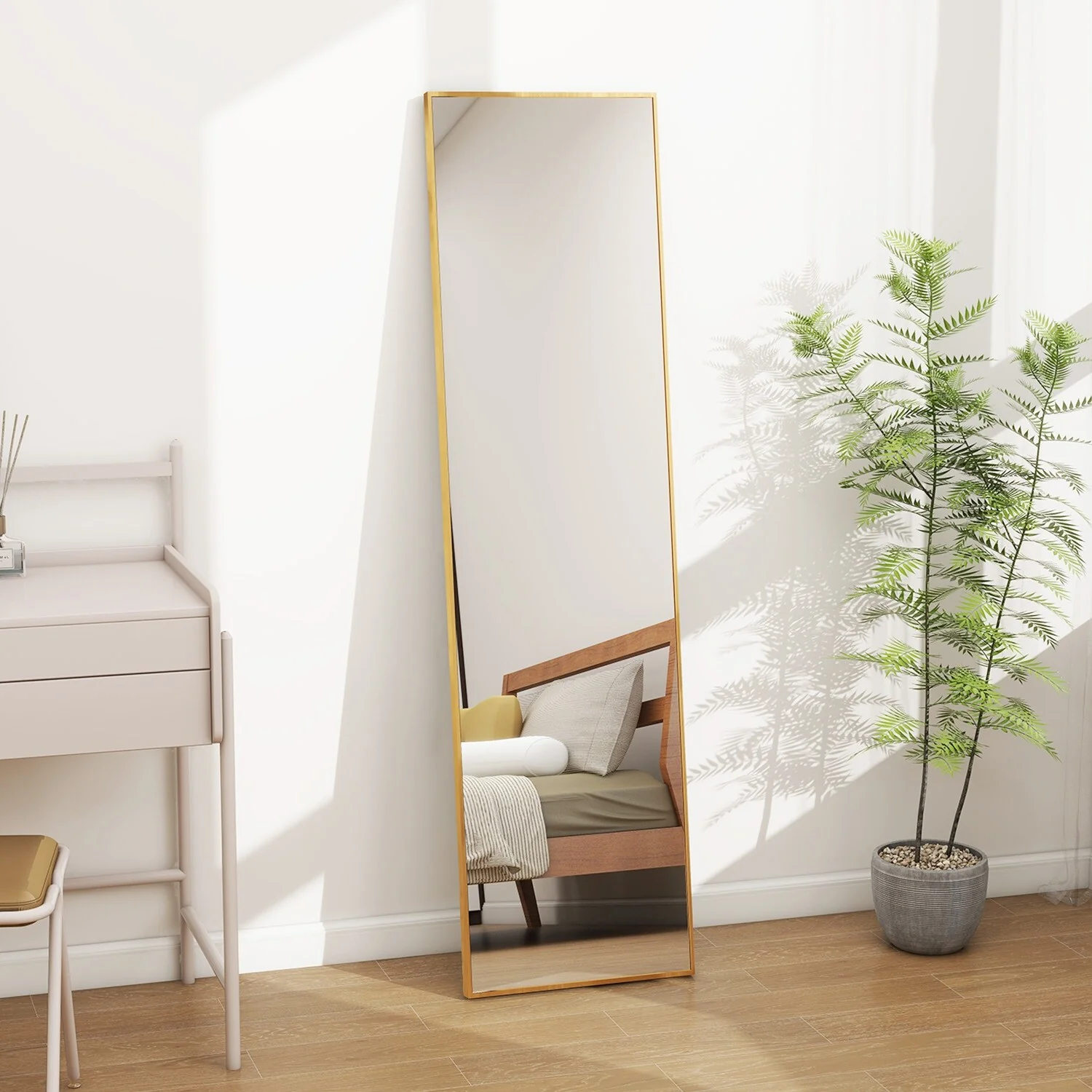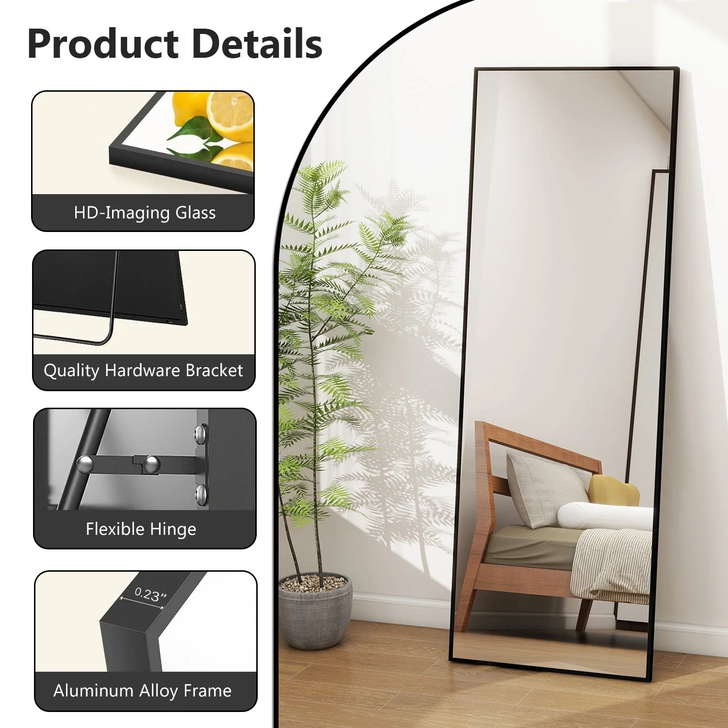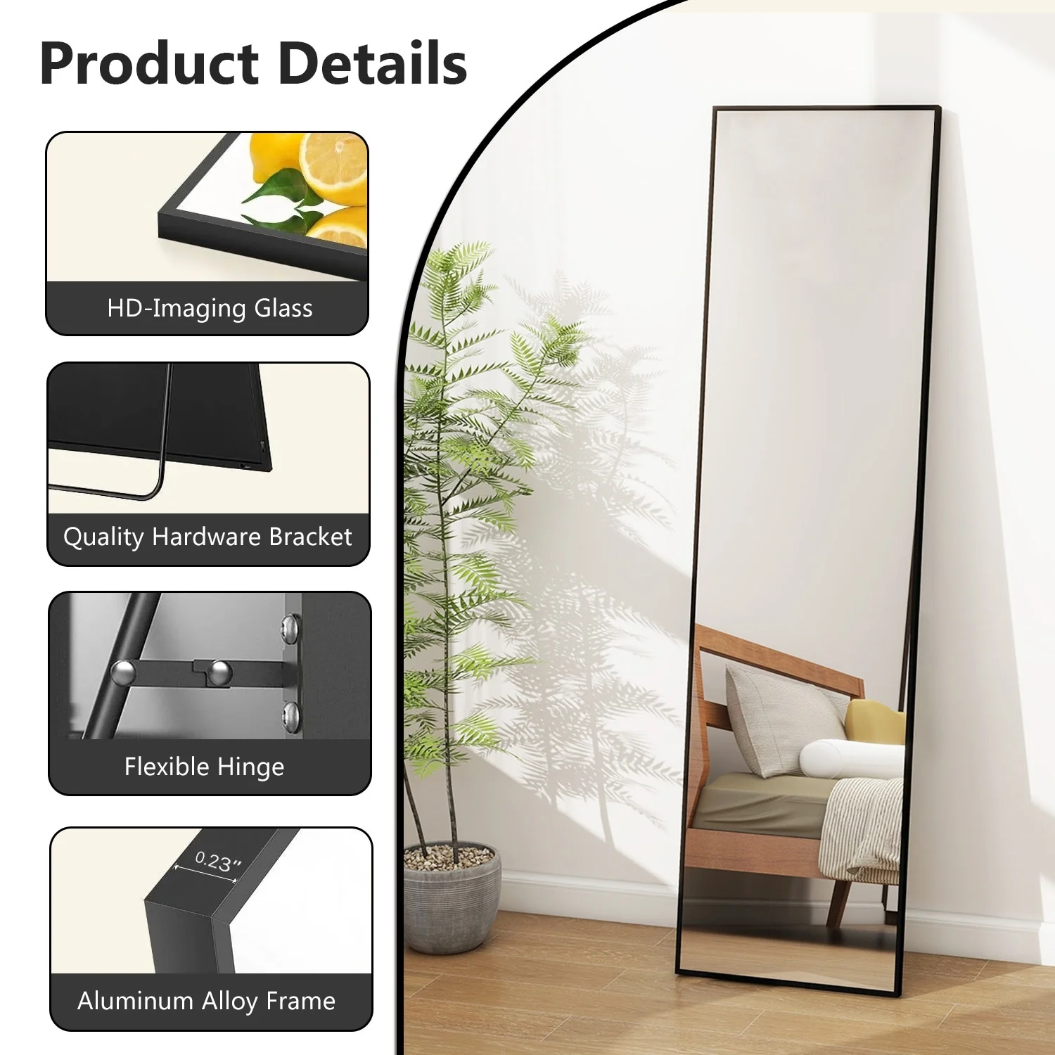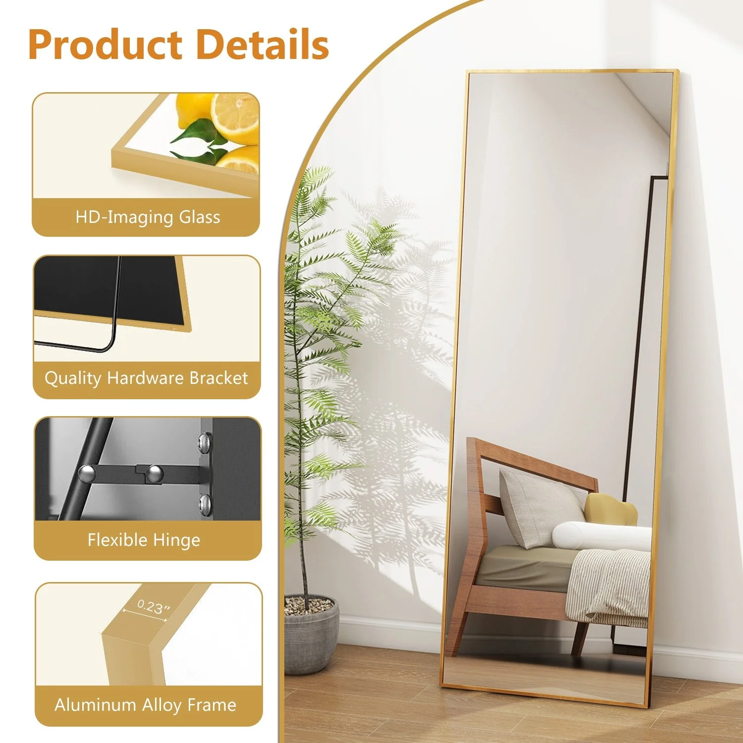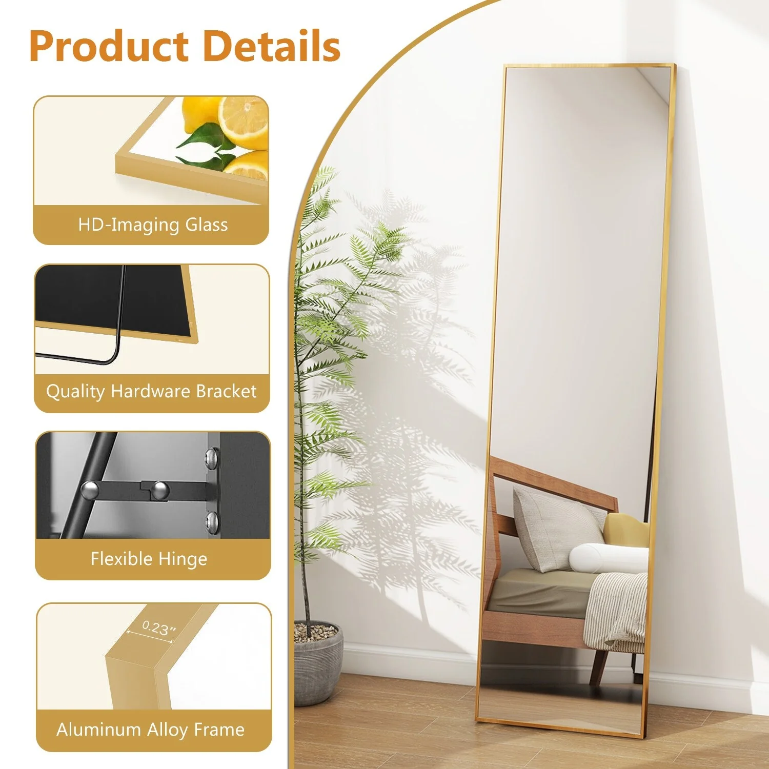 - ALUMINUM ALLOY FRAME: The wall mirror full length is surrounded by anti-rust and colorfast aluminum alloy. The very thin frame (only 0.23' wide on the front), is durable and has a shiny appearance. Wire drawing treat, more stylish and textured.�
