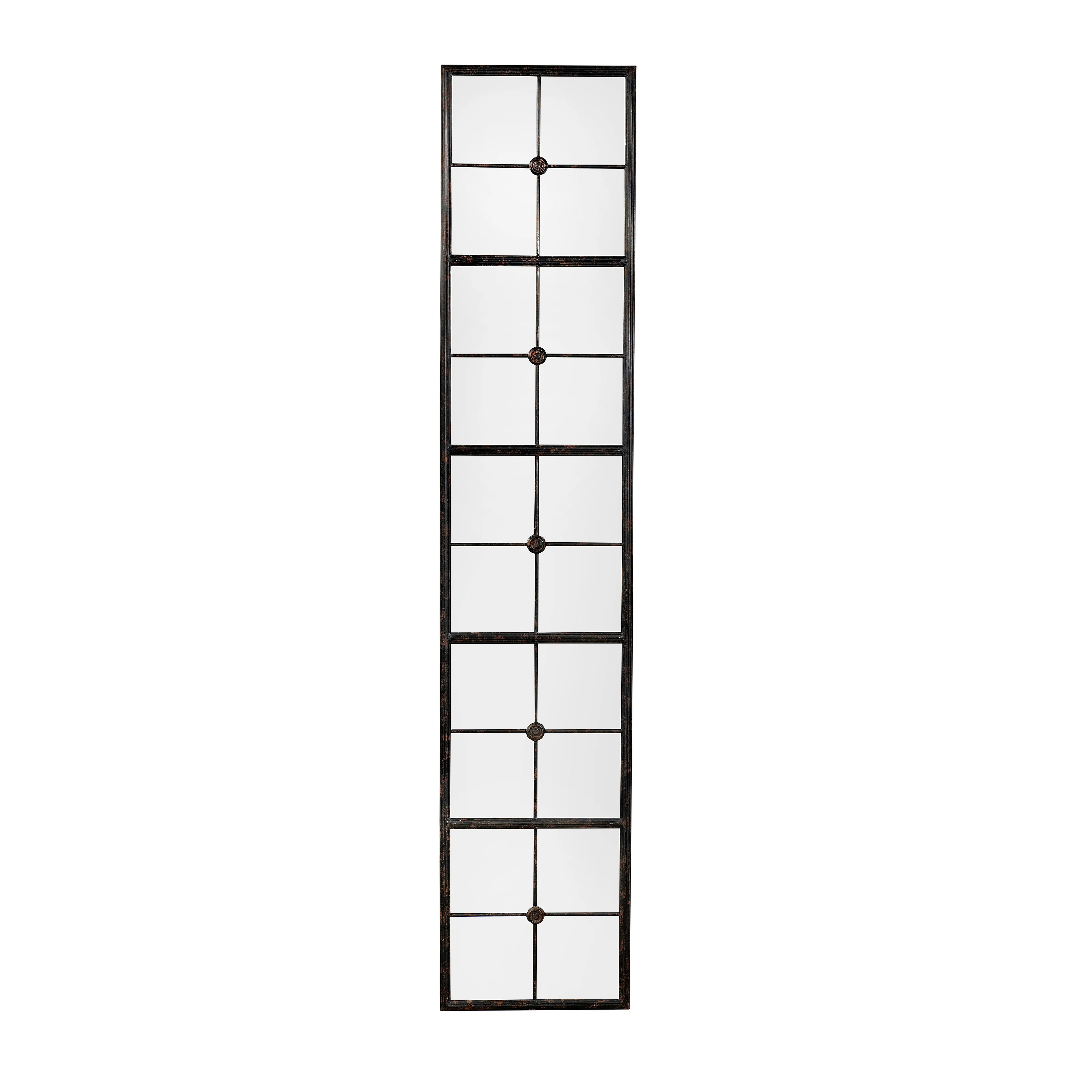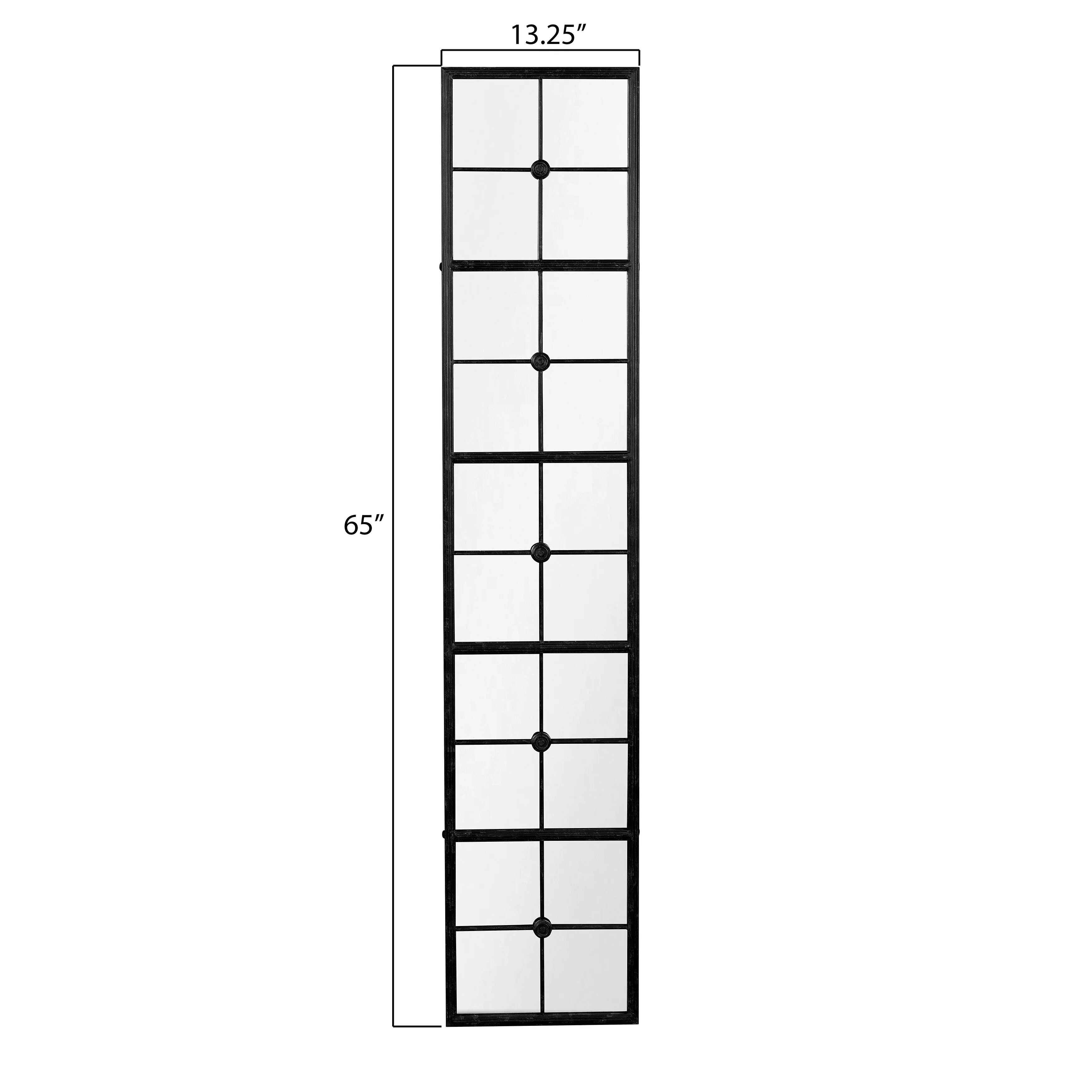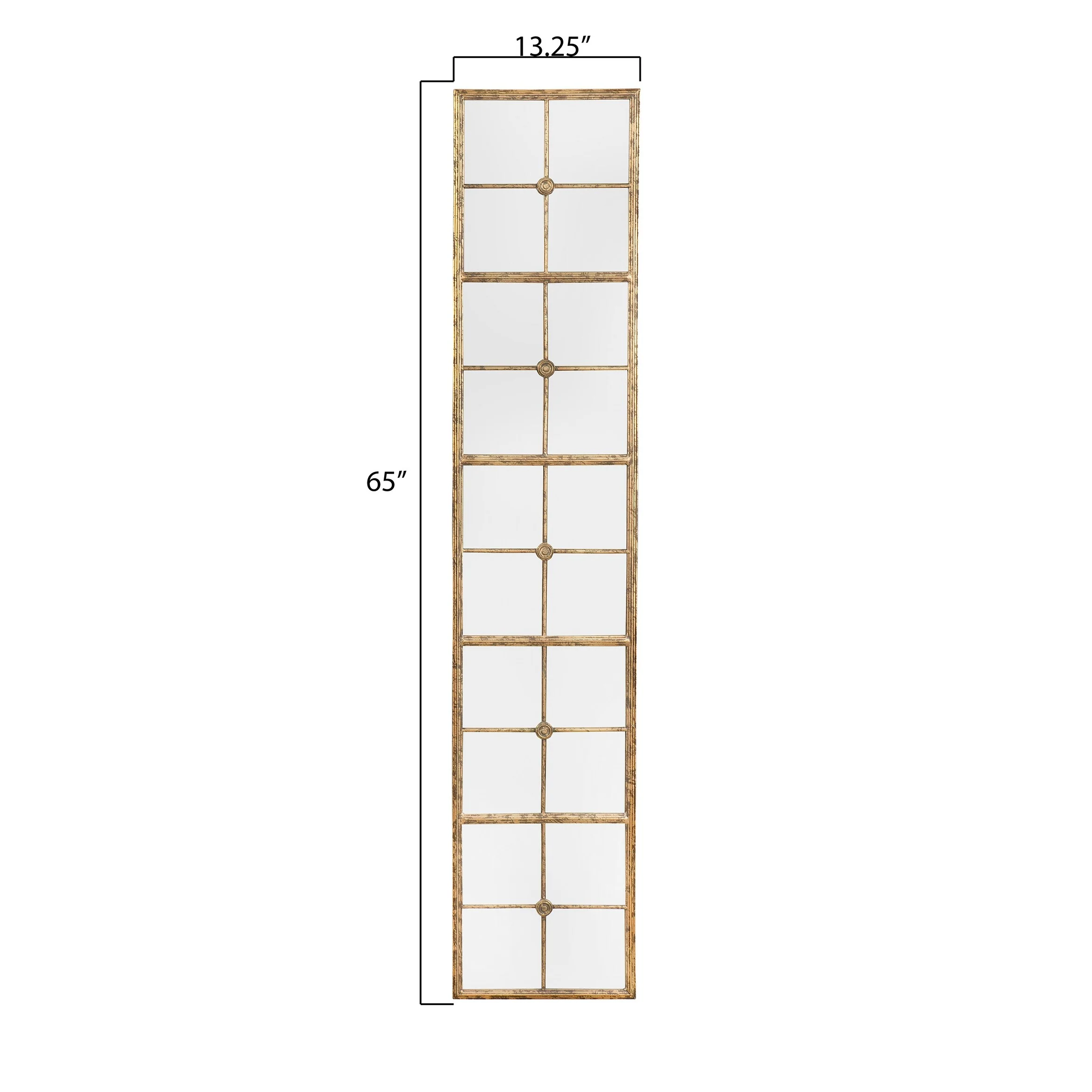 This distressed windowpane wall mirror adds style and depth to any living space. This artfully crafted mirror showcases a rustic metal frame with stylish windowpane detail. The mirror is made from metal and glass for a sleek and sturdy look. The mirror has hanging mechanisms for easy installation and can be hung vertically. This mirror is perfect for adding a touch of elegance and sophistication to any living room, bedroom, or hallway. It measures 13.5 inches long by 65 inches high, making it a perfect size for any space. This mirror is a stunning piece that will add a touch of sophistication to any home.�