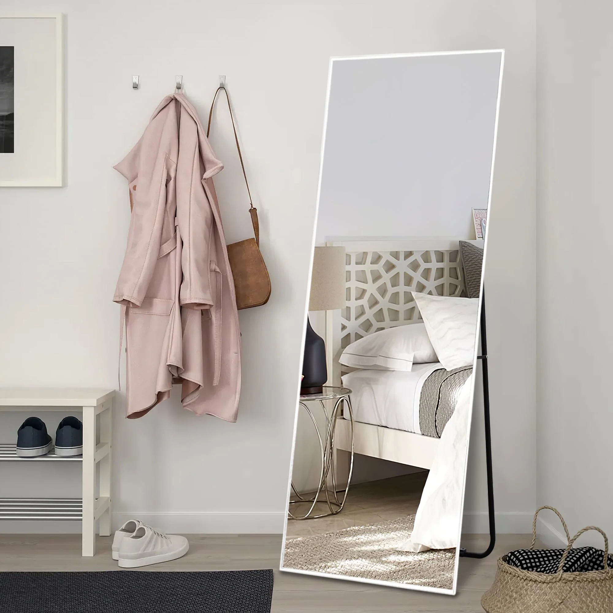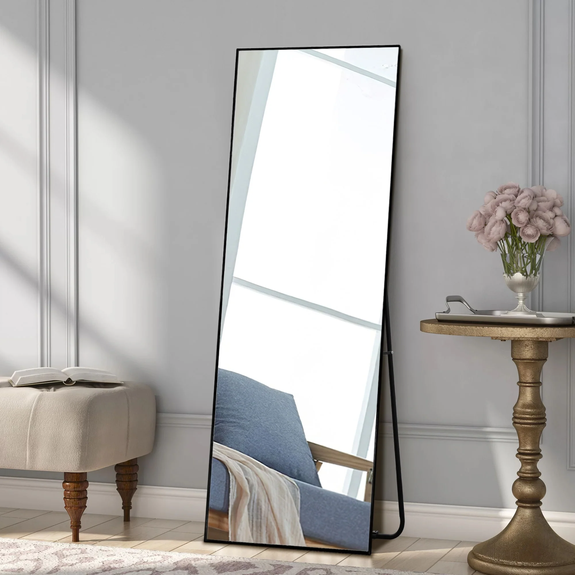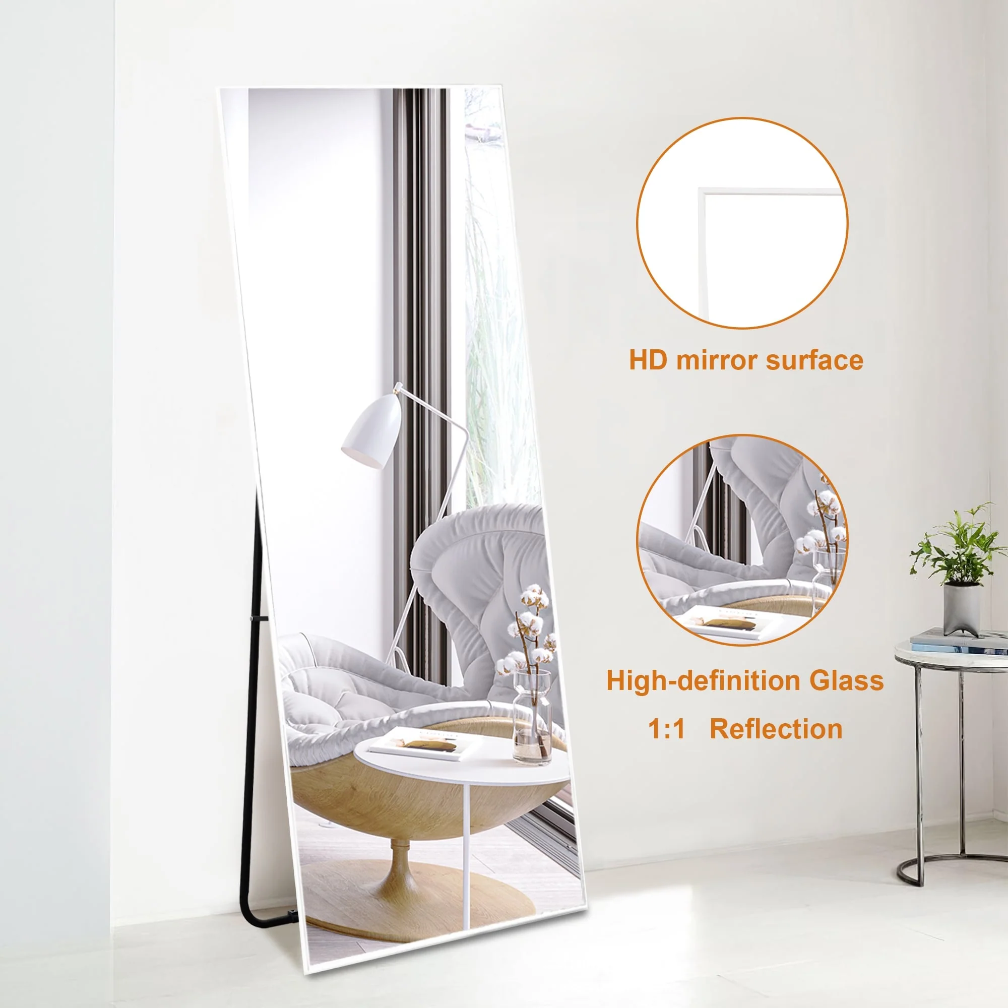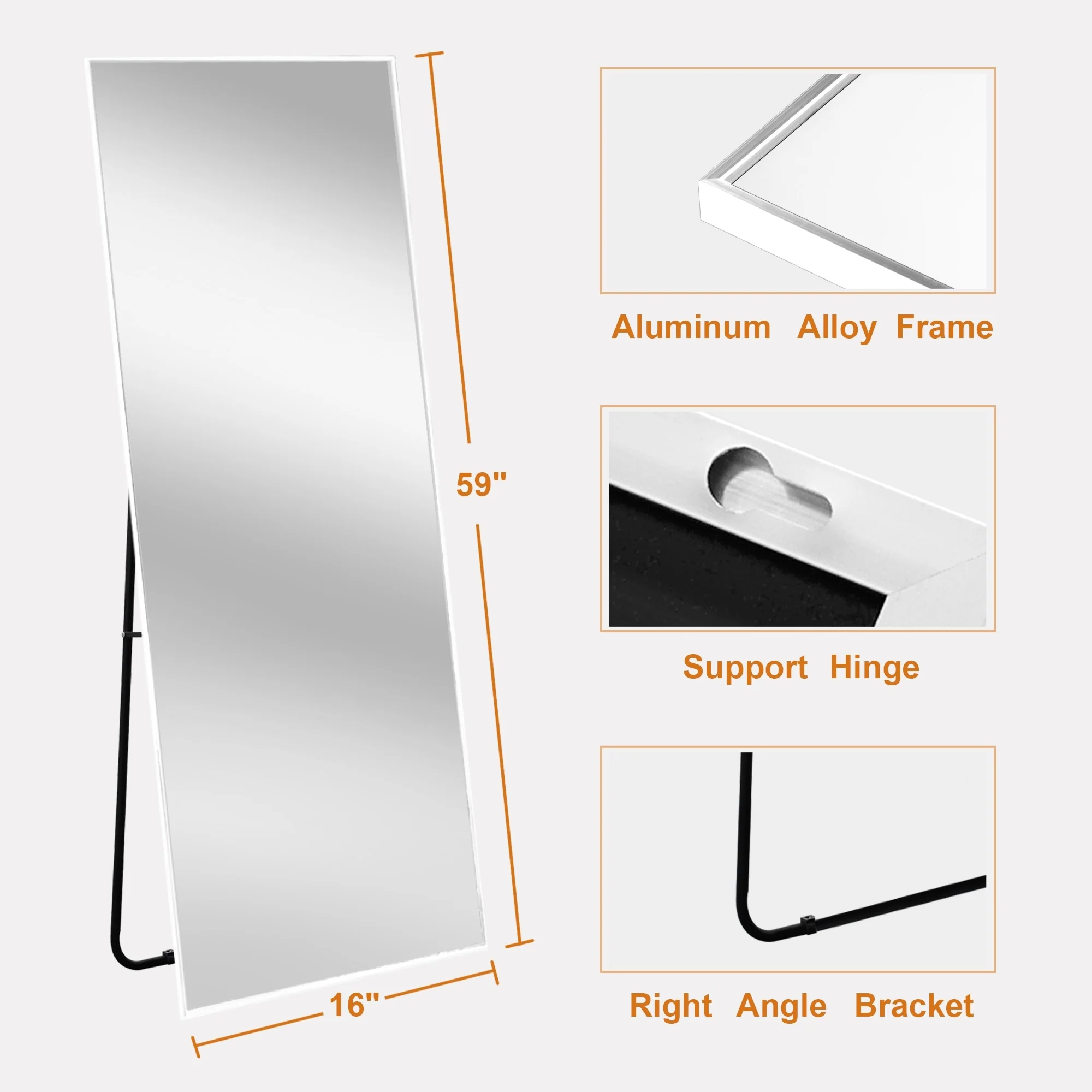 Update your space with the chic style and utility of this floor mirror. This mirror includes an adjustable bar stand, but it is also designed to hang on the wall if desired. Choose from a variety of frame colors and sizes to best meet your needs.