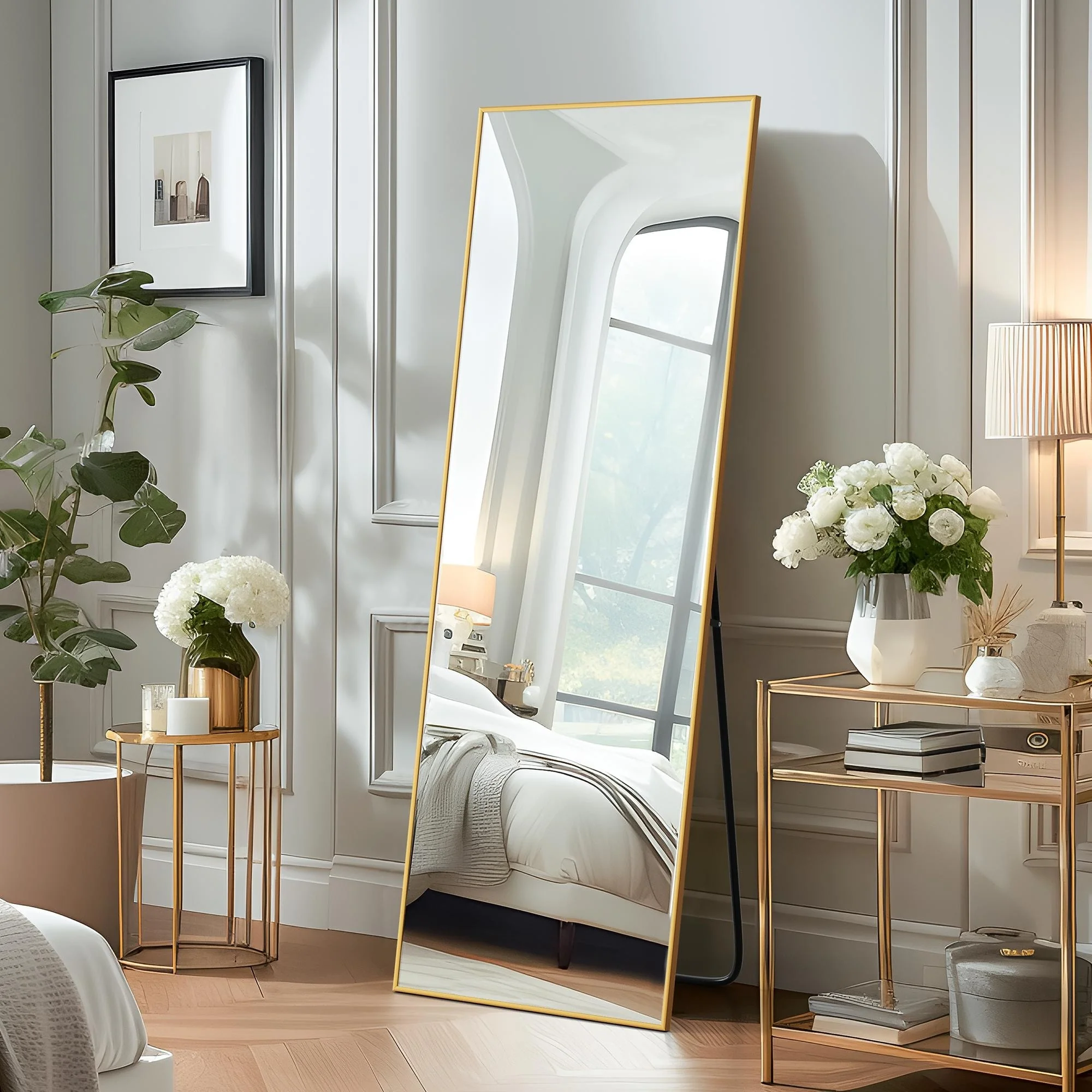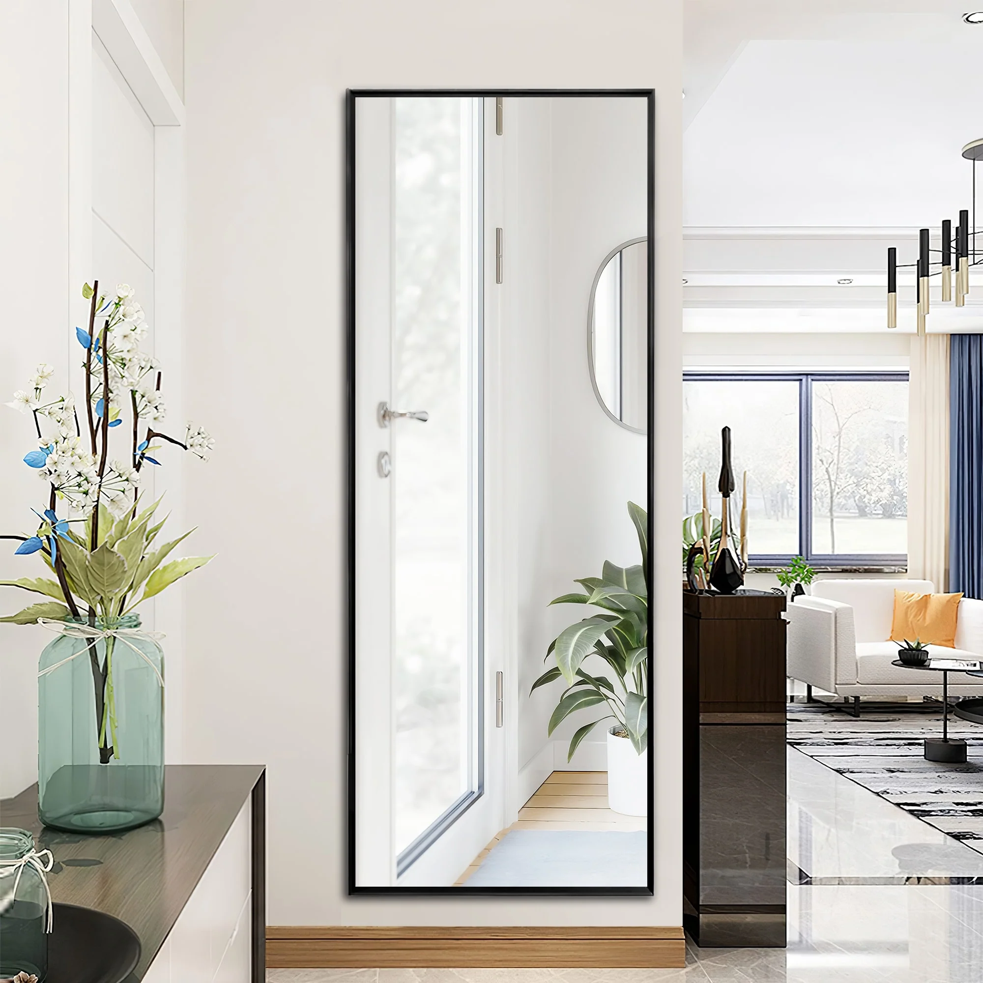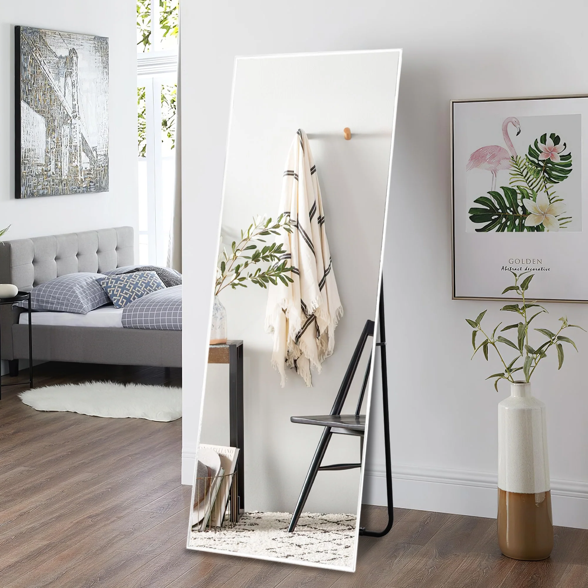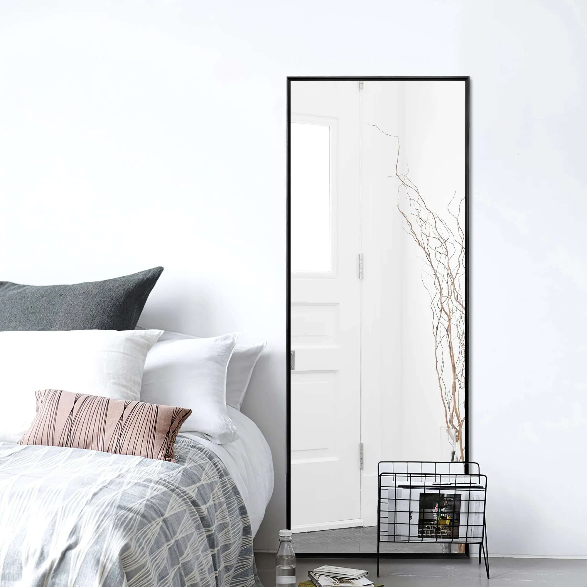 Update your space with the chic style and utility of this floor mirror. This mirror includes an adjustable bar stand, but it is also designed to hang on the wall if desired. Choose from a variety of frame colors and sizes to best meet your needs.