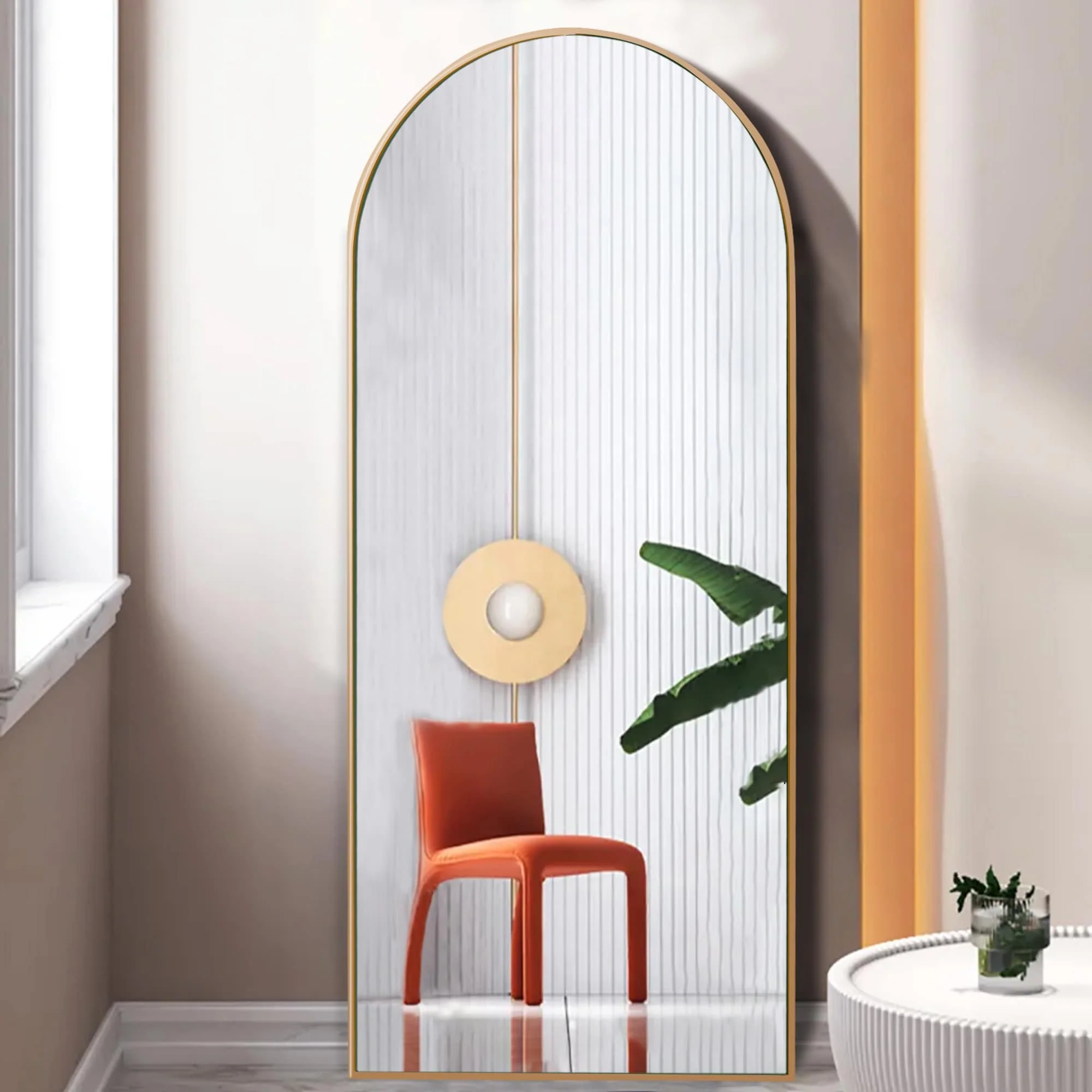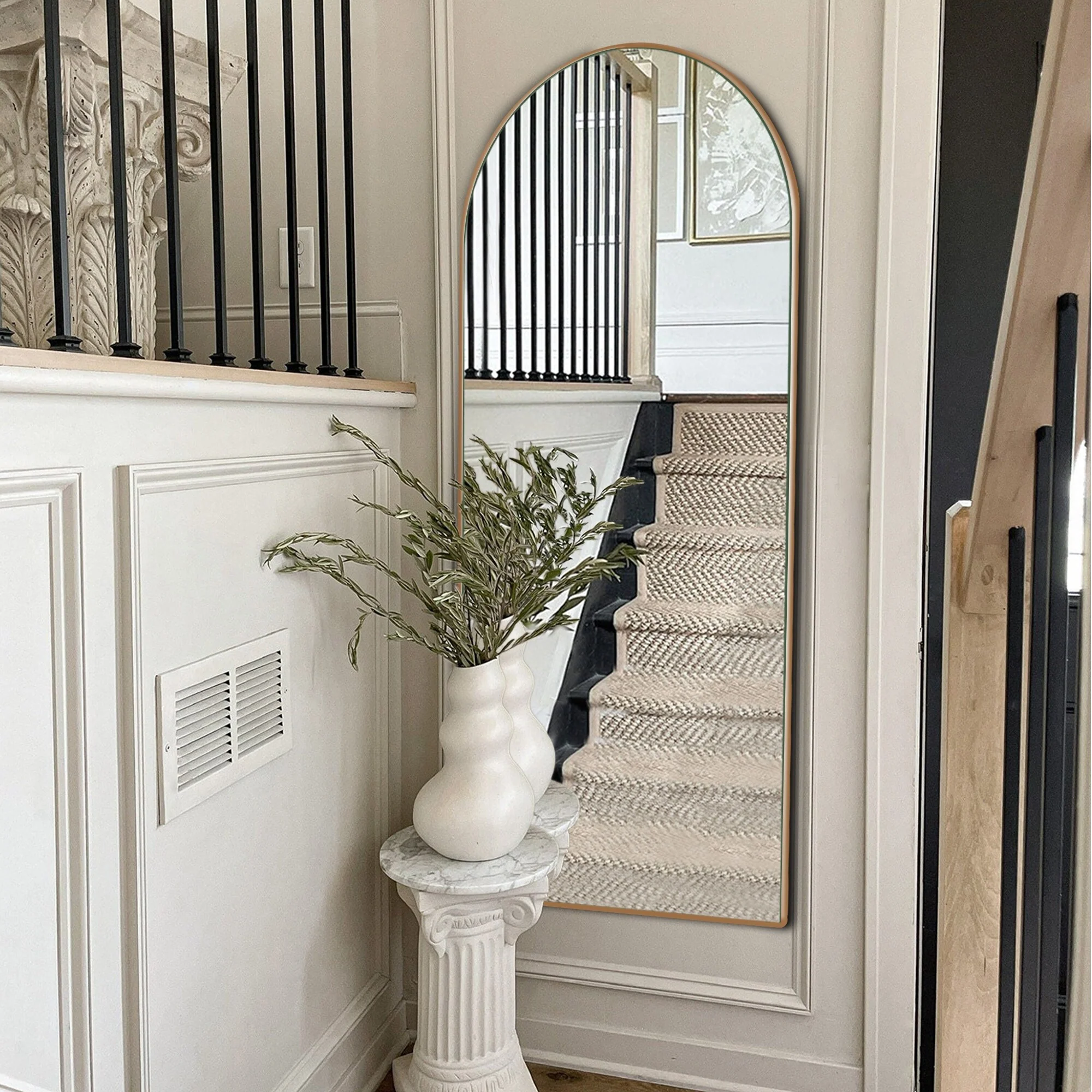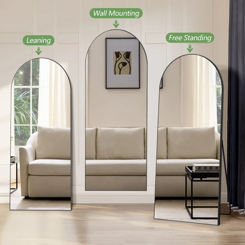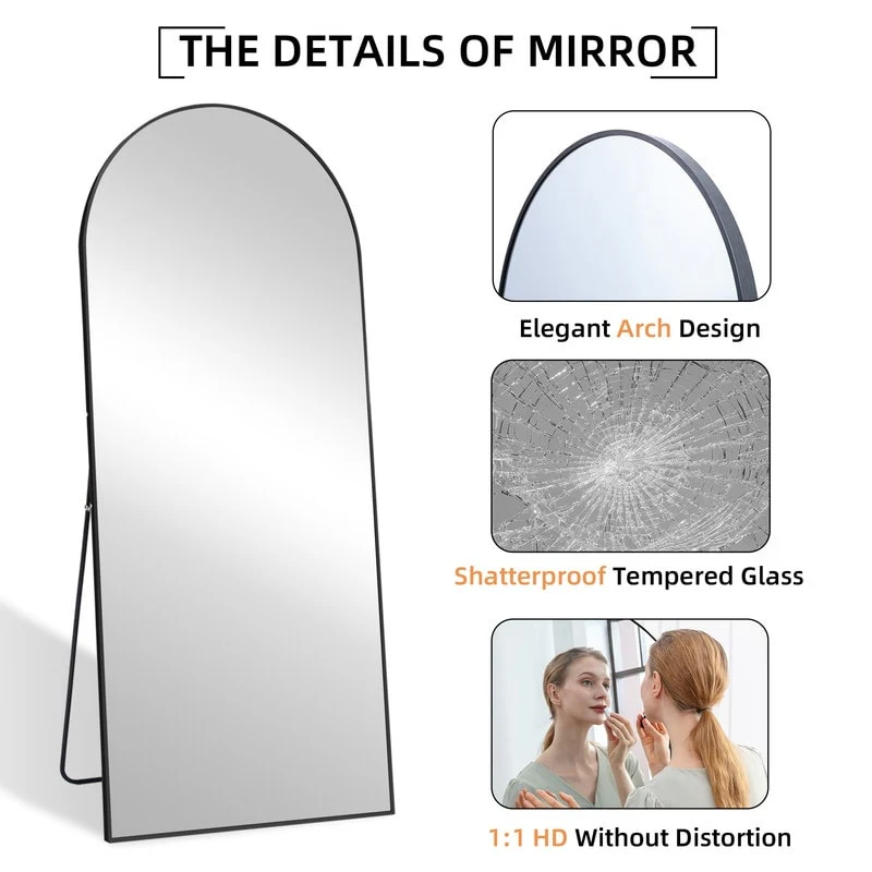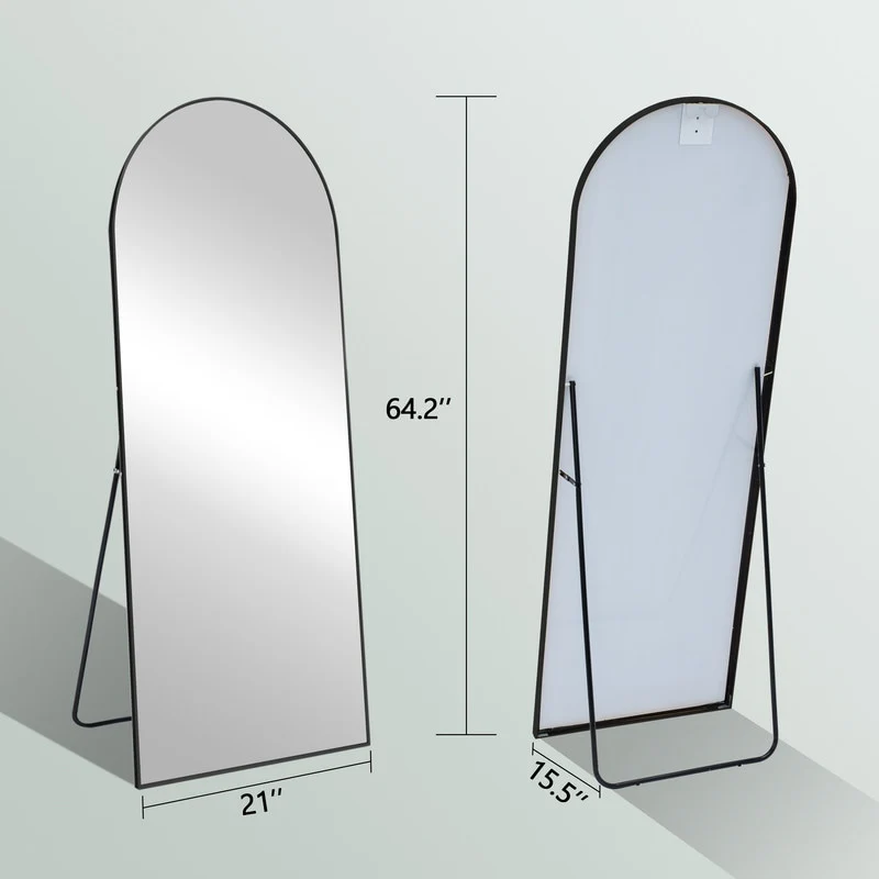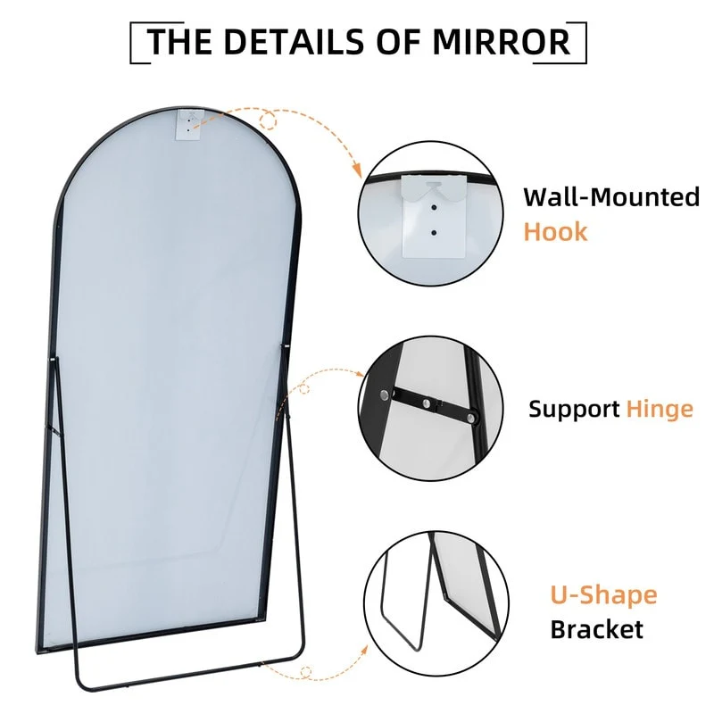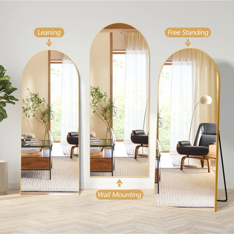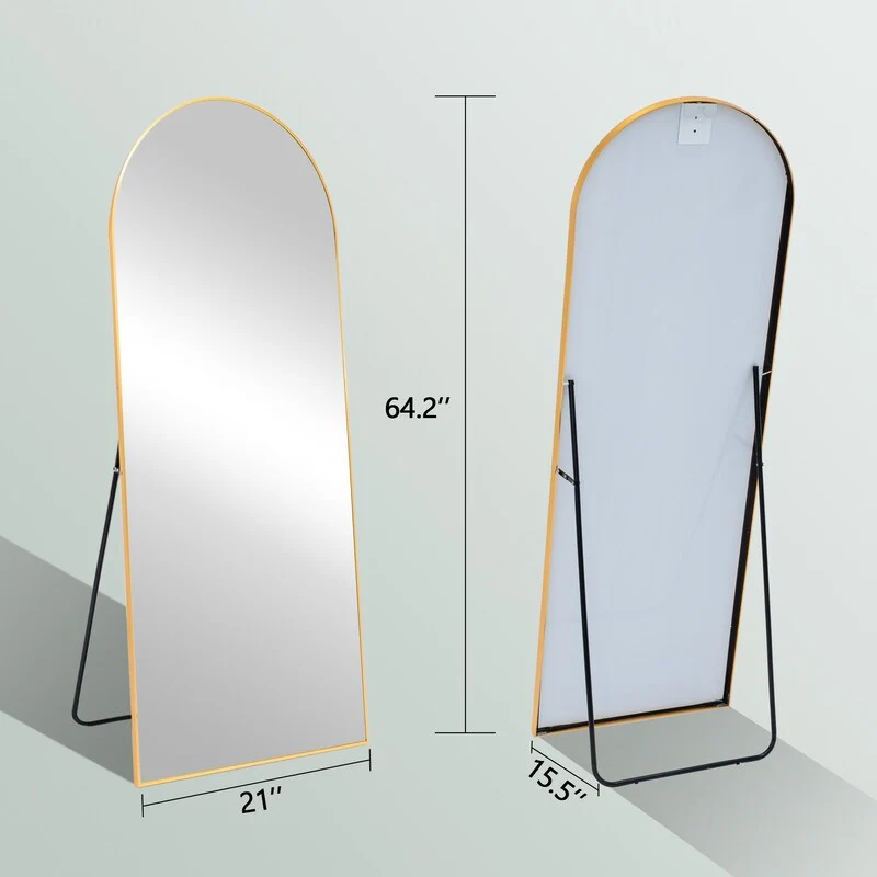 Upgrade your interior decor with this Modern Glam Arched-Top Full Length Floor Mirror with Stand. Perfect for clothing stores, salons, apartments or your own bedroom, this mirror is both decorative and functional. Correct your yoga poses in front of it, take a selfie or check out your workout results. With its U-shaped brackets and anti-skid pads, this mirror is also safe for homes with curious pets. This mirror is available in several sizes, it's free-standing and easy to hang on the wall, making it a great addition in any room. Crafted from high-quality MDF and glass, this mirror is sure to impress.