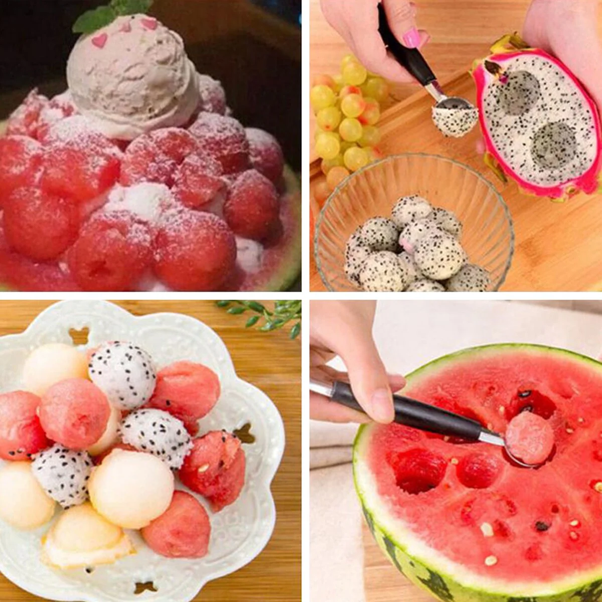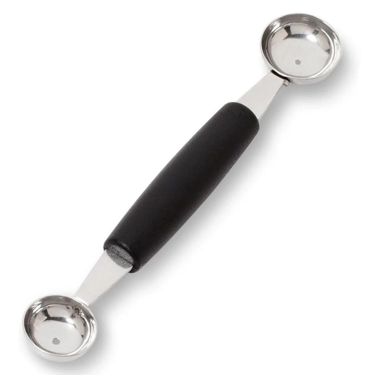Material: Stainless Steel Carve up balls from melons 2 different sized scoops Great for garnishing, fruit salads, etc. Rubber grip for easy handling