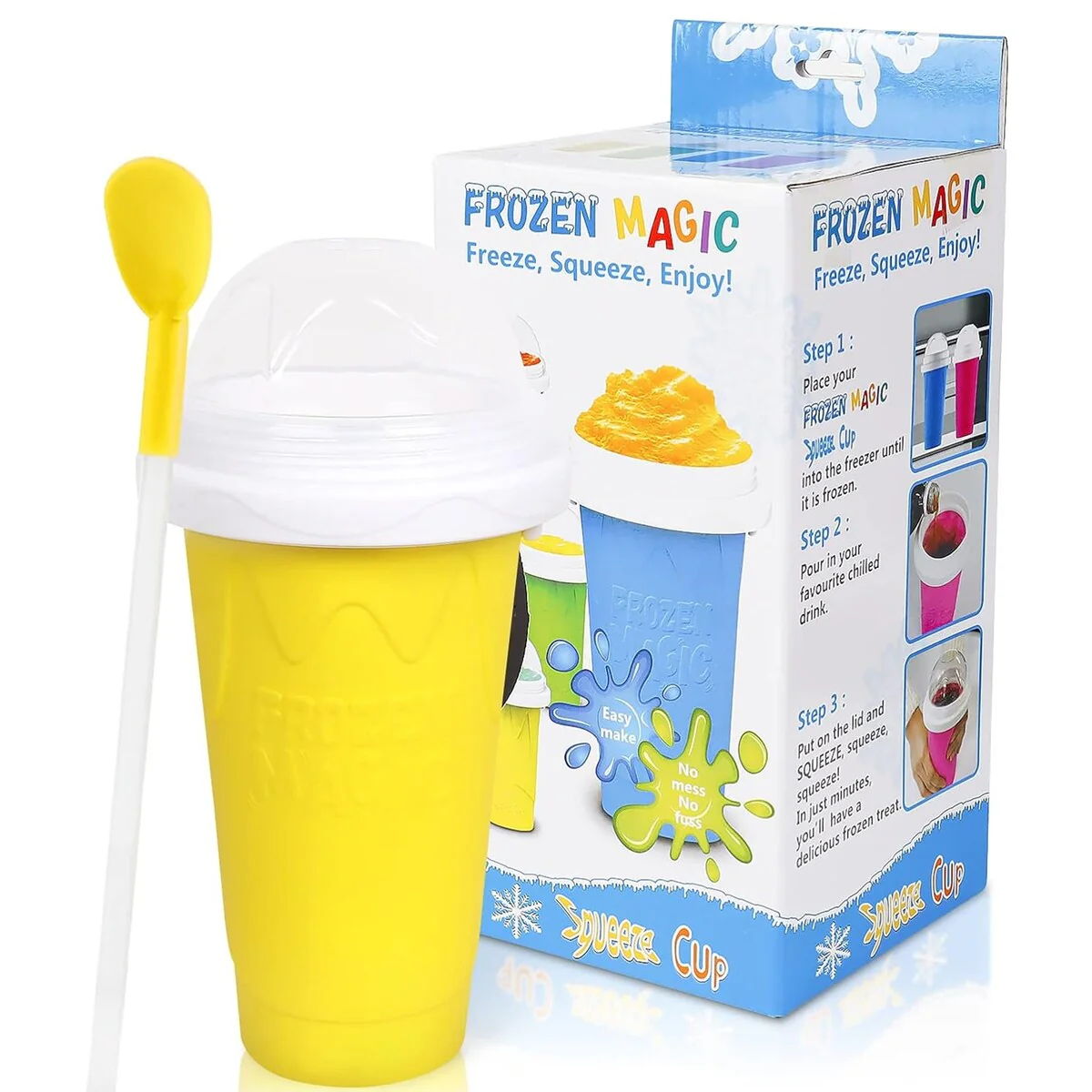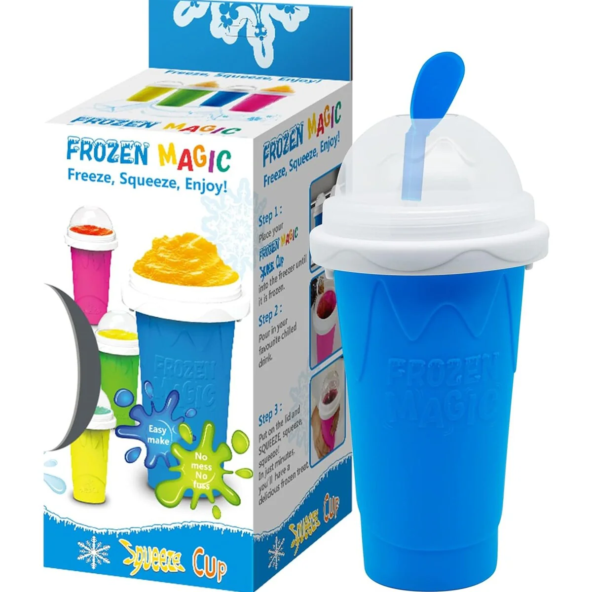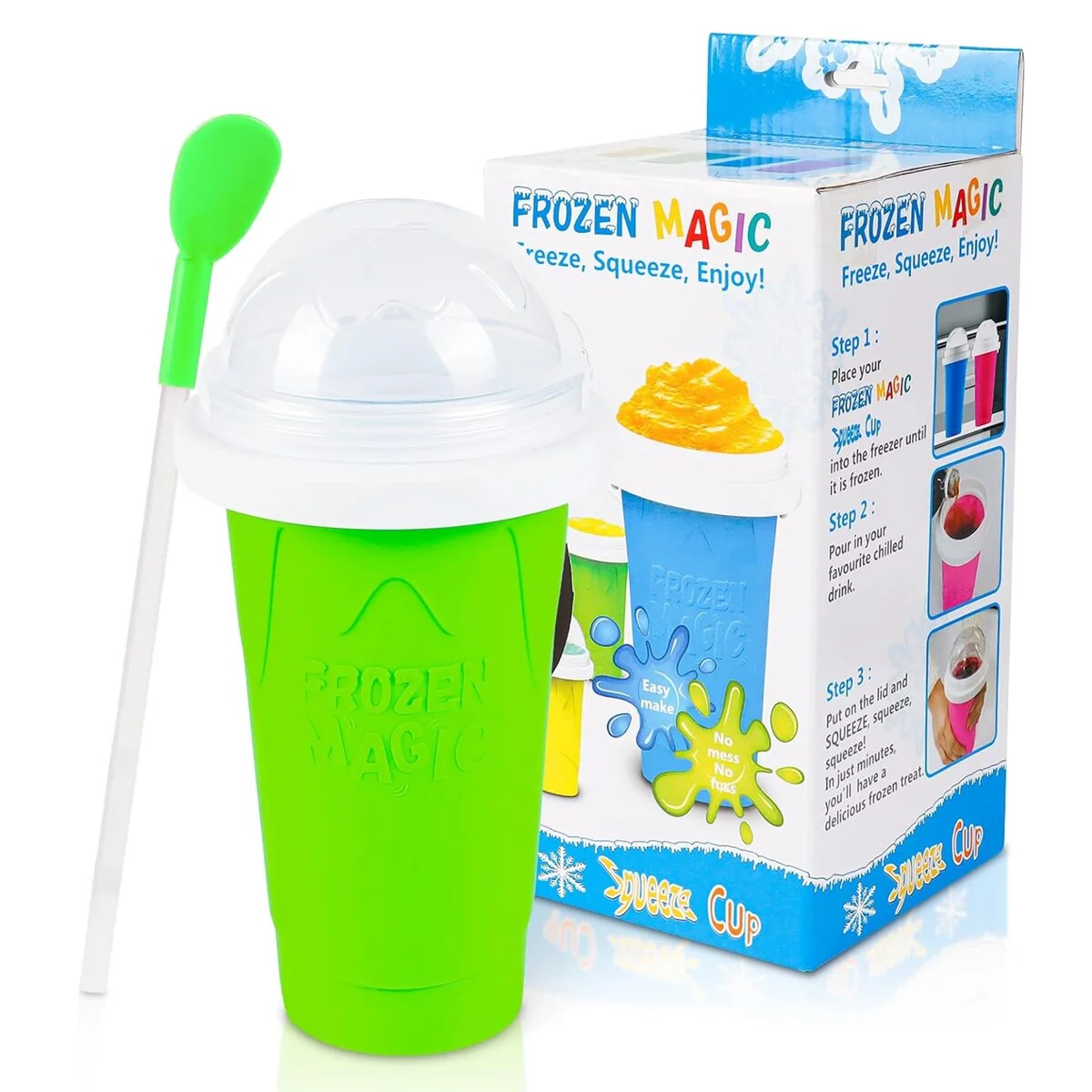 �Quick Frozen Magic Cup 锛�The Slushy Maker quickly turns your favorite drink into a frozen treat! The Slushy Maker is easy enough to be used by almost any member of your family. Chill the Slushy Maker in the freezer for 4-6 hours, remove, pour in your refreshment of choice, and squeeze the silicone cup. A one-minute massage is all that��s needed to slush-ify your drink to perfection. The reusable cup has a removable dome lid and handy, reusable spoon-straw to help you slurp down the slush.