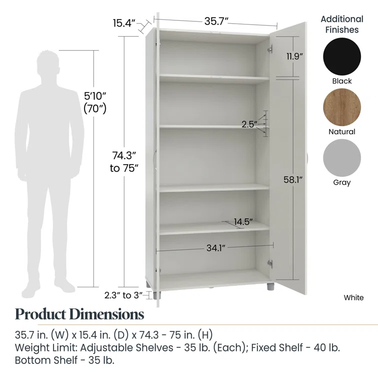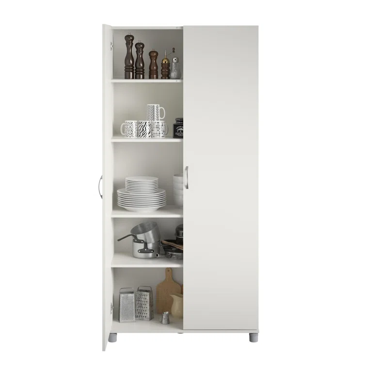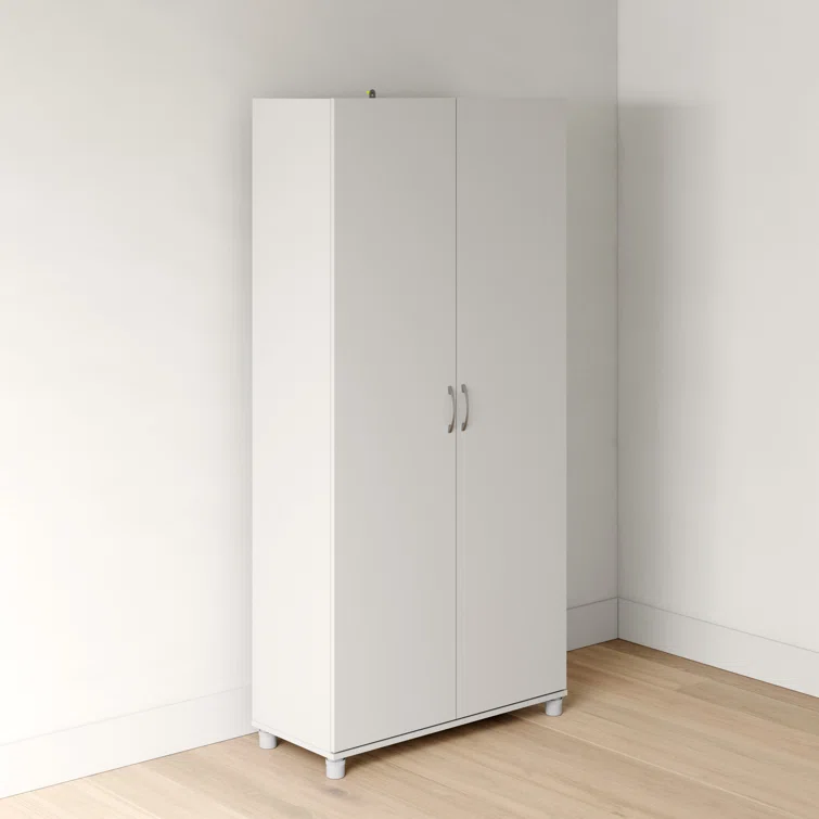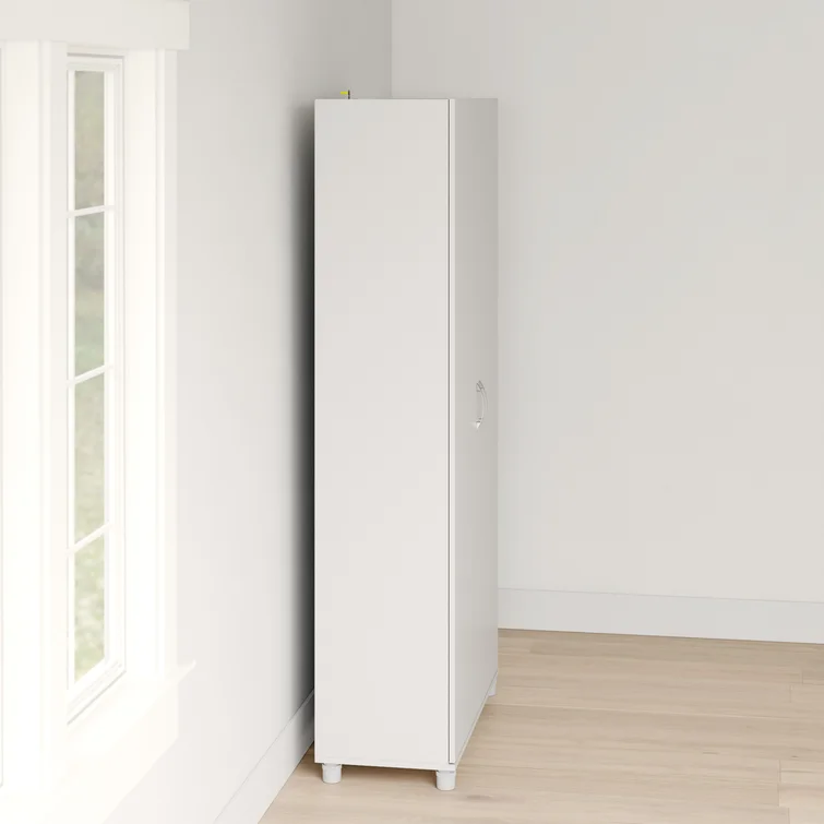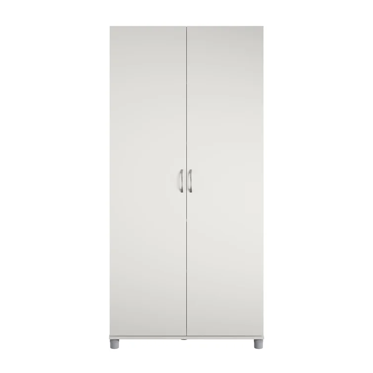 Organize your laundry room, garage, or workstation with this storage cabinet. Its sleek and understated design means you can effortlessly add this cabinet to your current arrangement. This cabinet features two doors with handles to provide your space out-of-sight storage. The doors open to reveal three adjustable interior shelves that will help you organize your tools or cleaning supplies. This storage cabinet arrives with wall anchoring hardware, so you can keep it sturdy if you have little ones running around. Assembly required.