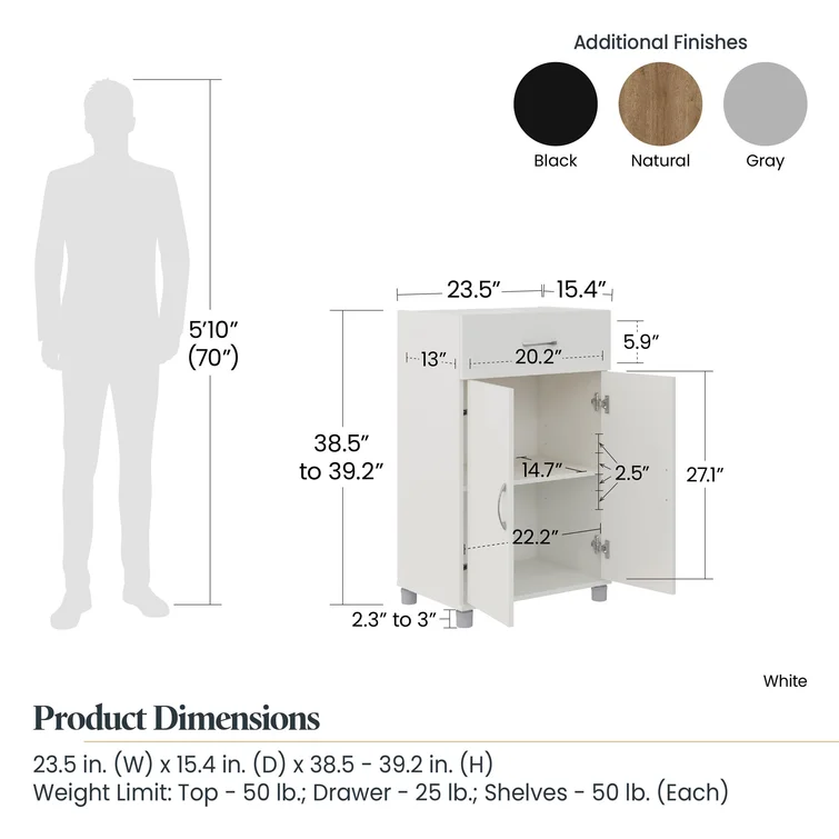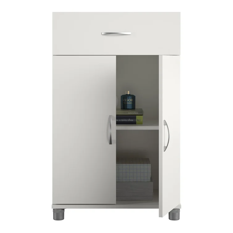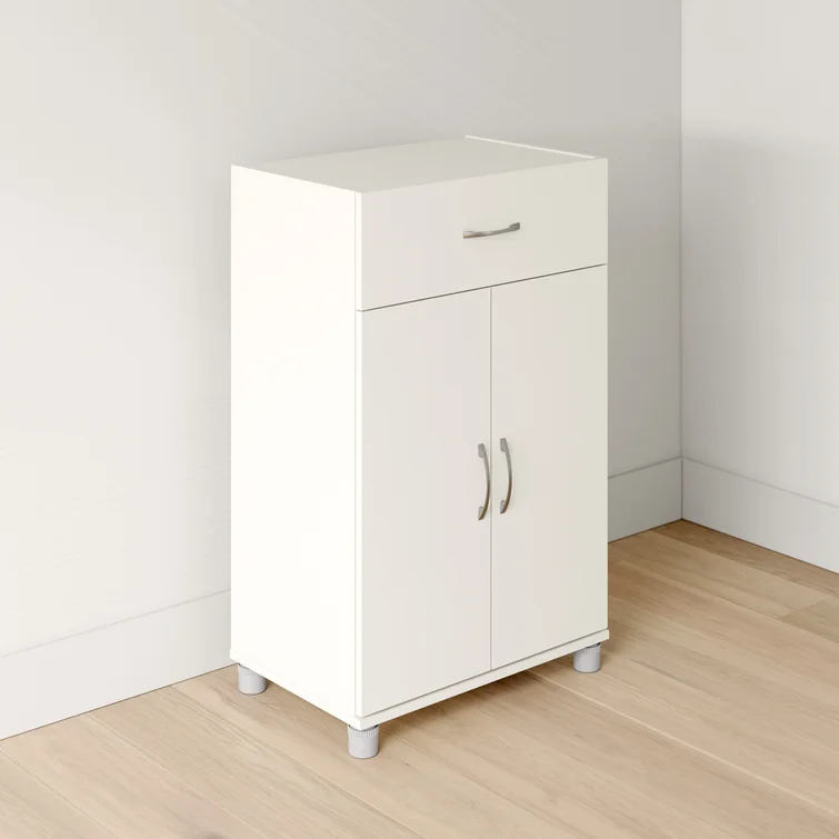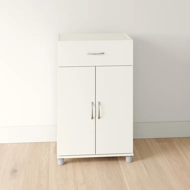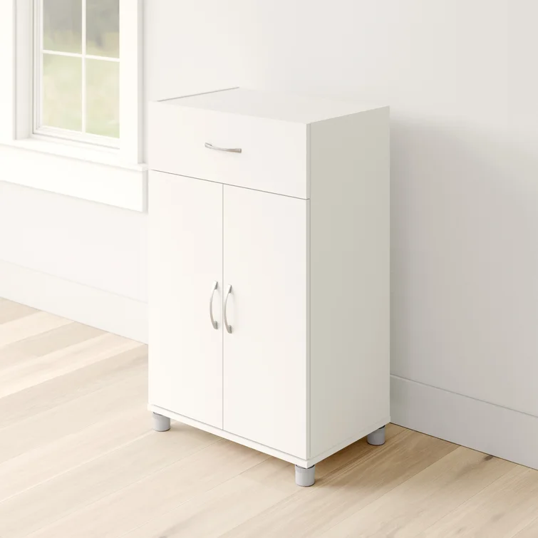 Organize your laundry room, garage, or workstation with this base storage cabinet. Its sleek and understated design means you can effortlessly add this cabinet to your current arrangement. Made from engineered wood, this cabinet features two doors and a top drawer with silver-finished handles to provide your space with out-of-sight storage. The doors open to reveal an adjustable interior shelf that provides more organization for your tools or cleaning supplies. This storage cabinet arrives with wall anchoring hardware, so you can keep it sturdy if you have little ones running around. It measures 23' wide so it can add to smaller spaces. Assembly required.
