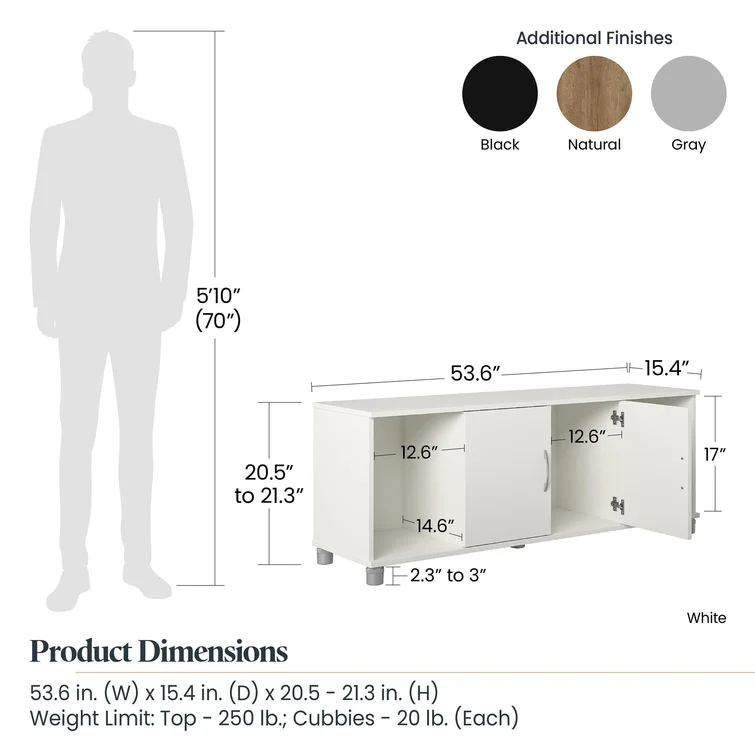 Add extra storage space to any room in your home with this 3-piece storage system, which includes a shoe storage bench, a wall cabinet, and a storage cabinet with 15 shelves total and 6 adjustable shelves. Made of engineered wood, the clean finish pairs with any decor so the Cabinet System can be used anywhere. Store and organize anything from office supplies to cleaning supplies and even kitchen pantry items. The adjustable feet make keeping your cabinets level on uneven floors simple. A wall anchor kit is included to secure the cabinets to the wall and prevent tipping injuries. Two adults are recommended for assembly.