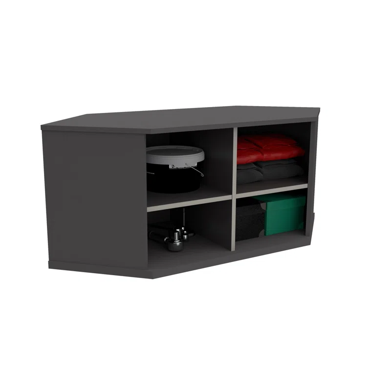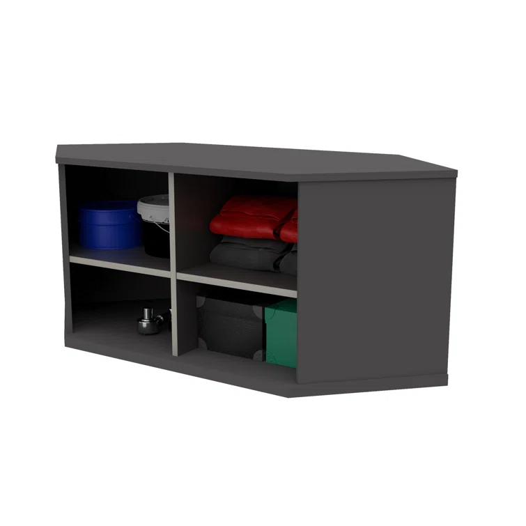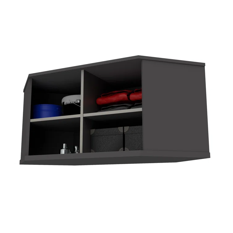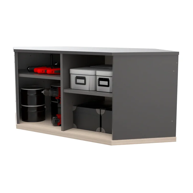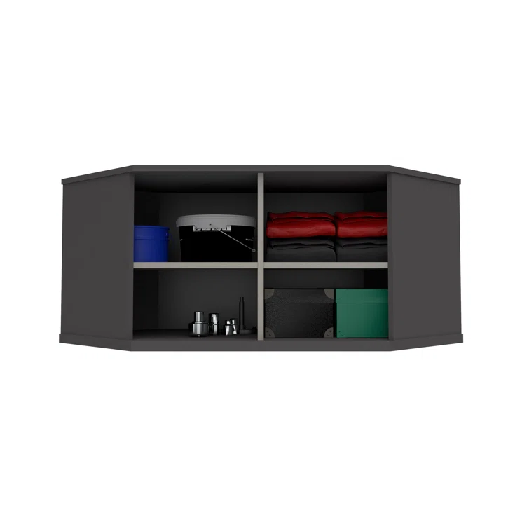 Cesare series wall-mounted corner garage storage cabinet by latitude run, finished in rich Dark Gray/Maple or Chantilly/Dark Gray. The storage area offers ample space with 4 shelves. This cabinet is just the right size to provide excellent storage. Constructed from manufactured wood laminated on both sides with durable melamine which is stain, heat, and scratch-resistant. Mounting hardware included.