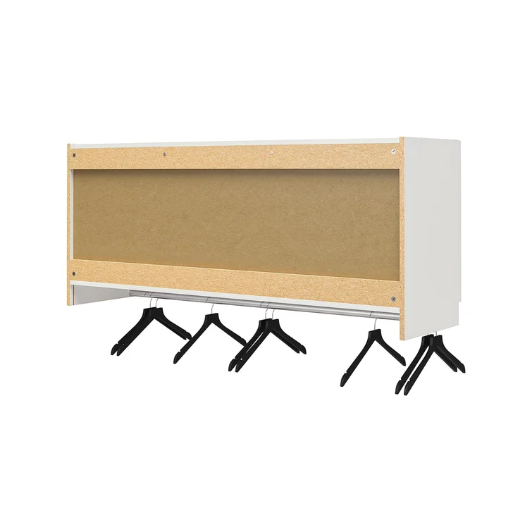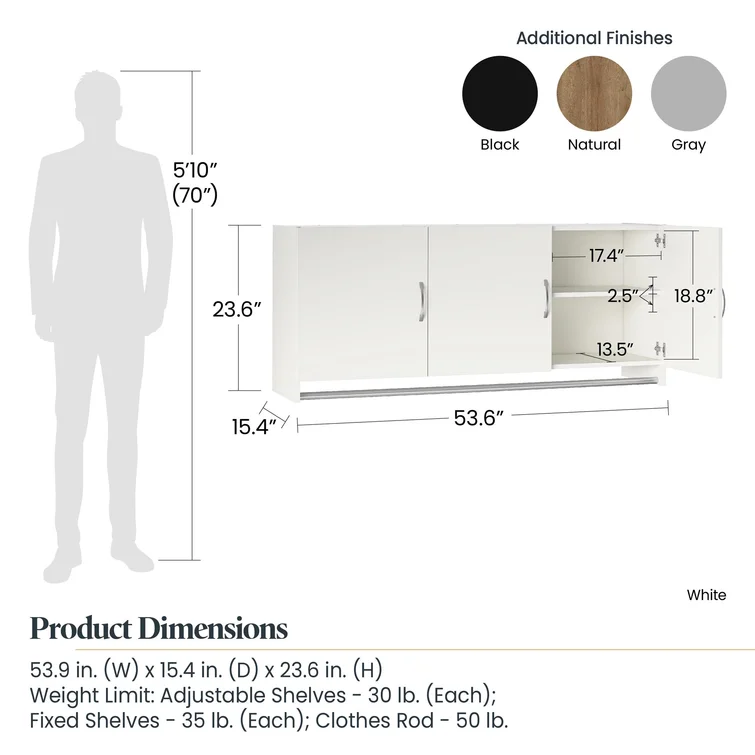 - The wall cabinet with hanging rod ships flat to your door and 2 adults are recommended to assemble it. Each fixed shelf will hold up to 35 lbs., and each adjustable shelf will hold up to 30 lbs. The clothing hanging rod will hold up to 50 lbs.