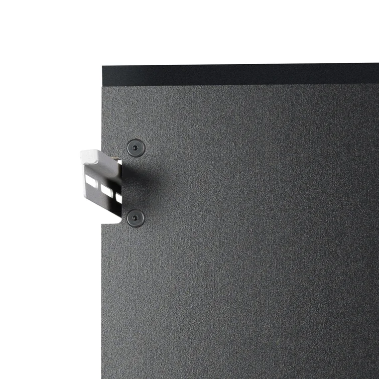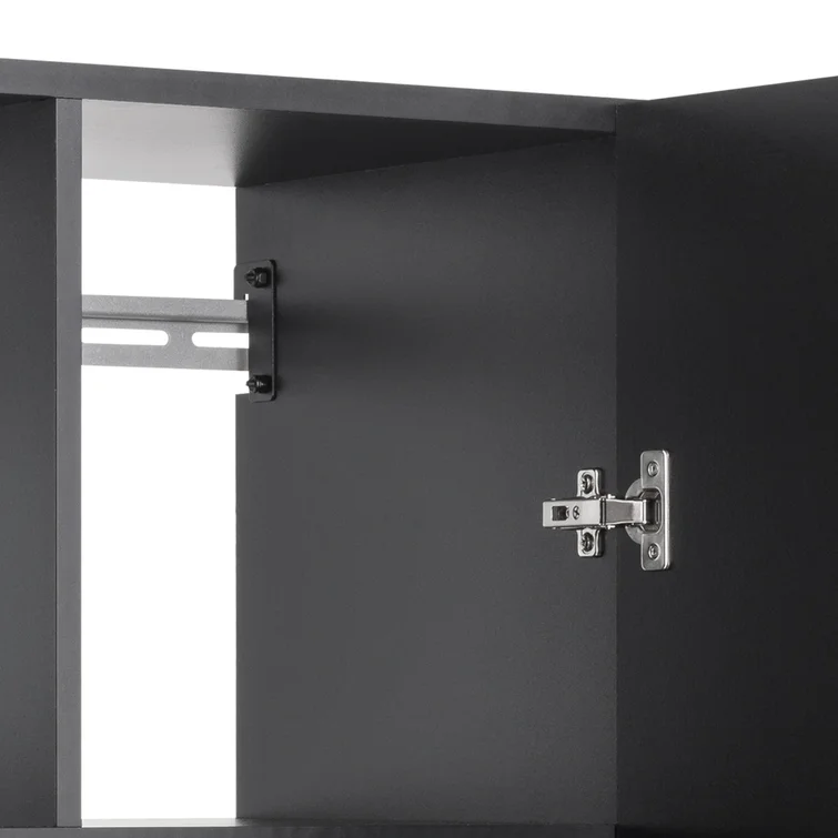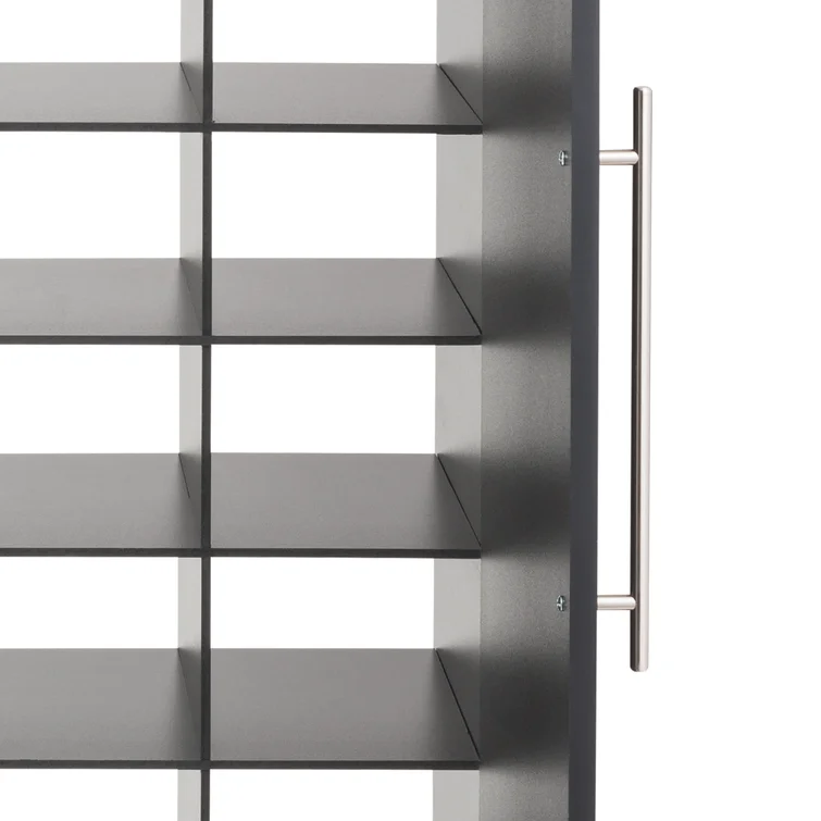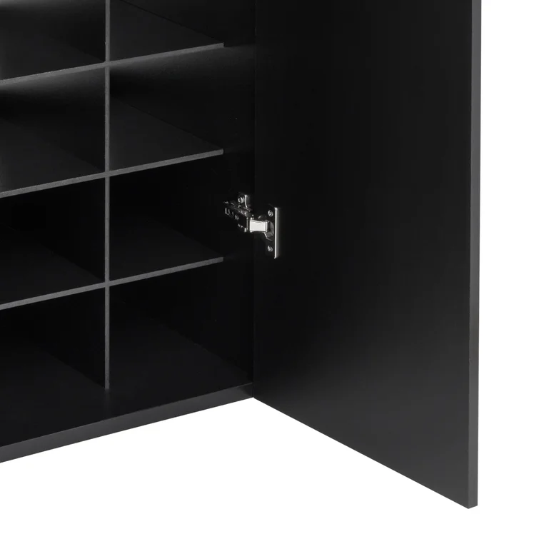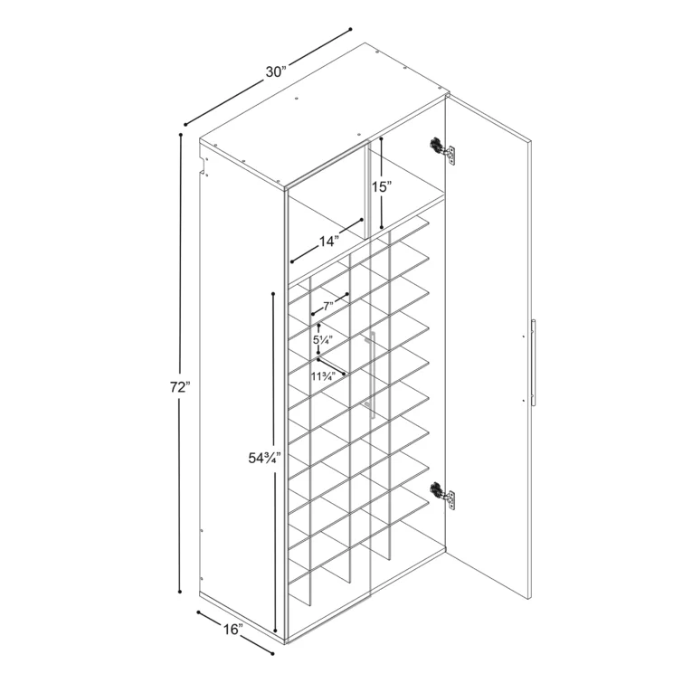 This wall-mounted storage solution features two sophisticated clean line doors on adjustable hinges, 30 internal shoe cubbies that accommodate up to a men's size 13, and one fixed upper shelf with a divider for additional accessories. Designed to be secured into a sturdy wall with the included heavy-duty metal rail and hook system to keep your items safe and provide an easy clean-up on the ground underneath. This durable cabinet ships flat-packed and ready to be assembled upon delivery with an instructional booklet, hanging rails, and fastening bolts. This unit is made with non-toxic, CARB-2-compliant laminated composite woods.