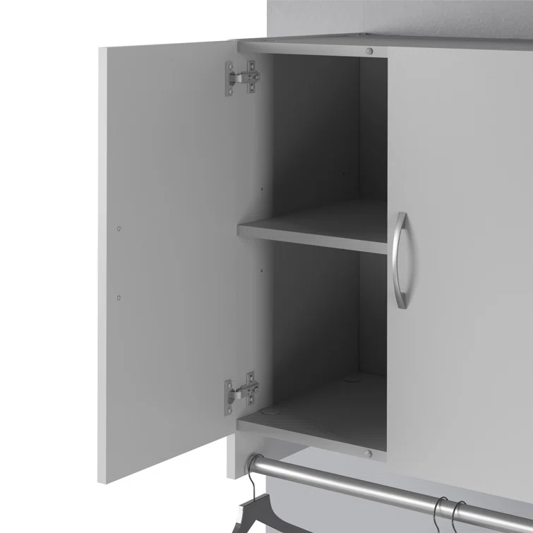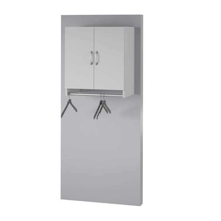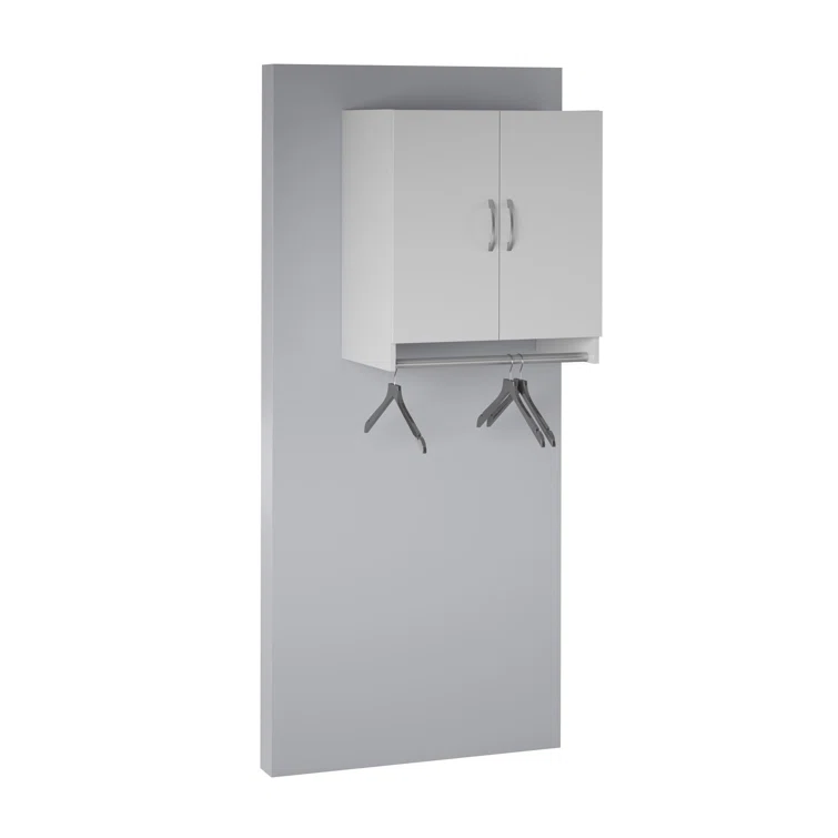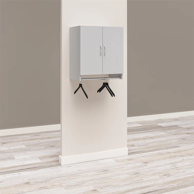 This 2-door hanging cabinet provides extra storage for any unused wall space. It comes with a metal rod for coats, backpacks, and other items, so they're ready for you as you head out the door. Made from engineered wood with a neutral finish, it easily matches your current aesthetic. Inside the double doors is a cabinet with shelf space for clothes, blankets, and more. It measures 26.9' tall and 23.5' across, so it's ideal for smaller laundry areas, mudrooms, and garages. Use it as a standalone piece, or combine it with additional storage items (sold separately). Wall-mounting hardware is also included for your convenience.