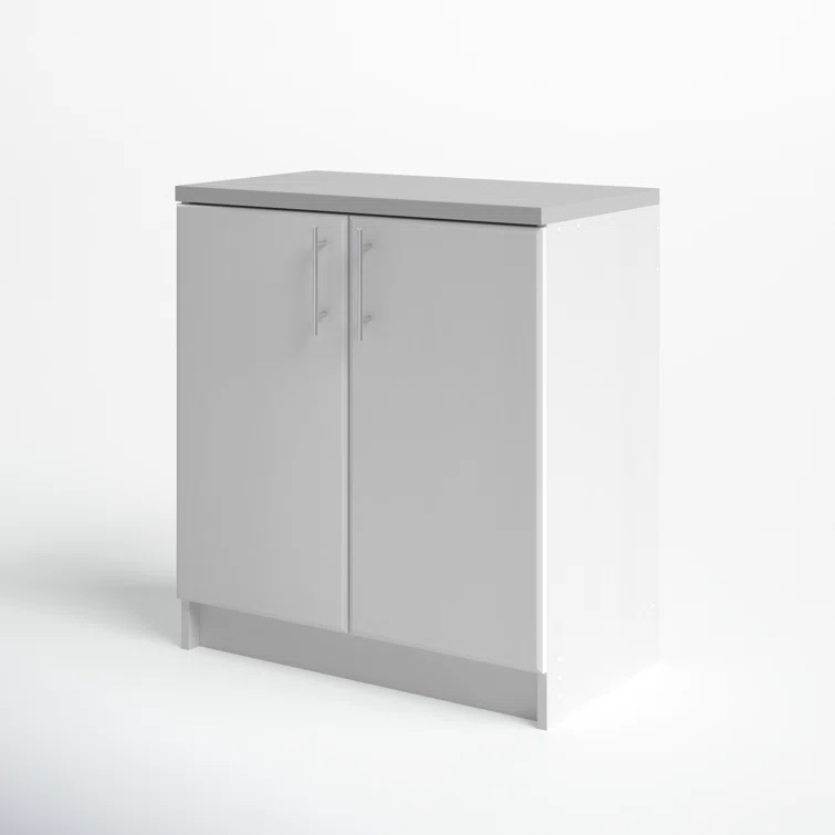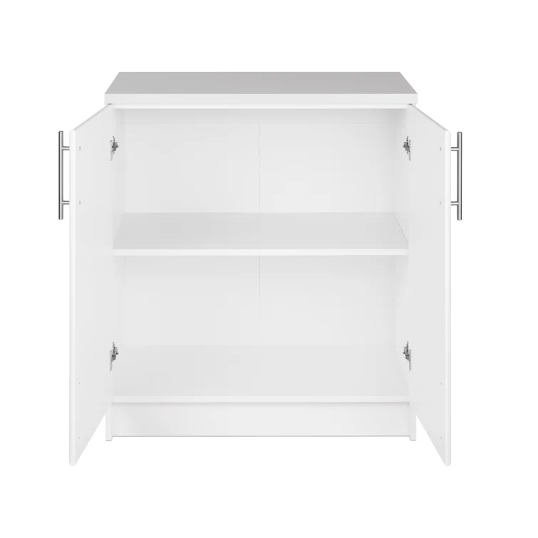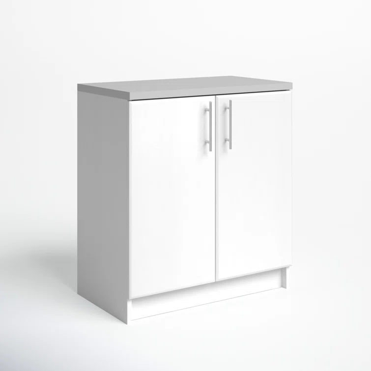 This freestanding 2-door cabinet is just right for your laundry room, utility room, garage – or any place where you could use a little extra storage. It is made from engineered wood in a neutral hue and has a one-inch melamine countertop that serves as a durable work surface. Open the twin cabinet doors to access the two shelves (one adjustable) that accommodate everything from tools to cleaning supplies. The sleek hardware is designed to be easy to grasp. This cabinet comes with a five-year warranty from the manufacturer and requires full assembly.