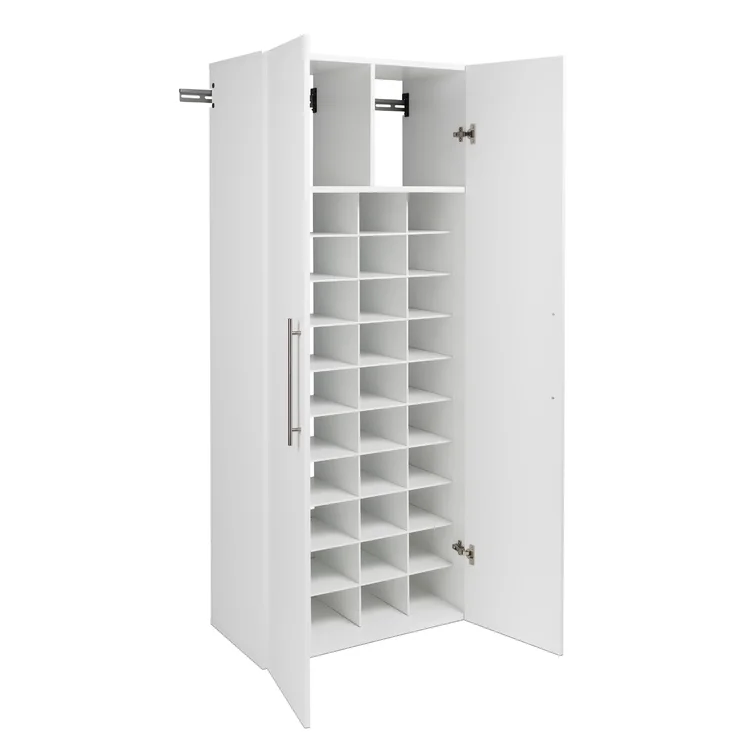 - Set J includes A 30' shoe storage cabinet featuring 1 upper fixed shelf with a middle divider (0.75' thick) and 30 individual shoe cubbies large enough to hold a pair of size 13 men’s shoes.