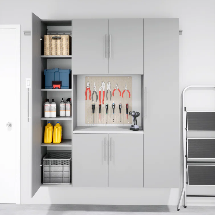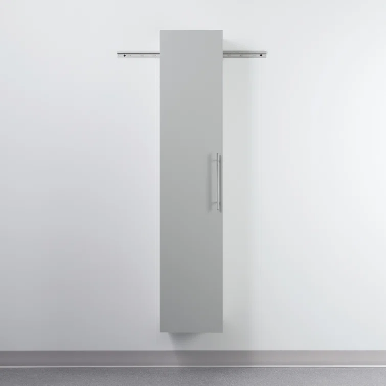 This storage cabinet featuring 3 adjustable shelves and 1 fixed shelf with a middle divider offers convenient and versatile storage for a variety of items to maximize the space in your garage, laundry room, office, or workshop. It mounts securely to any wall with the heavy-duty metal rail and hook system, making it easy to clean beneath the cabinet while protecting your stored items from water and dirt. Constructed from non-toxic, CARB-2 compliant, laminated composite woods with satin nickel finished handles and adjustable hinges, this cabinet withstands years of quality use. It ships ready-to-assemble and includes all hanging rails and fastening bolts as well as an instruction booklet for easy assembly.