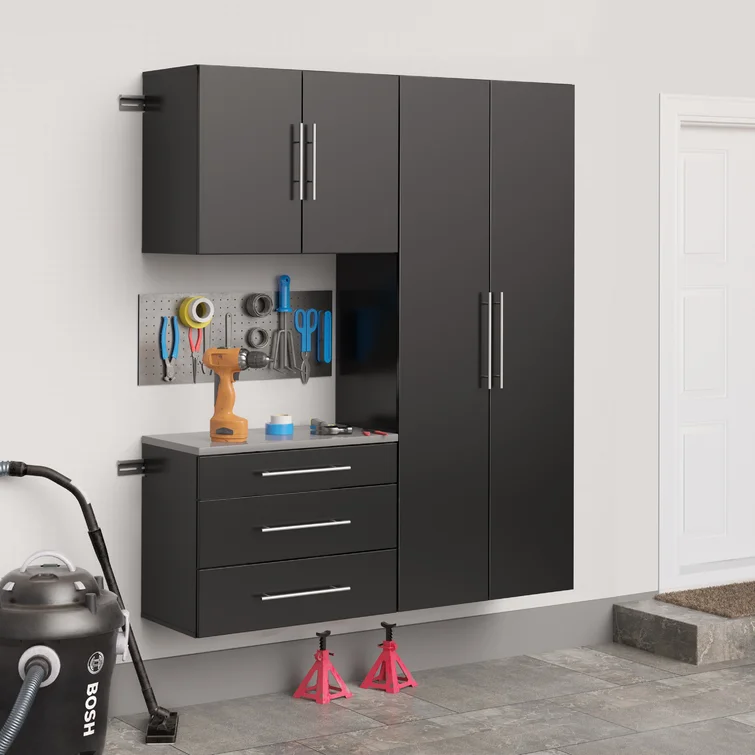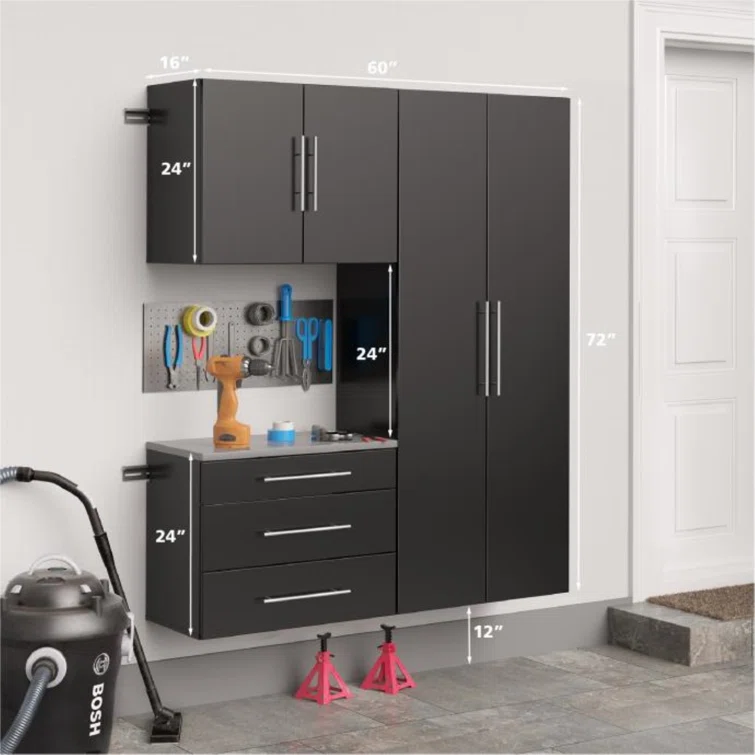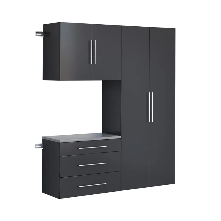 Whether you’ve fixed everything that’s ever broken in your home, or you’re just learning the ropes of home improvement, you need an organized space to work on your projects. With ample storage space and effortless utility, this storage cabinet is the perfect solution. Featuring one large storage cabinet, one upper storage cabinet, and one base cabinet with three drawers, this set has everything you need. The laminate finish adds versatility and understated appeal to this design, while the satin nickel finished handles bring a touch of sophisticated flair. Install these pieces together in your basement or garage, then fill them with your tools to organize your space.