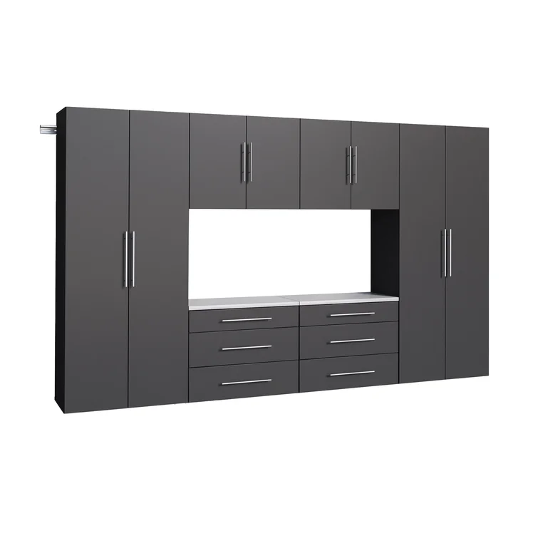 This storage system brings wall-mounted drawers and cabinetry to your garage, basement, or workspace. Each piece is made from engineered wood with a neutral finish and features a streamlined rectangular silhouette. This storage system includes four double-door cabinets with 10 combined shelves and eight adjustable. Each shelf holds up to 30 lbs., offering space for everything from toolboxes to sports equipment. Six included drawers let you tuck away smaller essentials, and a melamine work surface lets you spread out your next project. This cabinet set comes with wall-mounting hardware to aid with setup and blends in with nearly any design scheme.