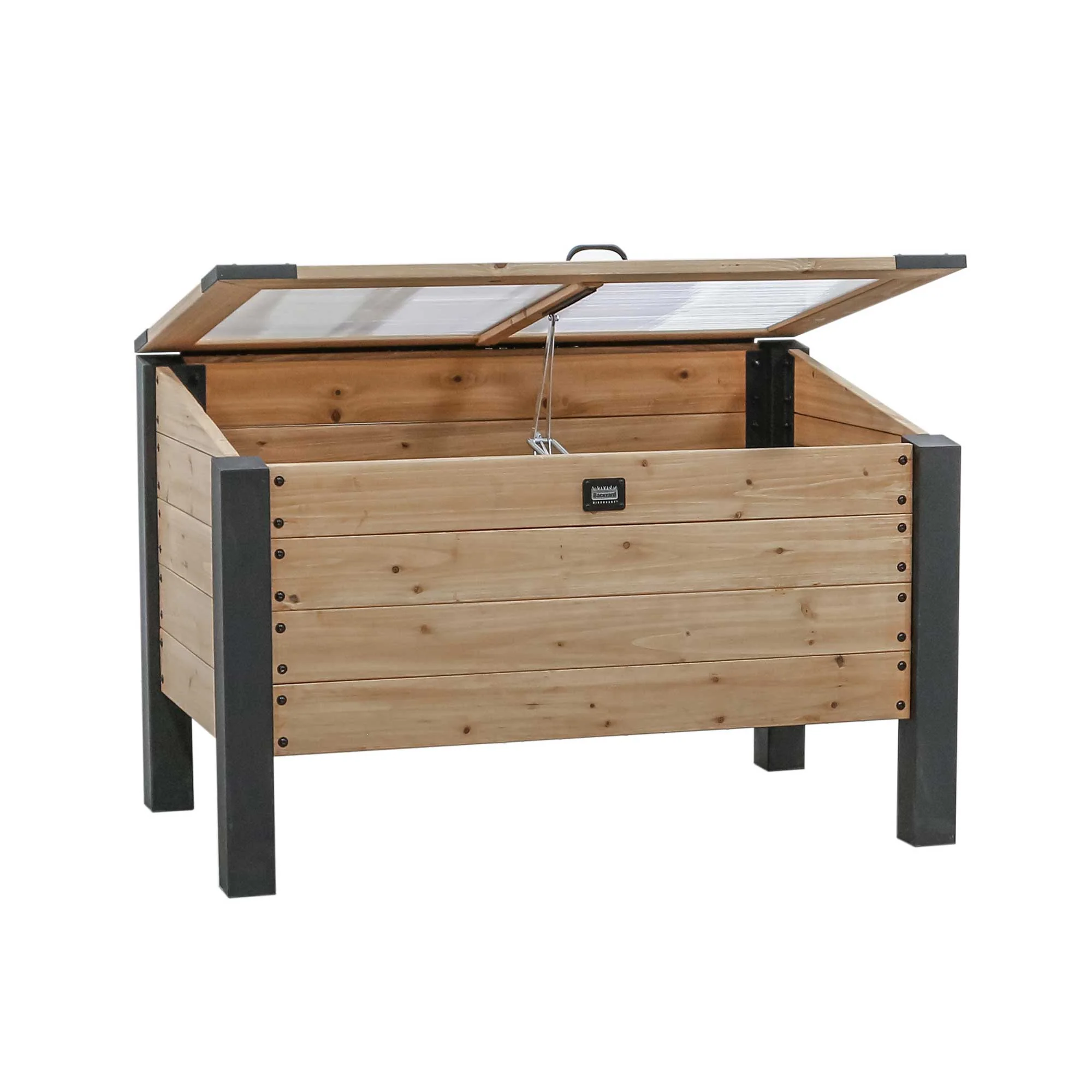 Extend your favorite season — the gardening season! — with our Aggie Cold Frame Box. Crafted from beautiful cedar wood, supported by powder-coated steel accent legs, and boasting a double-wall polycarbonate lid and interior liner, your plants will be protected from wind, cooler temperatures and first frost. It also features an innovative electricity-free, temperature-activated hinge on the lid that will automatically open to vent the box when the inside temperature gets too high. And as the temperature drops the lid will automatically close. Now, you can harvest later into autumn and early winter, then plant and harvest earlier in spring. With the Aggie Cold Frame Box, you can make the growing season itself grow!