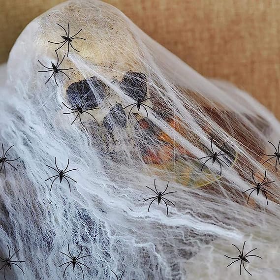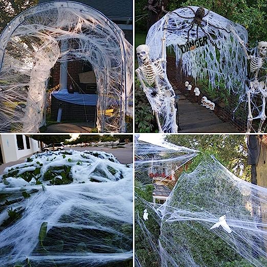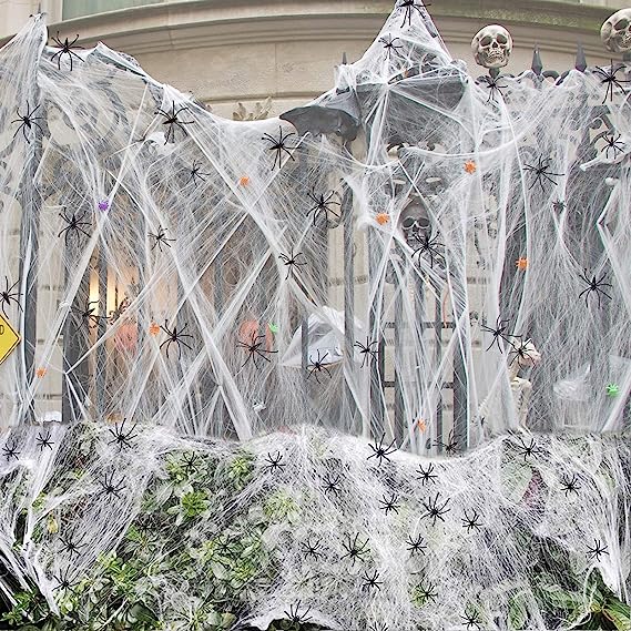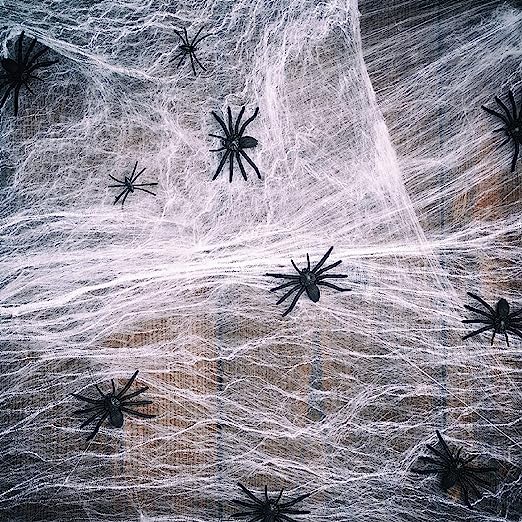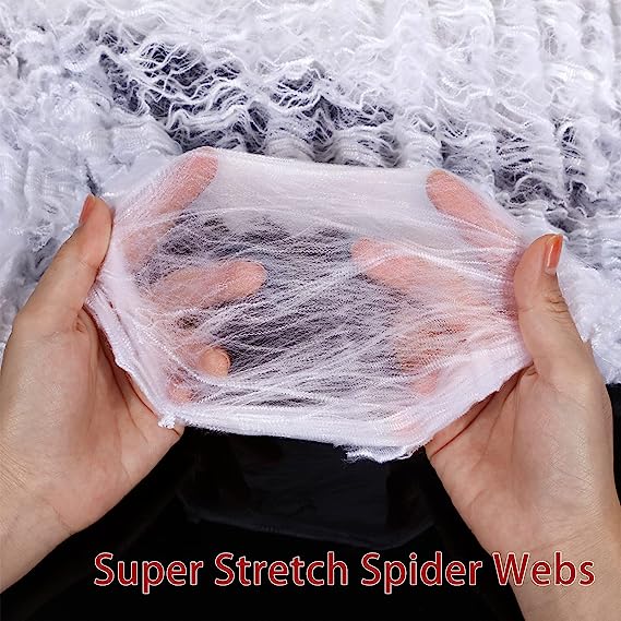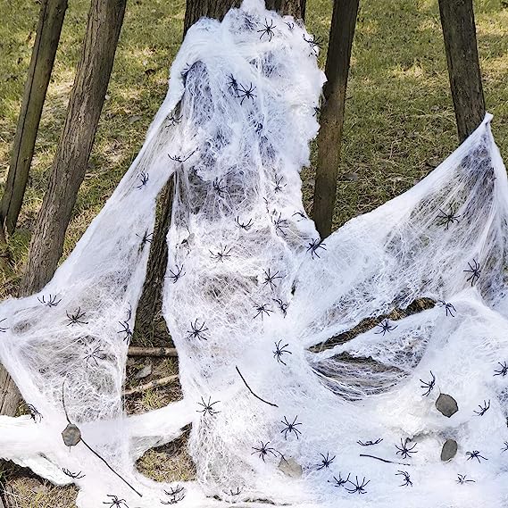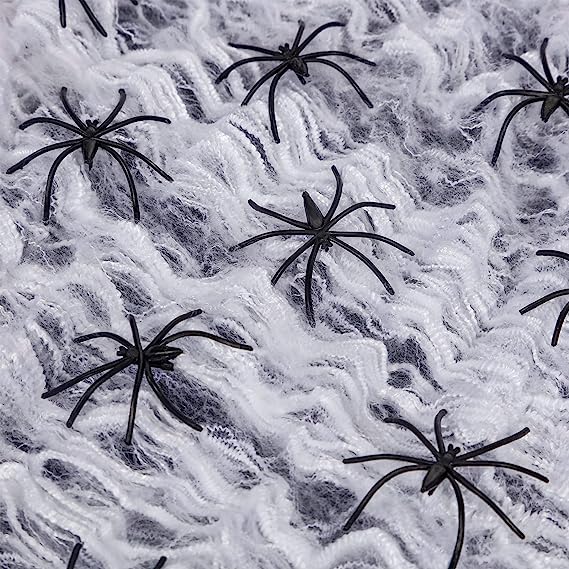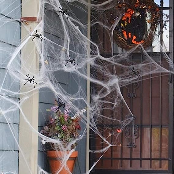 10.6 oz (300g) ultra stretchable spiderwebs are enough to cover up to 1400 sqft area, good enough for big house backyard, large front yard, windows, stairs, walls & furniture. Our Spooky Spider web is durable in all weather conditions and easy to remove without damaging properties.