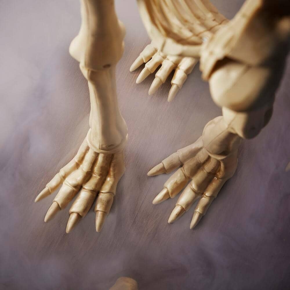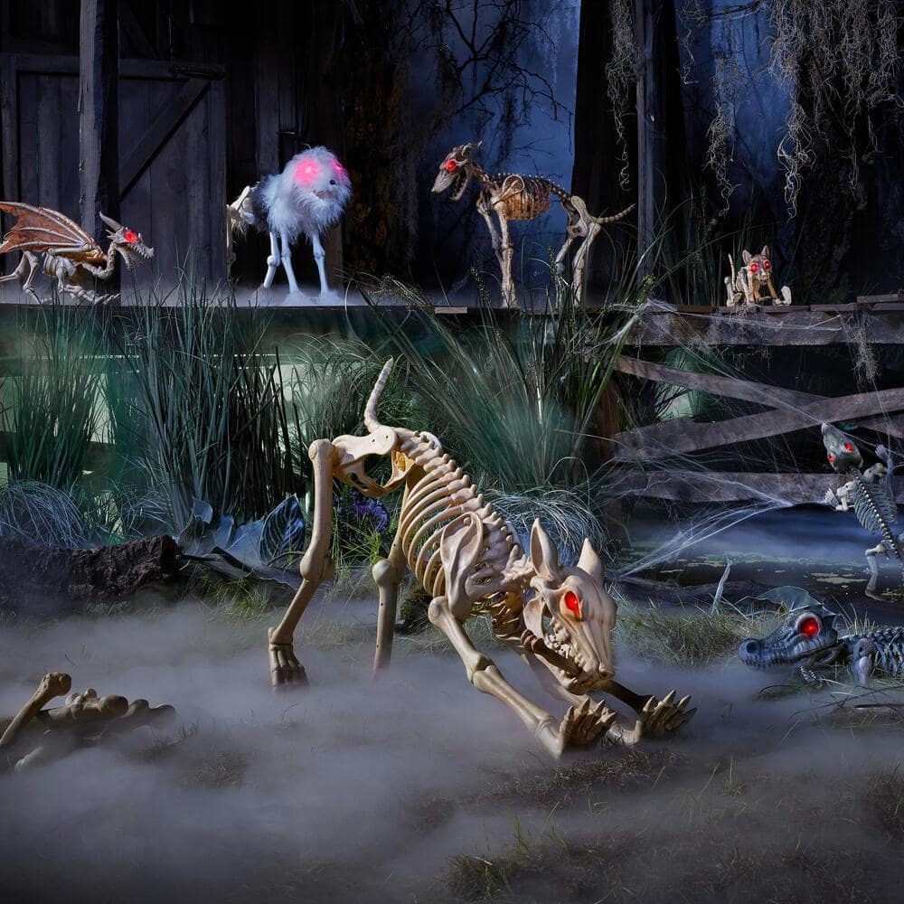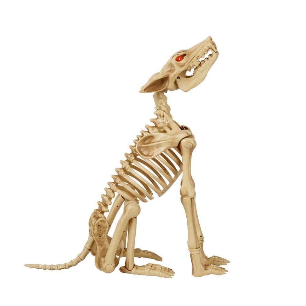 The 2.5-foot poseable animated LED skeleton wolves add a menacing flair to your Halloween display. The limbs are poseable to let you position the wolves in a sitting or standing position. Powered by LEDs, the glowing red eyes stare creepily at your guests for an otherworldly vibe. This two-pack of 2.5-foot poseable animated LED skeleton wolves features a sound sensor, activating the mouth to move and the head to tilt while howling sounds play in sync with the movements.