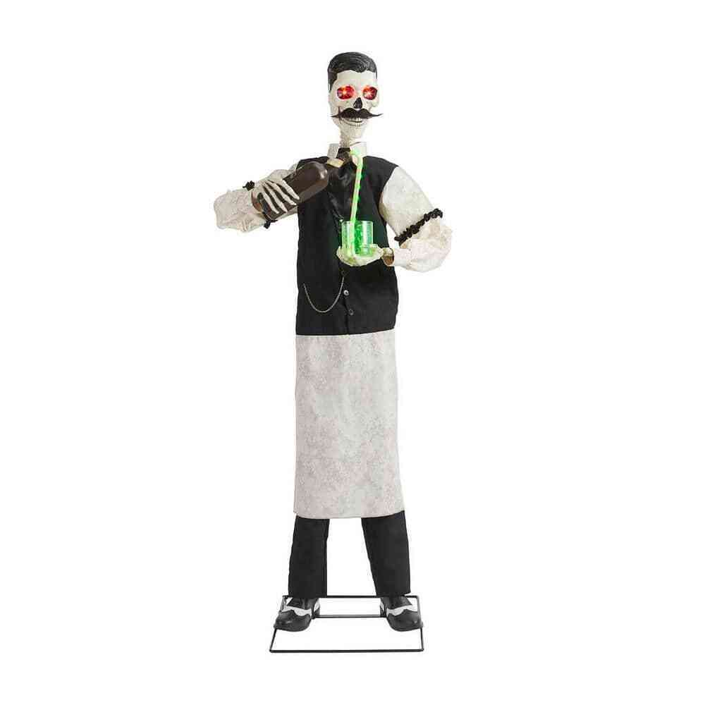 Stir up scares with this 6 ft. Animation Death Scientist. It features LED-powered eyes, bottle and glass for a ghoulish glow. Watch as the mouth and jaw move and tell you some creepy phrases.