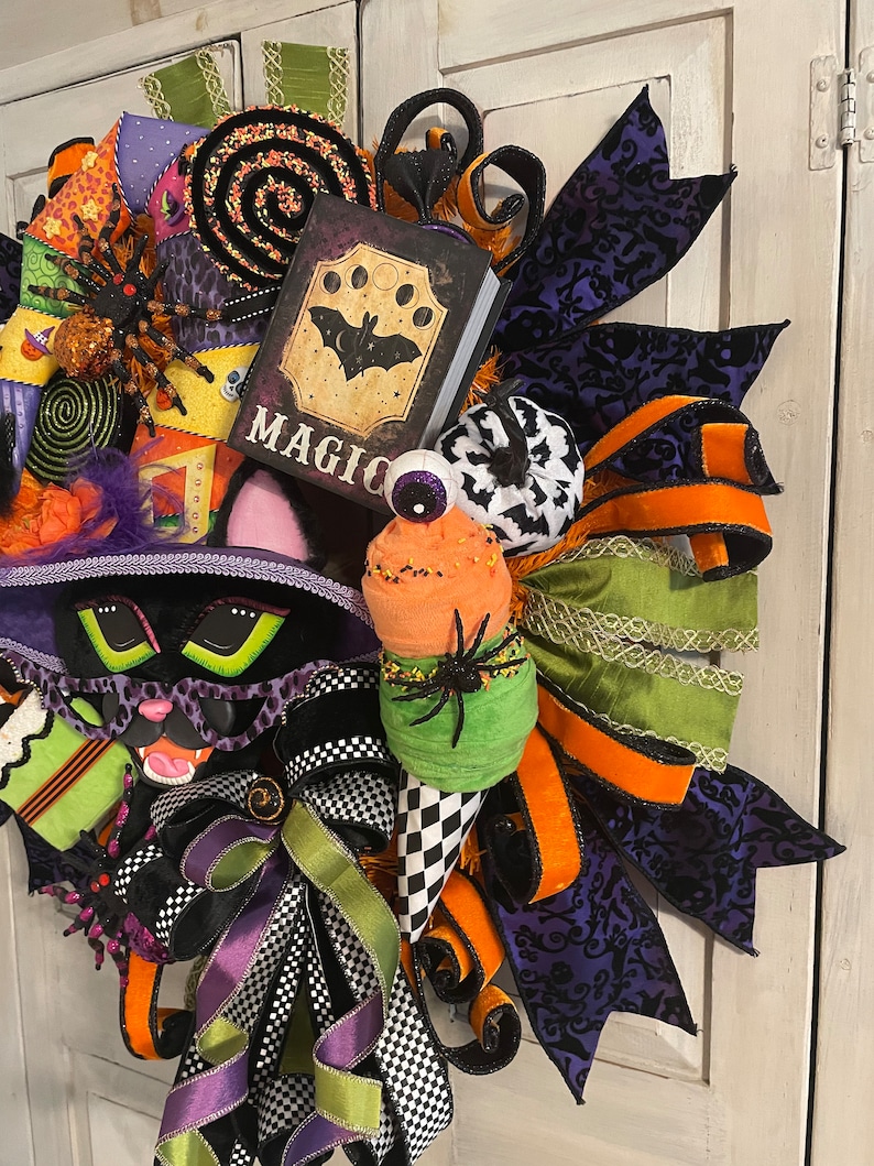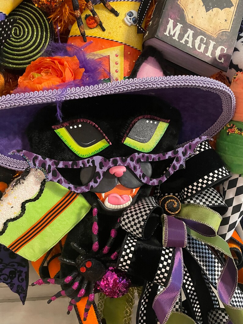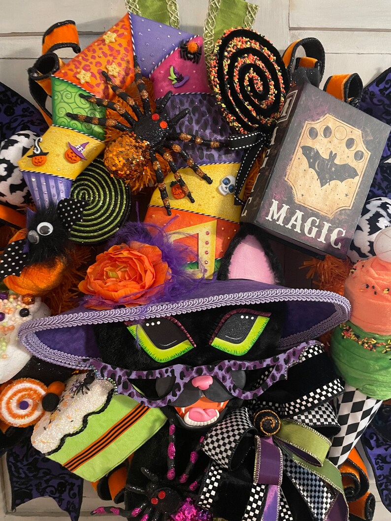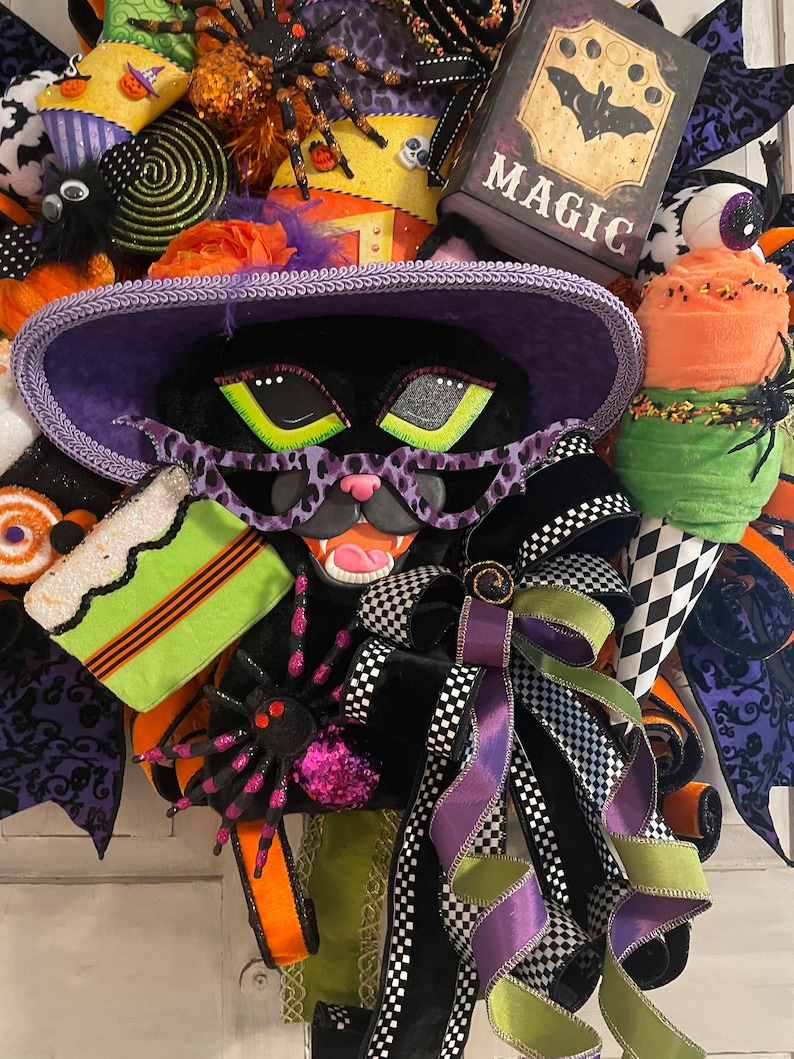 Designed on an orange pine wreath base, this edgy black cat wreath attachment with leopard print sunglasses is purrfect for Halloween. The wreath features a magic book, spiders, bats, pumpkins, a piece of cake, lollipops, an ice cream cone and is embellished with designer ribbon.