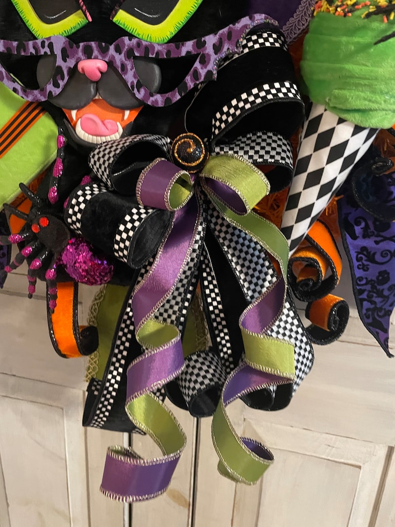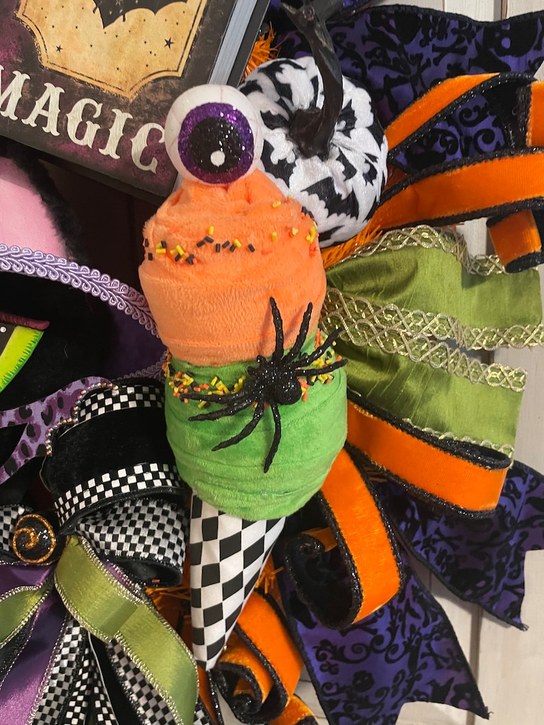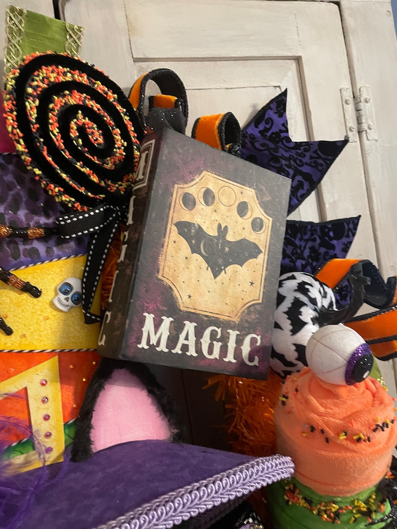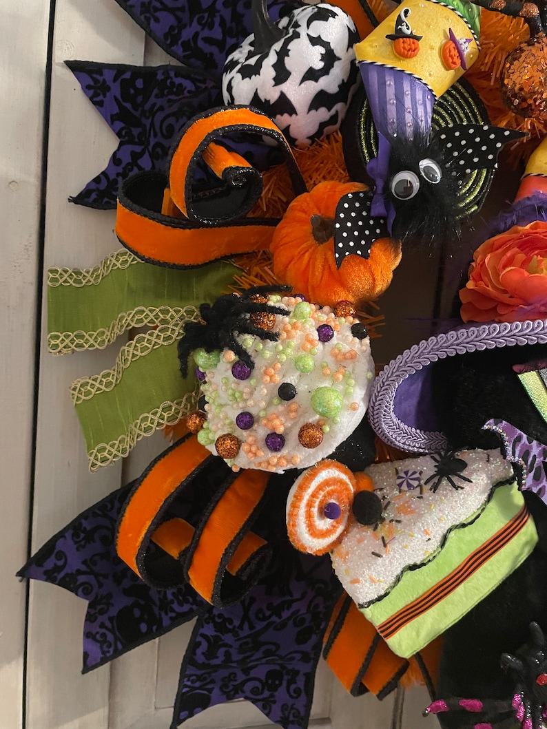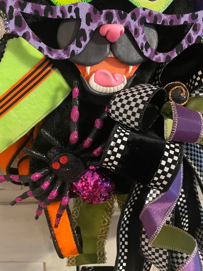 Designed on an orange pine wreath base, this edgy black cat wreath attachment with leopard print sunglasses is purrfect for Halloween. The wreath features a magic book, spiders, bats, pumpkins, a piece of cake, lollipops, an ice cream cone and is embellished with designer ribbon.