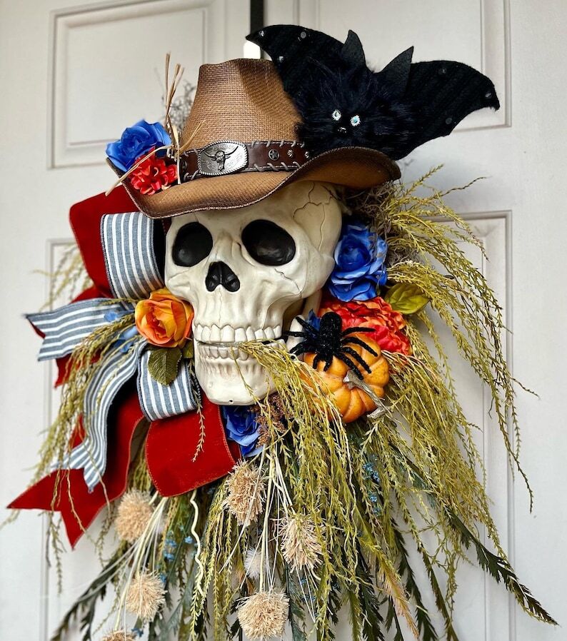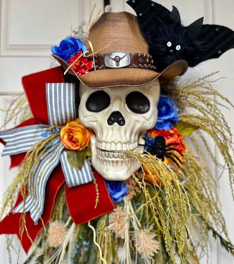 An extra large Cowboy skull wreath has a little pop of Halloween. This design features a brown cowboy hat, handmade black bat, pumpkins, blue and orange floral and more. Luxury Ribbon both orange and blue in two different sizes makes this design perfect!! He’s awesome!!