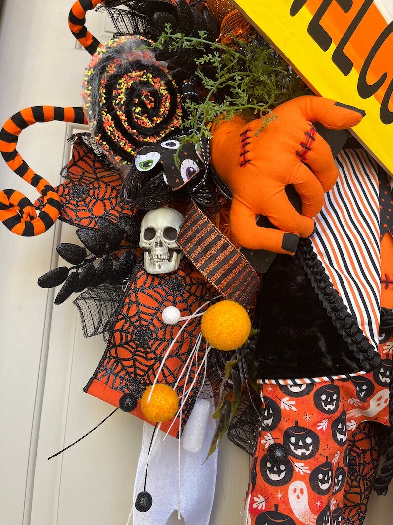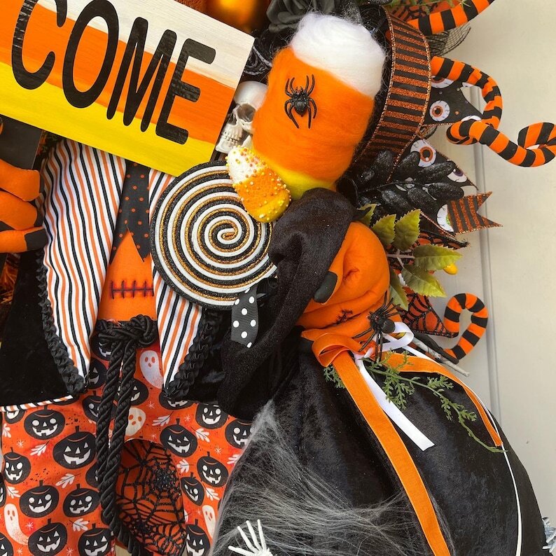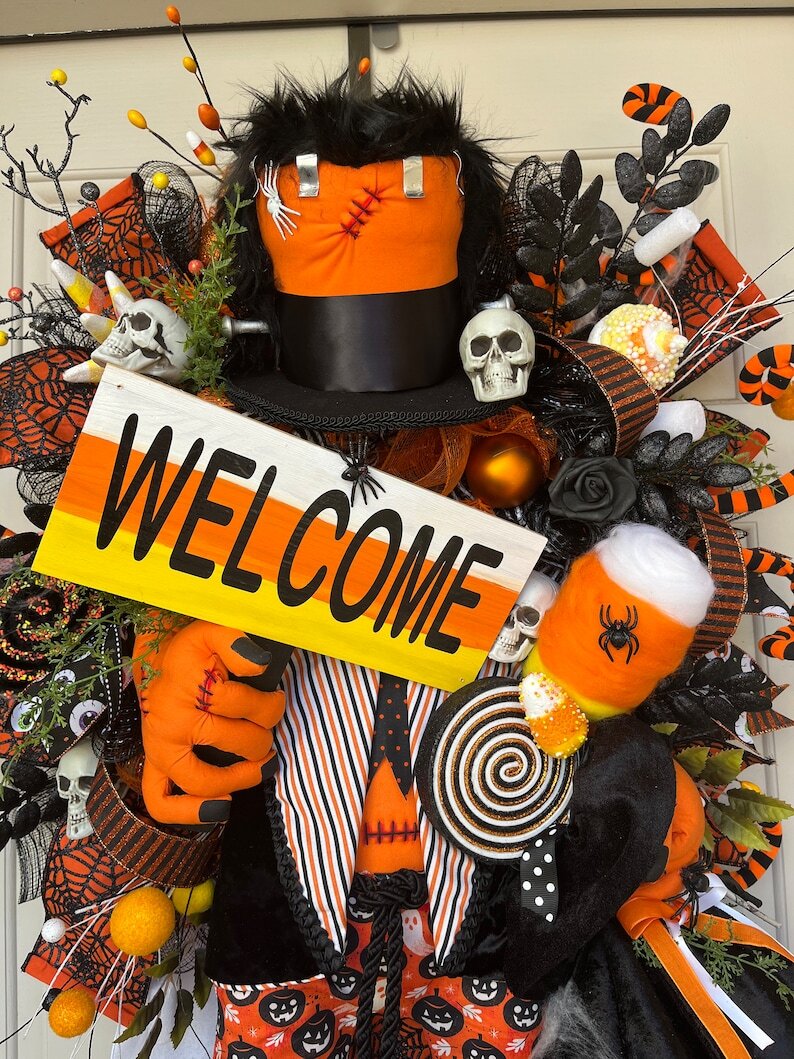 This design features a handmade Frankenstein attachment using high quality material. Accented with orange and black Halloween sprays, white and black spider, skulls, faux Halloween candy along with a handmade sign and black candy bag. Matching luxury ribbon helps to make the design pop! You and your guest will love it!! He’s perfect for Halloween!