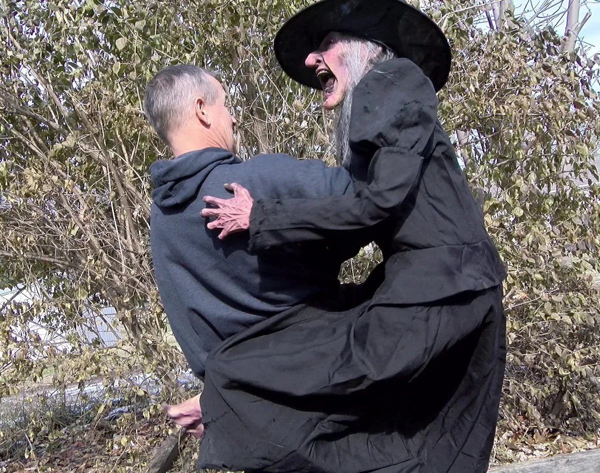 This Hagitha the Witch Attack Line Puppet comes dressed in a black, period costume with witch hat and all the amazing features as our Attack Line Puppets, including a 2X, gray hoodie/harness with fake, removable fist disguise so that your puppeteer looks like Hagitha just jumped on them and is riding them instead of a broom. You can choose which style of eyes you'd like for your witch puppet - Wicked or Mismatched. Comes with pre-loaded audio so she is ready to use out of the box when you receive her. Custom audio in character voices are available for additional charge. Contact VFX for more details.