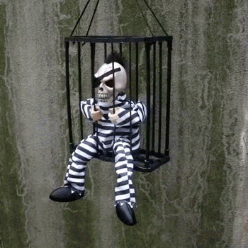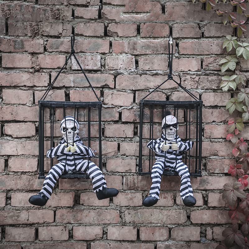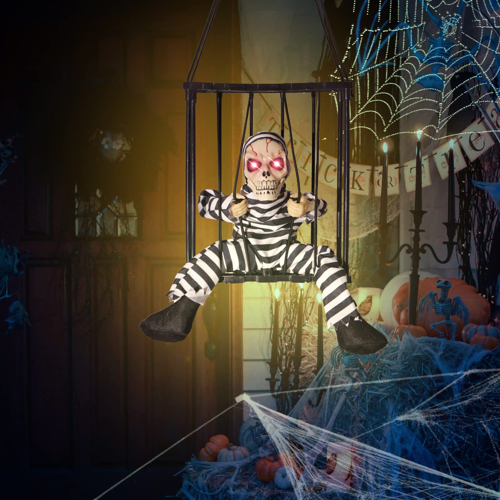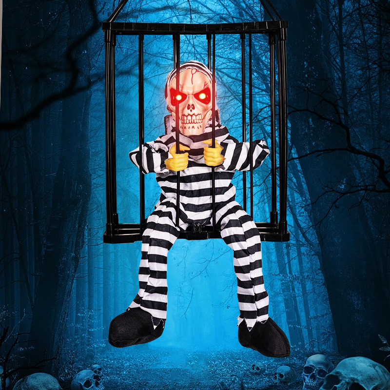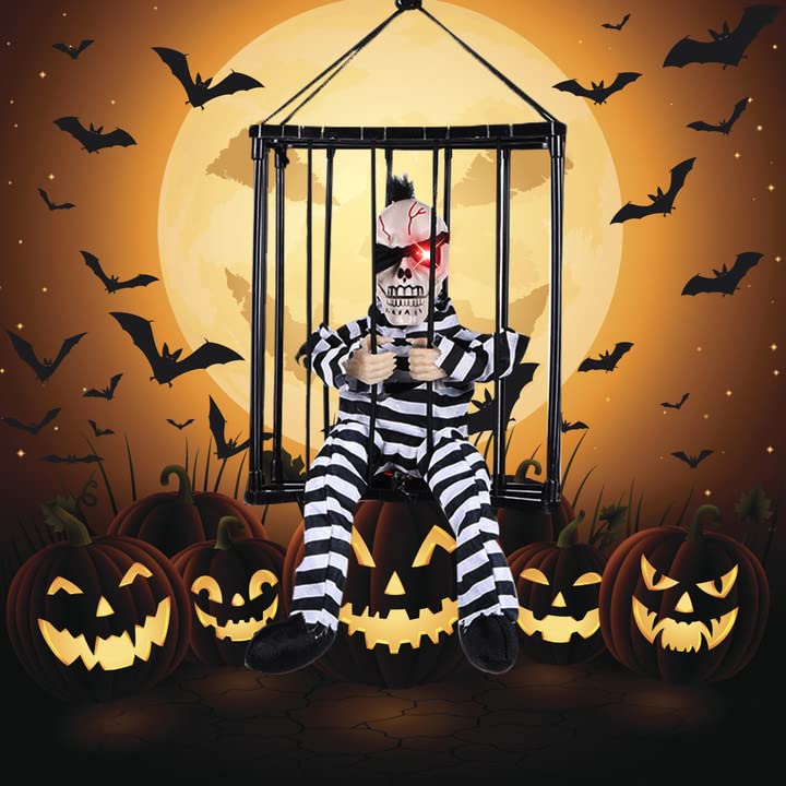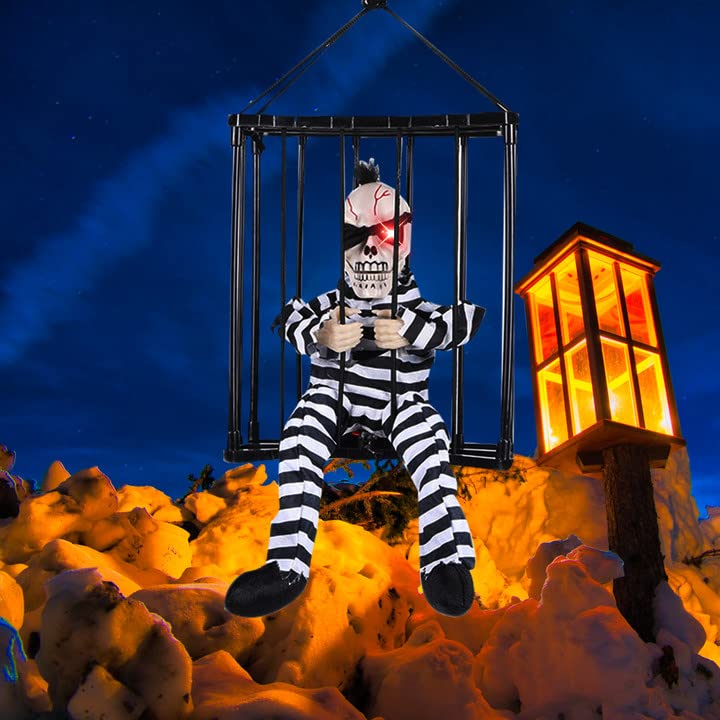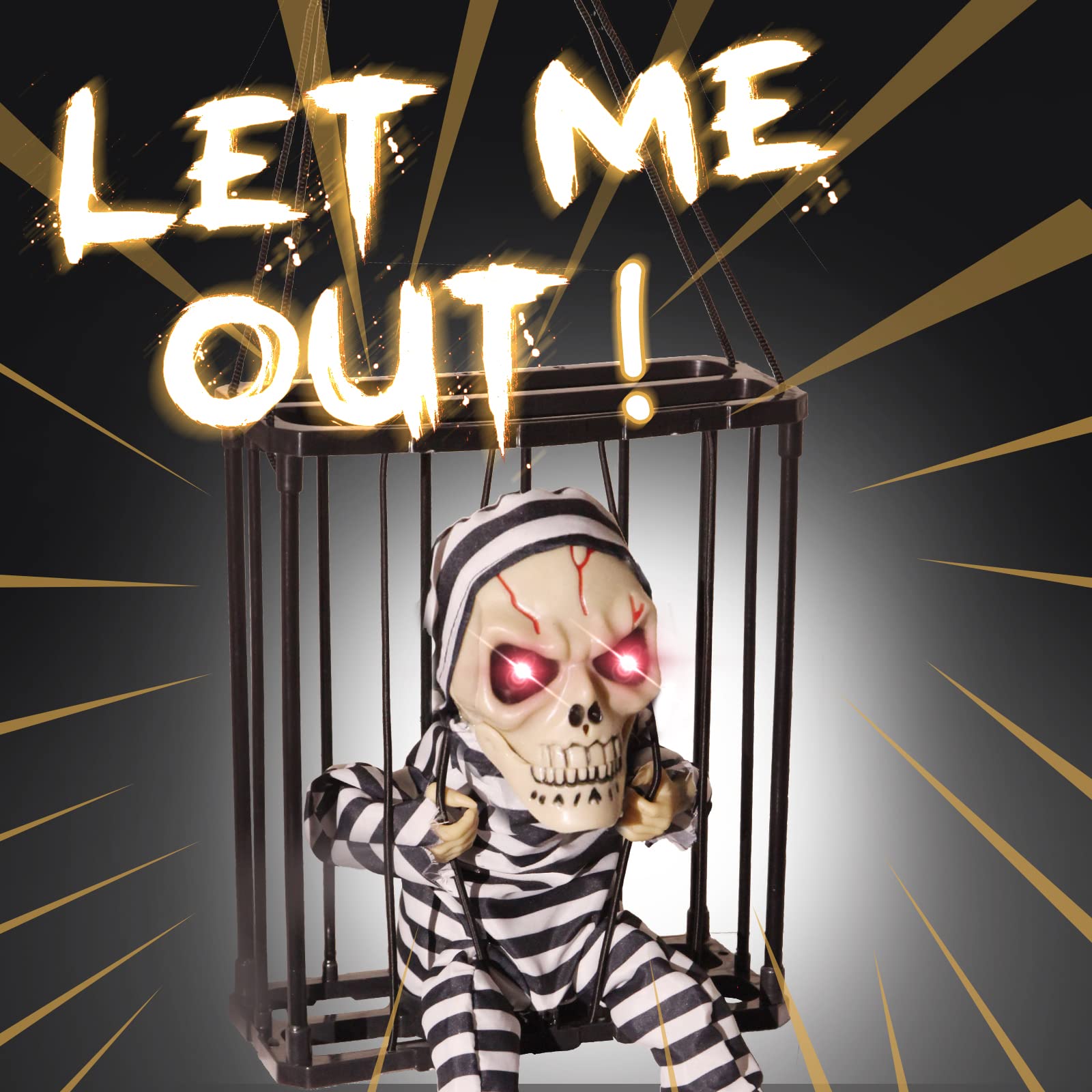 - 🎃 Scary Funny Skull Cage Prisoner: Scary skeleton ghost horror toy in a prison cage screamed ''Let me out!''. When trigger this animated halloween decor, the red eyes caged prisoner will reach his head out while screaming' let me out'. And it will definitely give a spook factor to your Halloween party decor.