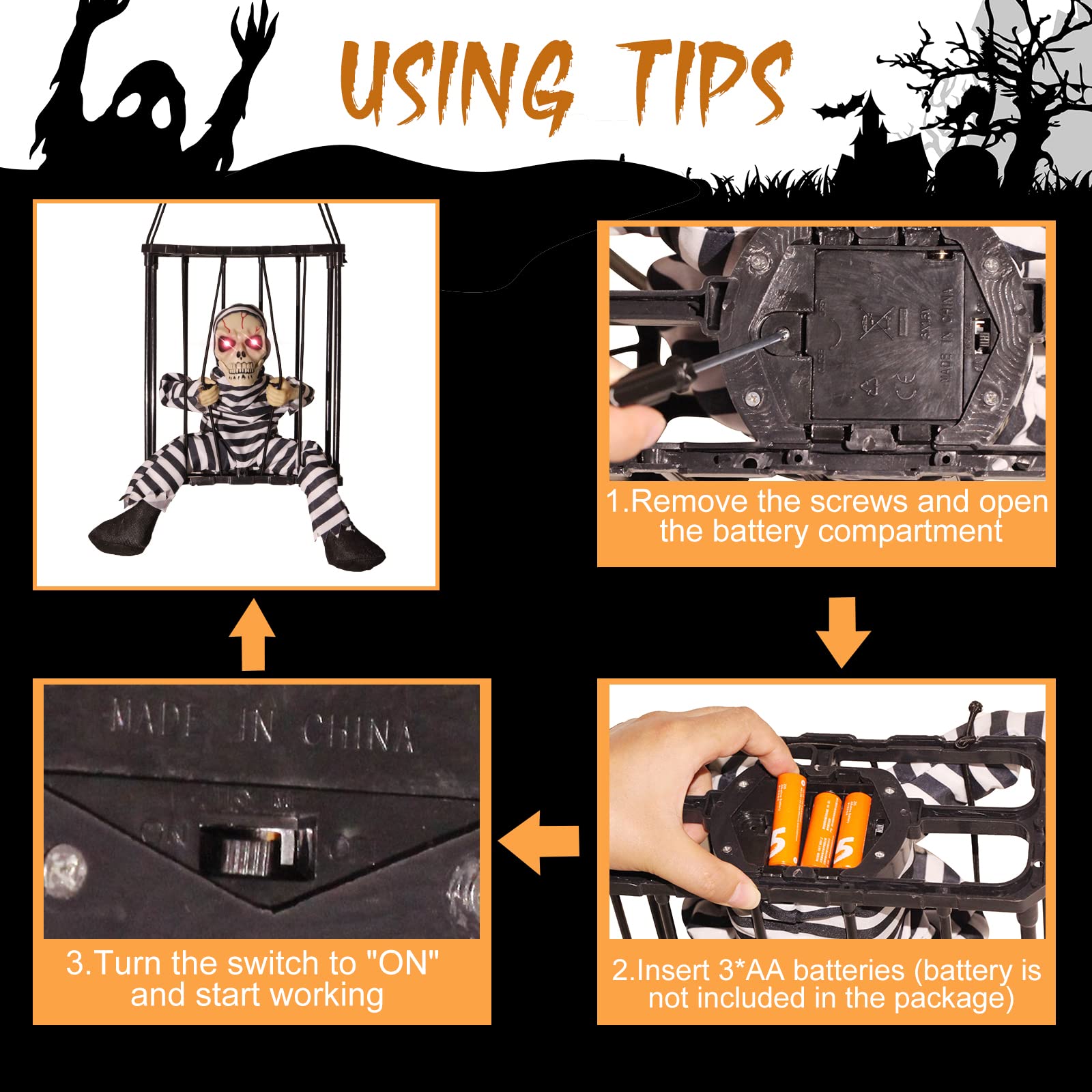 - 👻 Motion Sensor and Light Sensor: The skeleton halloween cage ghost has flexible sensors. When someone going through in front of the prisoner will activate the sensor and the prisoner starts to scream.Note: Please don't place it in a completely darkened room. It needs some light to work.