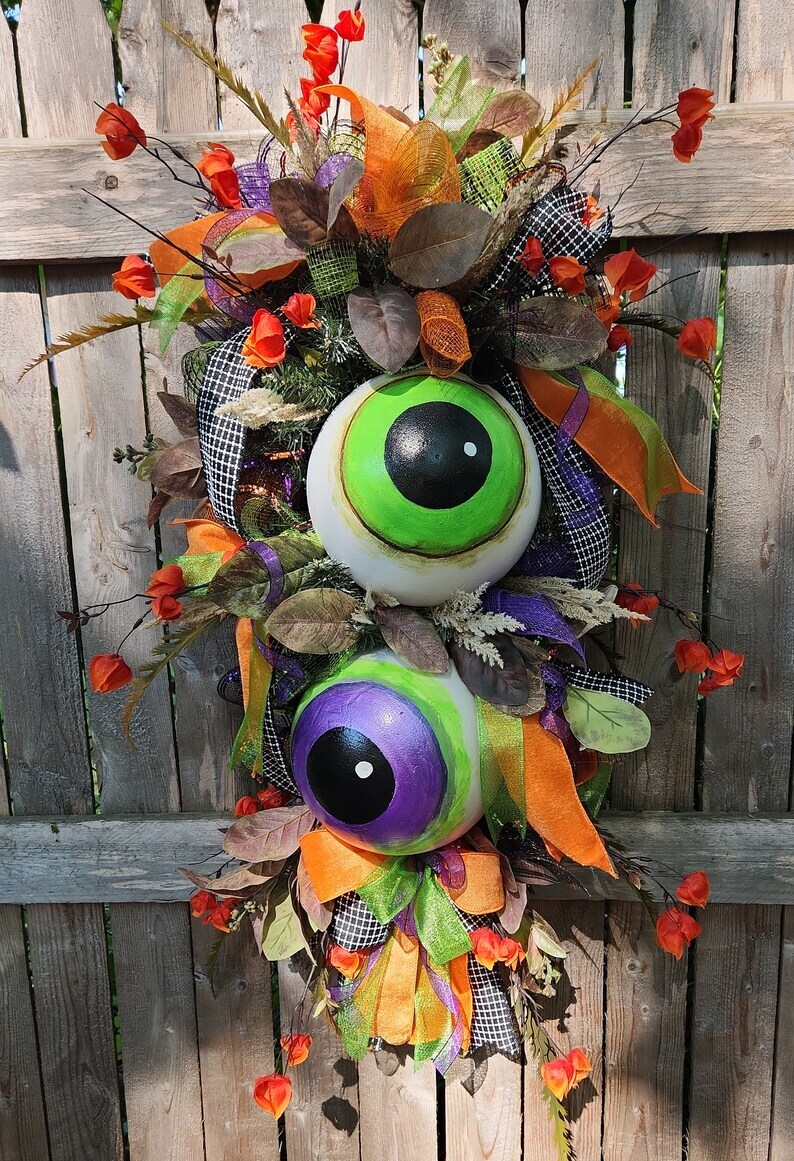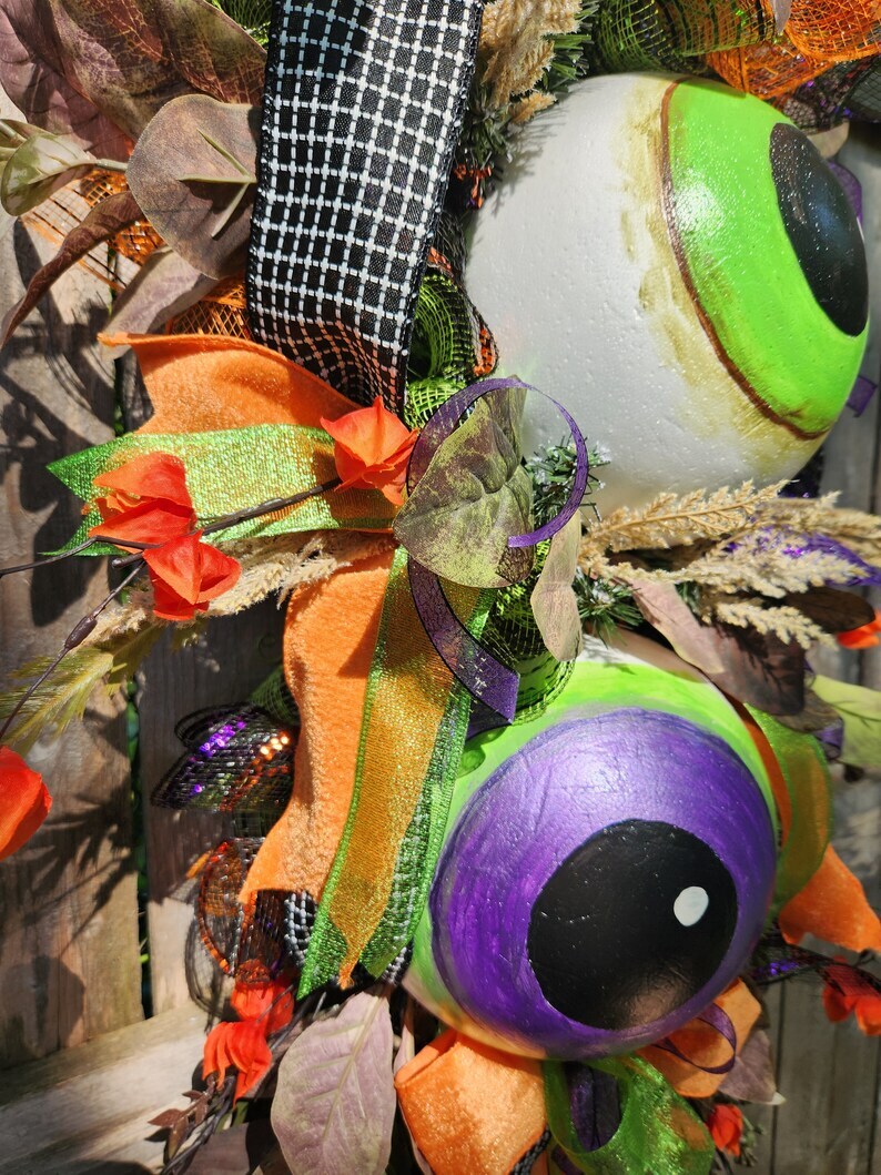 Designed on an evergreen swag. Fluffed up with deco mesh in various Halloween colors. Embellished with hand painted Styrofoam eyes, deluxe black and white striped wired ribbon, deluxe orange wired ribbon, deluxe purple wired ribbon. Filled in with various greenery and florals.This deluxe beauty will add a unique, spooky flair to your Halloween/Fall decor!