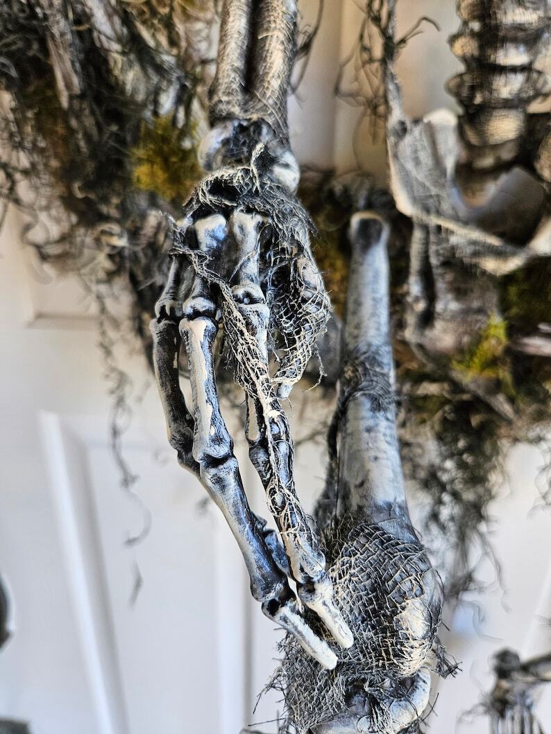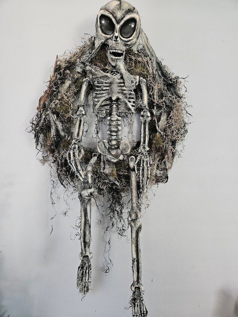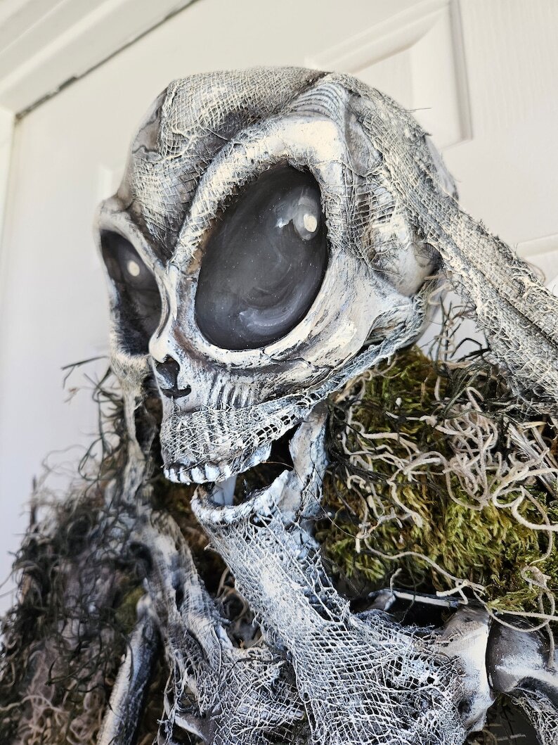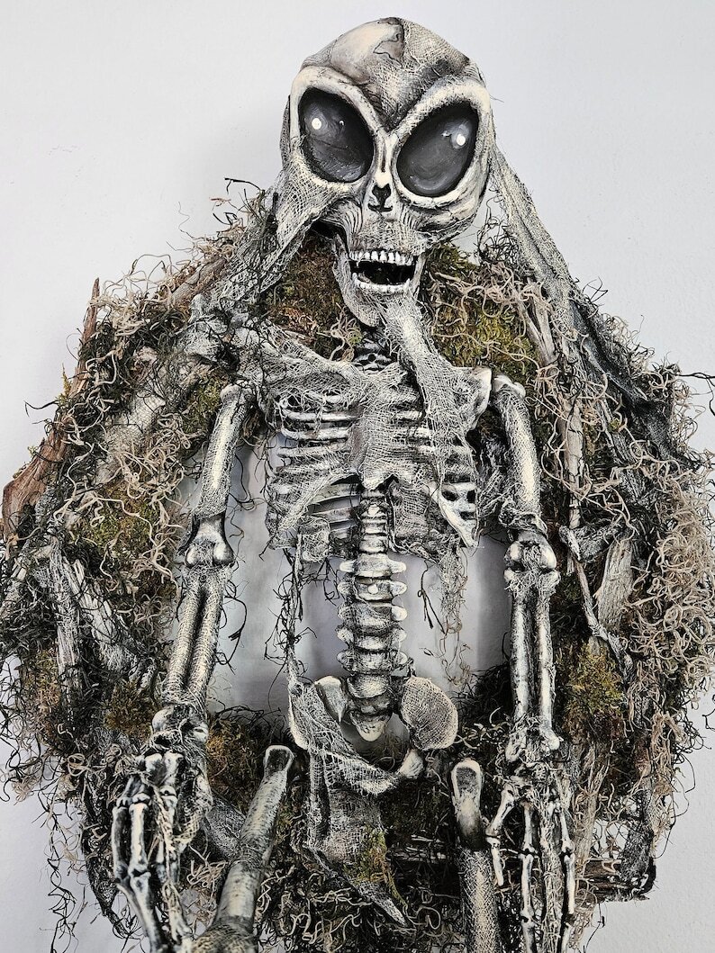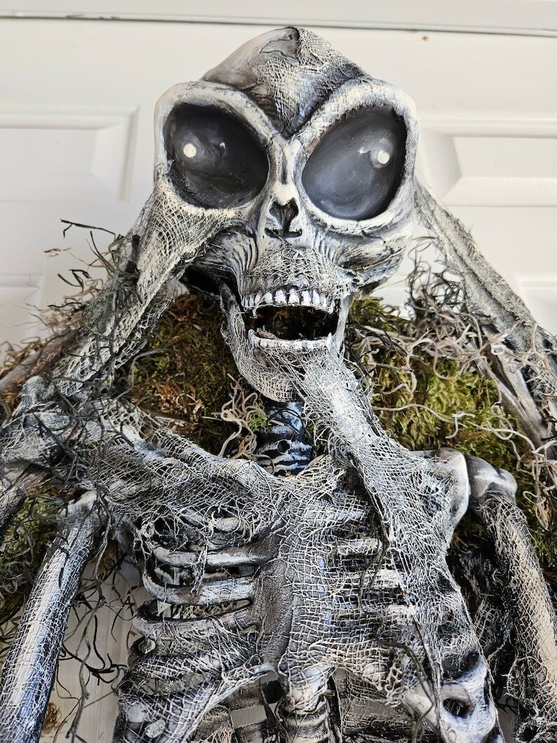 Get ready to amp up the scare factor with this spine-chilling Halloween-themed Alien Skeleton Wreath!This handcrafted masterpiece is made with preserved moss, paint, wood, gauze, and a straw base that will endure season after season.It's perfect for both indoor and covered outdoor decor. With its Alien Skeleton design, it's the perfect embodiment of eerie Halloween vibes, creating a seriously terrifying scene.