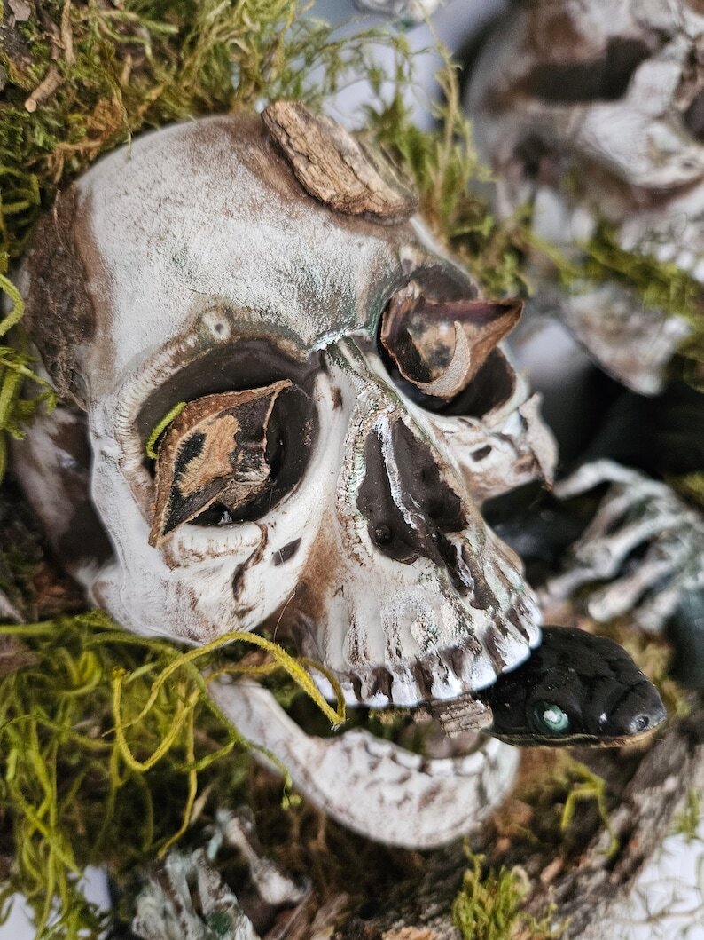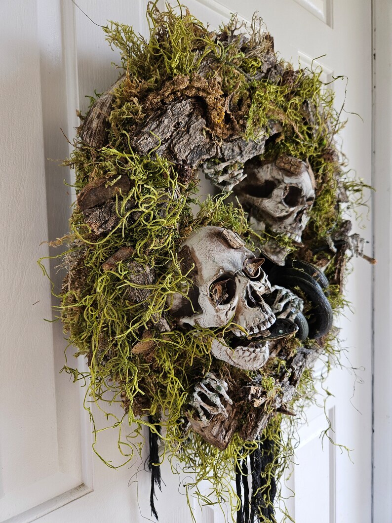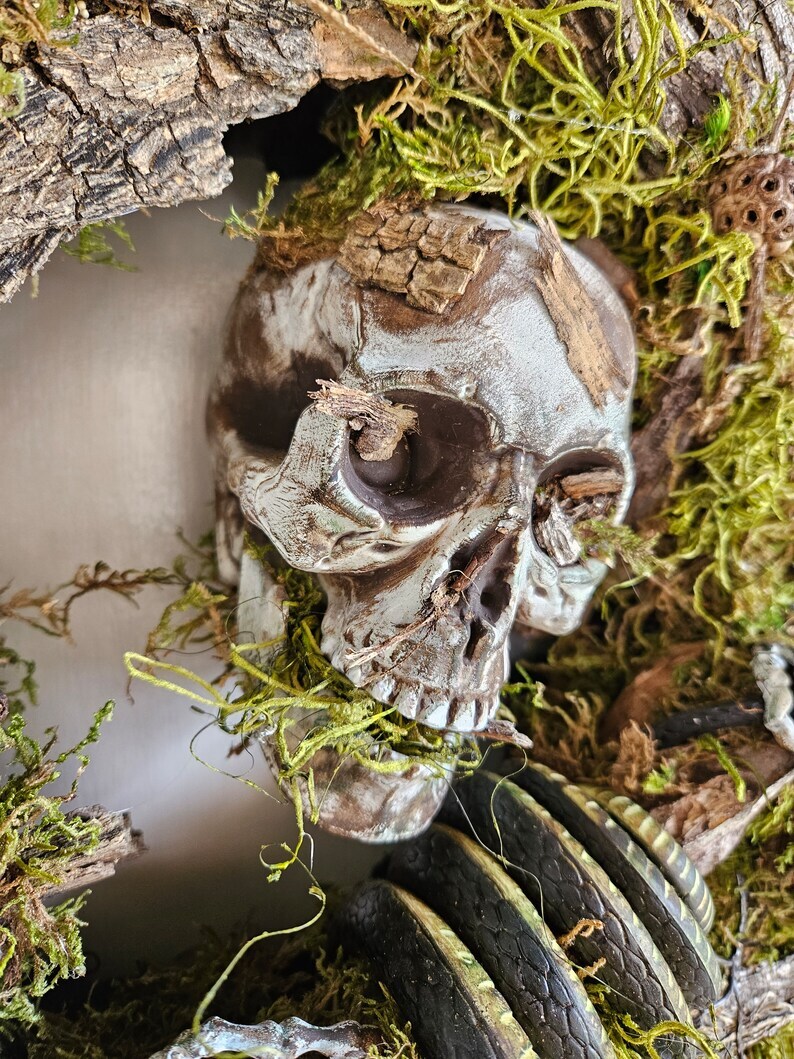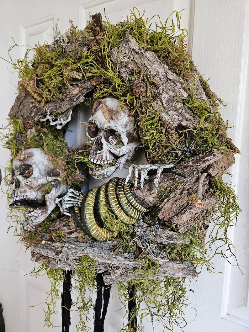 Horror skull wreath!!Emerging from the earth full of horror feeling the snake through his mouth!!Perfect addition to your Halloween or horror decor!Hand painted the skulls to make them distressed and more scary!