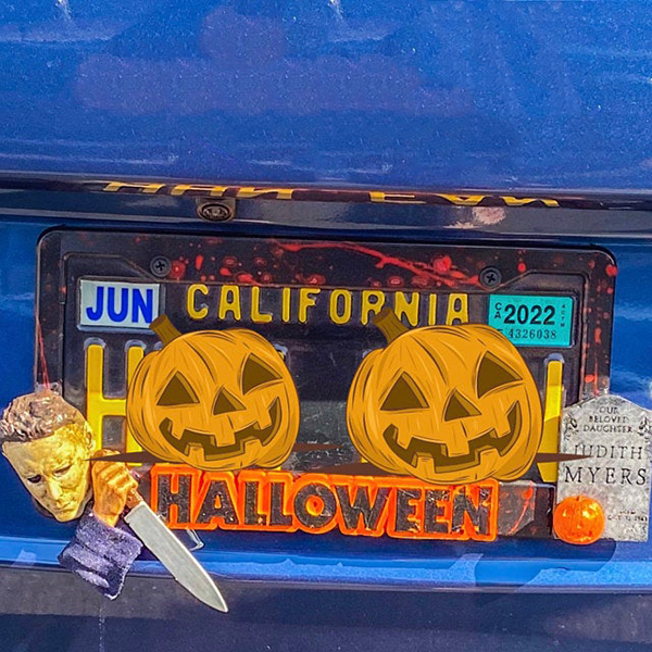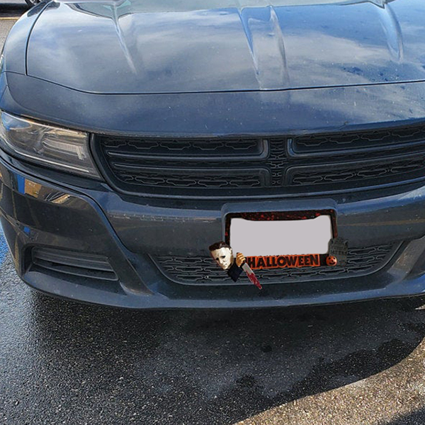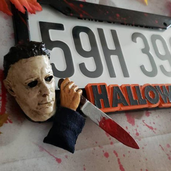 Halloween license plate frame featuring Michael Myers design, bloody knife and custom arm sleeves, and a 1978 pumpkin with Judith Myers' tombstone.