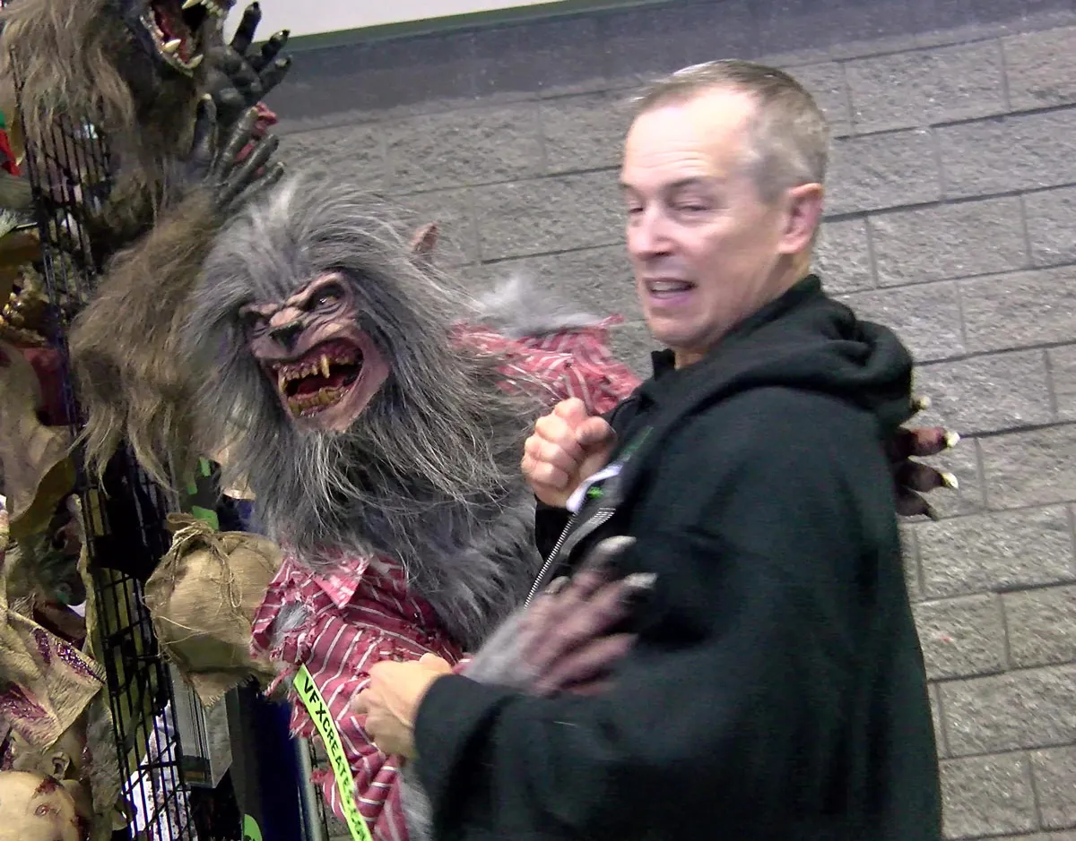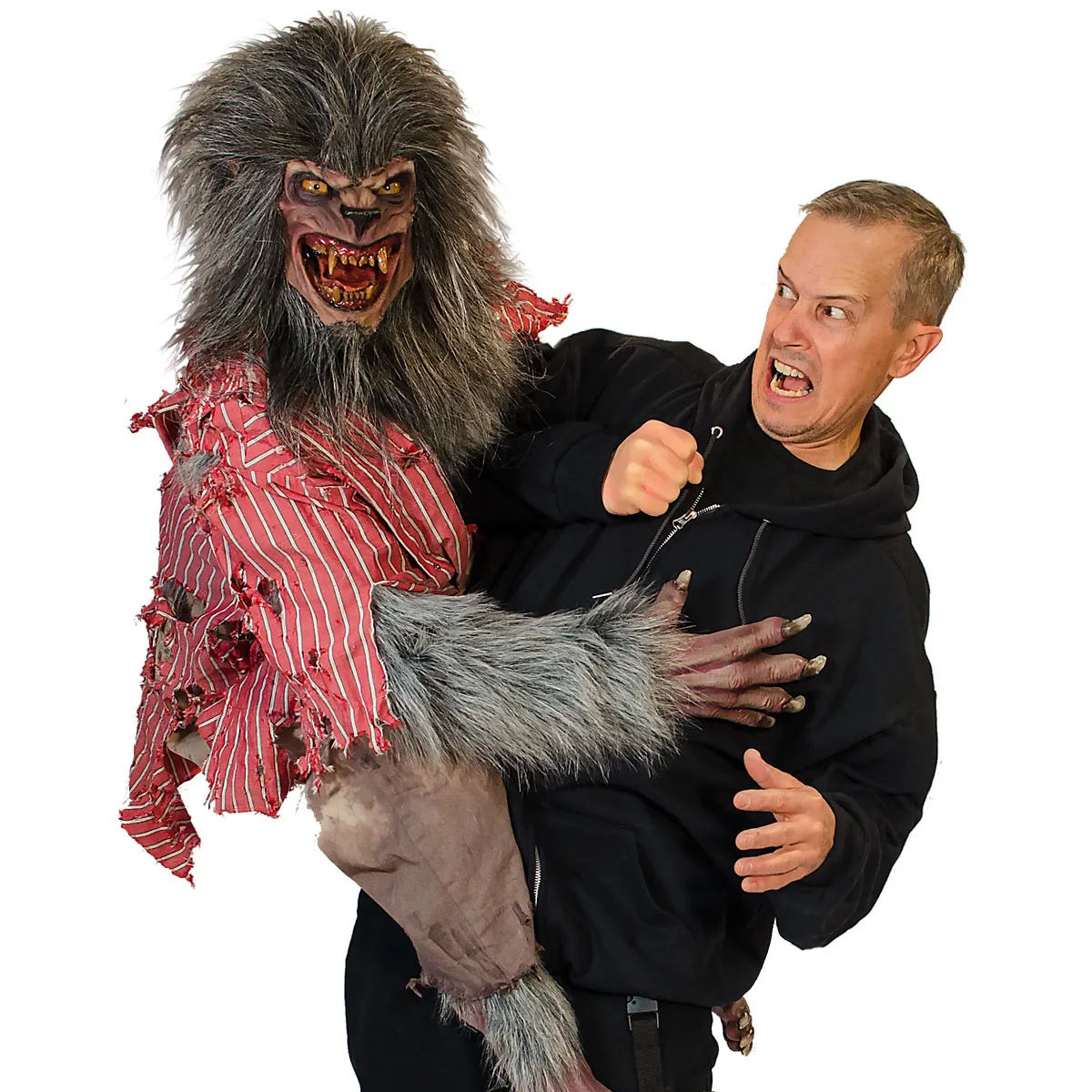 Diabolus the devil puppet is dressed in a dark priest costume with red trim. He is highly detailed with red, gripping hands, devilish hooves for feet and fur legs. Diabolus the demon puppet fits perfectly in a Halloween haunt attraction or wandering the streets entertaining and scaring up more business! This demon or devil puppet comes with all the amazing features as our Attack Line Puppets including a 2XL hoodie/harness that his hands attach to for that just grabbed you look.