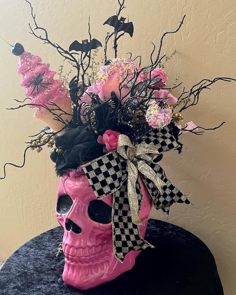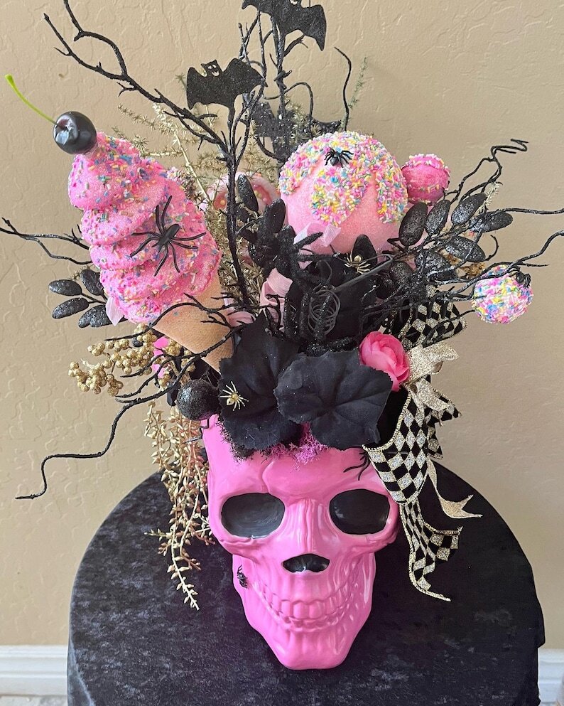 Pink skull centerpiece! Perfect for a spooky Halloween. Filled with sweets, bats, spiders and more! With a touch of gold, this design pulls together so well!