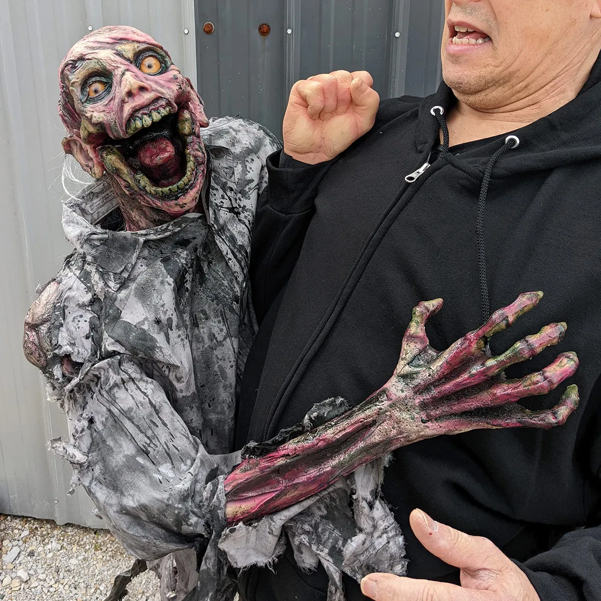 This guy is sporting not only dangling guts but an exposed spine and shoulder, as well as rotting hands. We've added X-ROTT, which is extra grunged and tattered for that, 'He's been around for a while.' look. He looks like he is climbing up your side.