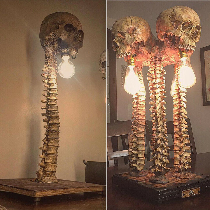 💀Use this dark alternative lamp to illuminate your room. Curved upward from the black base, the stem of this skeleton lamp is a spine, and the vertebrae are curled to the top of the bulb.