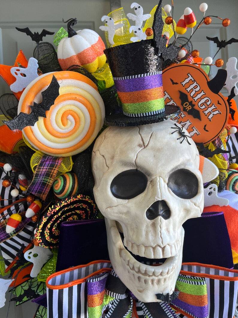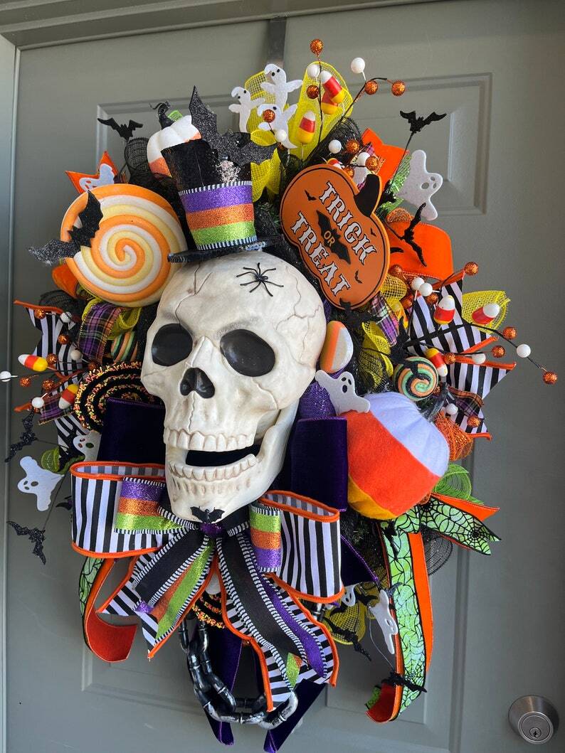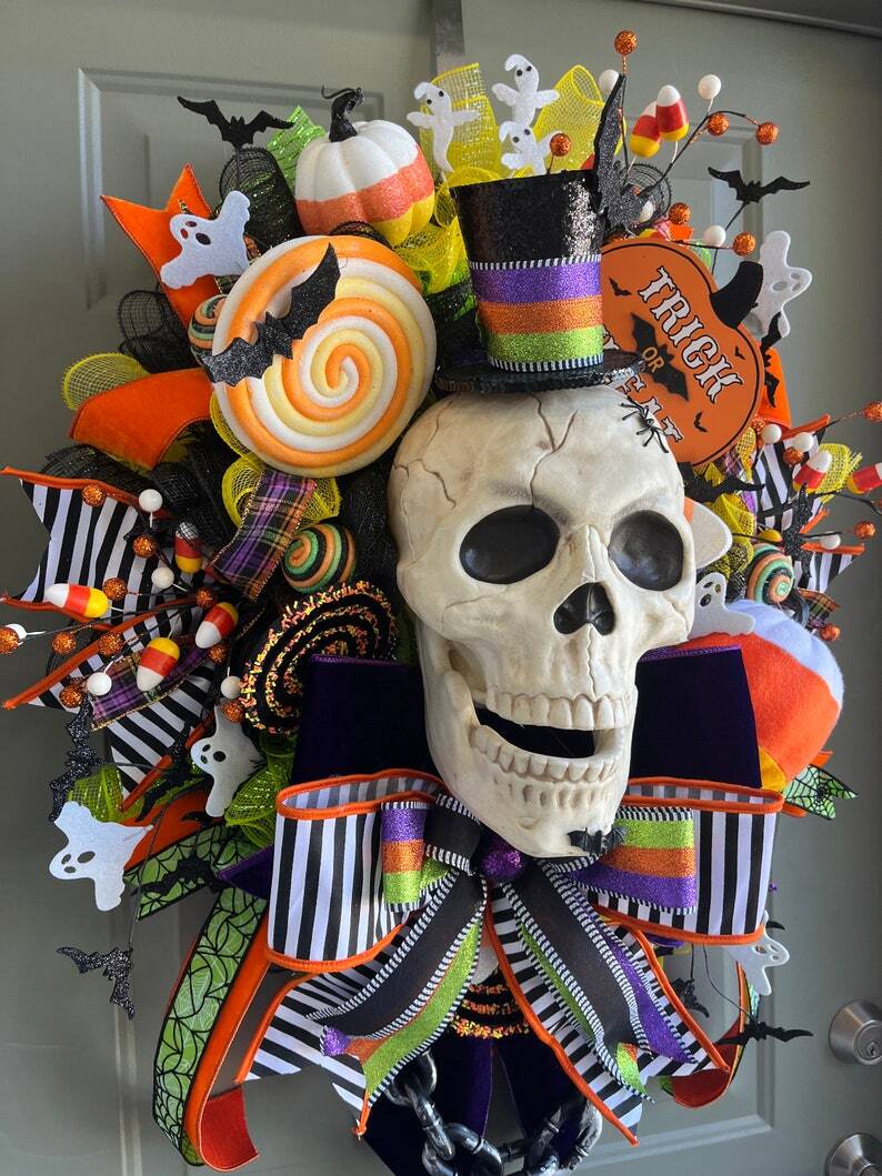 Super cool whimsical skull wreath! Filled with all the Halloween sweets! He’s just perfect!