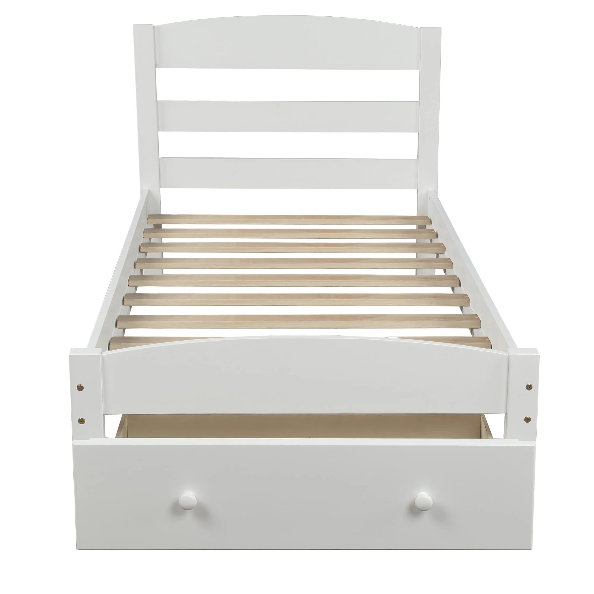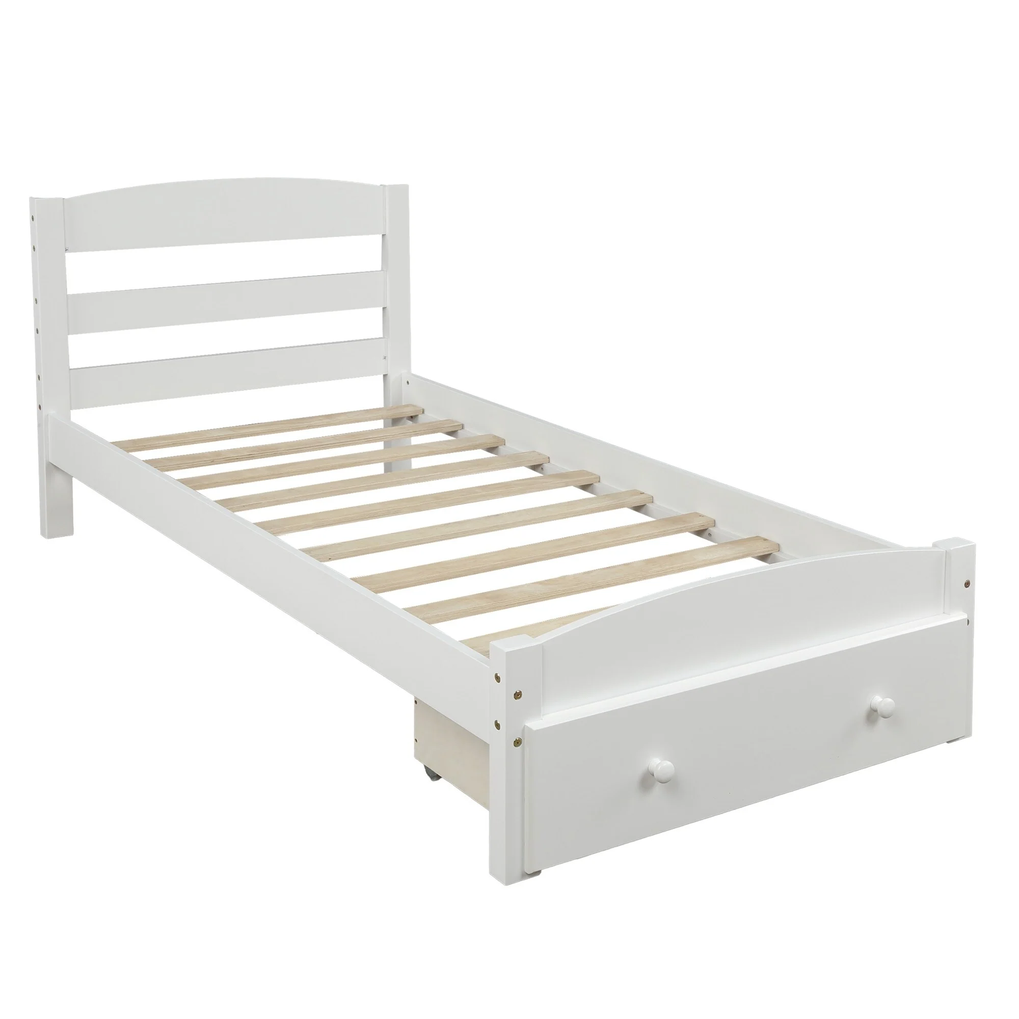 Elevate your bedroom with the Twin Size Wood Platform Bed featuring a spacious under-bed storage drawer and a beautiful, classic design. This bed is made from solid pine wood with built-in wood slat support to ensure durability and stability. The curved headboard and footboard add a touch of elegance, while the extra drawer offers practical storage space for organizing linens, pillows, or toys. With no need for a box spring, this platform bed is easy to assemble and perfect for any room.